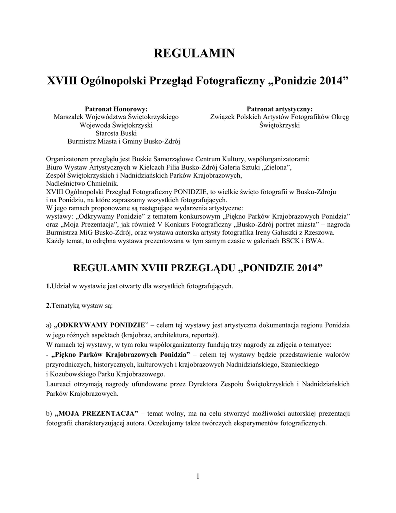 REGULAMIN XVIII Ogólnopolski Przegląd Fotograficzny „Ponidzie 2014” Patronat Honorowy: Marszałek Województwa Świętokrzyskiego Wojewoda Świętokrzyski Starosta Buski Burmistrz Miasta i Gminy Busko-Zdrój Patronat artystyczny: Związek Polskich Artystów Fotografików Okręg Świętokrzyski Organizatorem przeglądu jest Buskie Samorządowe Centrum Kultury, współorganizatorami: Biuro Wystaw Artystycznych w Kielcach Filia Busko-Zdrój Galeria Sztuki „Zielona”, Zespół Świętokrzyskich i Nadnidziańskich Parków Krajobrazowych, Nadleśnictwo Chmielnik. XVIII Ogólnopolski Przegląd Fotograficzny PONIDZIE, to wielkie święto fotografii w Busku-Zdroju i na Ponidziu, na które zapraszamy wszystkich fotografujących. W jego ramach proponowane są następujące wydarzenia artystyczne: wystawy: „Odkrywamy Ponidzie” z tematem konkursowym „Piękno Parków Krajobrazowych Ponidzia” oraz „Moja Prezentacja”, jak również V Konkurs Fotograficzny „Busko-Zdrój portret miasta” – nagroda Burmistrza MiG Busko-Zdrój, oraz wystawa autorska artysty fotografika Ireny Gałuszki z Rzeszowa. Każdy temat, to odrębna wystawa prezentowana w tym samym czasie w galeriach BSCK i BWA. REGULAMIN XVIII PRZEGLĄDU „PONIDZIE 2014” 1.Udział w wystawie jest otwarty dla wszystkich fotografujących. 2.Tematyką wystaw są: a) „ODKRYWAMY PONIDZIE” – celem tej wystawy jest artystyczna dokumentacja regionu Ponidzia w jego różnych aspektach (krajobraz, architektura, reportaż). W ramach tej wystawy, w tym roku współorganizatorzy fundują trzy nagrody za zdjęcia o tematyce: - „Piękno Parków Krajobrazowych Ponidzia” – celem tej wystawy będzie przedstawienie walorów przyrodniczych, historycznych, kulturowych i krajobrazowych Nadnidziańskiego, Szanieckiego i Kozubowskiego Parku Krajobrazowego. Laureaci otrzymają nagrody ufundowane przez Dyrektora Zespołu Świętokrzyskich i Nadnidziańskich Parków Krajobrazowych. b) „MOJA PREZENTACJA” – temat wolny, ma na celu stworzyć możliwości autorskiej prezentacji fotografii charakteryzującej autora. Oczekujemy także twórczych eksperymentów fotograficznych. 1 3. Uczestnik ma prawo do przesłania prac związanych z dowolna ilością tematów. 4. Prace fotograficzne w dowolnej technice formatu minimum 20x30 cm. Ilość prac 3-6 w jednym temacie. Obowiązkowo prosimy o dostarczanie CD z nadesłanymi zdjęciami, co ułatwi przygotowanie katalogu wystawy. 5. Prace powinny być podpisane na odwrocie: temat („Odkrywamy Ponidzie”, „Piękno Parków Krajobrazowych Ponidzia”, „Moja prezentacja”), imię i nazwisko autora z adresem i kontaktem (komórka, e-mail). 6. Nadsyłanie lub dostarczanie prac w nieprzekraczalnym terminie do 15 października 2014 roku na adres: BWA – Galeria Zielona, Al. Mickiewicza 7, 28-100 Busko-Zdrój 7. Wystawy prezentowane będą w Buskim Samorządowym Centrum Kultury: Galeria „U Źródeł”, Galeria „Antresola”, Galeria BWA „Zielona” w Busku-Zdroju, w miesiącach grudzień 2014/styczeń 2015. 8. Przewiduje się możliwość prezentacji wystawy w siedzibie Zespołu Świętokrzyskich i Nadnidziańskich Parków w Krzyżanowicach Średnich, w siedzibie Nadleśnictwa Chmielnik i innych placówkach. 9. Organizatorzy zastrzegają sobie prawo do bezpłatnego publikowania nadesłanych prac w związku z wystawami i planowanym wydawnictwem. 10. Organizatorzy zastrzegają sobie prawo do wyboru prac, które będą reprezentowane na wystawie. 11. Autorzy biorący udział w wystawie otrzymają podczas wernisażu katalog wystawy. 12.Wszystkie prace będą traktowane z największą starannością. Organizatorzy nie biorą odpowiedzialności za ewentualne zniszczenia lub zaginięcia prac. 13. Nagrodzone zdjęcia dotyczące tematu „Piękno Parków Krajobrazowych Ponidzia” przechodzą na własność Organizatorów, z możliwością ich wykorzystania do różnych publikacji z zachowaniem praw autorskich. 14. Zwrot prac nastąpi po ekspozycjach wystawy (w siedzibie BWA „Zielona” lub do uzgodnienia). 15. Udział w wystawie stanowi wyrażenie zgody na warunki określone przez Organizatorów wystawy. Informacji udziela komisarz wystawy: Piotr Kaleta, nr tel. kom. 603 381 182, www.bsck.busko.pl Informacji związanej z tematyką Parków Krajobrazowych udziela: Anna Chwalik-Borowiec, nr tel. 041 357 17 11, www.pk.kielce.pl 2 V Konkurs fotograficzny na zdjęcie roku: „BUSKO-ZDRÓJ PORTRET MIASTA” Patronat Honorowy: Waldemar Sikora - Burmistrz MiG Busko-Zdrój Organizator konkursu: Urząd Miasta i Gminy Busko-Zdrój Komisarz konkursu i wystawy: Piotr Kaleta Organizatorzy i współorganizatorzy Ogólnopolskiego Przeglądu Fotograficznego „PONIDZIE” zapraszają wszystkich fotografujących do udziału w V konkursie fotograficznym na zdjęcie roku pod hasłem „Busko-Zdrój portret miasta”. Zapraszamy do udziału w konkursie mieszkańców miasta, młodzież oraz przyjeżdżających kuracjuszy i turystów. Celem konkursu jest uwiecznienie w fotografii piękna i walorów Buska-Zdroju oraz życia jego mieszkańców. Zdjęcie Roku będzie po oprawieniu prezentowane przez cały rok w nobilitowanym miejscu UMiG Busko-Zdrój. Kolejne edycje konkursu pozwolą organizatorom na stworzenie kolekcji fotograficznego portretu miasta. REGULAMIN 1. Udział w wystawie jest otwarty dla wszystkich fotografujących. 2. Tematyka zdjęć związana z szeroko pojętym pięknem miasta i uzdrowiska dotyczącym krajobrazu, architektury i jego mieszkańców. 3. Prace fotograficzne w dowolnej technice w ilości 1-5 sztuk, o wymiarach minimum 20x30 cm. Obowiązkowo z dołączoną płytą CD z nadesłanymi zdjęciami o rozdzielczości 300 DPI 4. Prace powinny być podpisane na odwrocie: konkurs „Busko-Zdrój portret miasta”, imię i nazwisko autora, adres, telefon, e-mail, i ewentualnie tytuł pracy. 5. Nadsyłanie lub dostarczanie prac na konkurs w nieprzekraczalnym terminie do 15 października 2014 roku na adres: B
