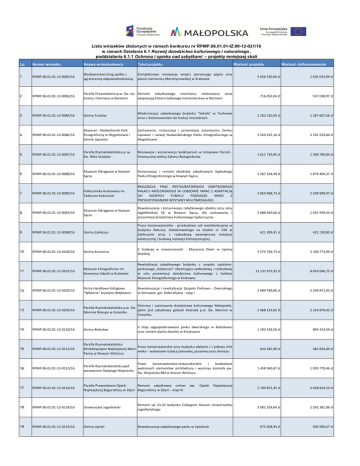 Lista wniosków złożonych w ramach konkursu nr RPMP.06.01.01-IZ.00-12-021/16 w ramach Działania 6.1 Rozwój dziedzictwa kulturowego i naturalnego , poddziałania 6.1.1 Ochrona i opieka nad zabytkami – projekty mniejszej skali Lp. Numer wniosku Nazwa wnioskodawcy Tytuł projektu Wartość projektu 1 RPMP.06.01.01-12-0060/16 Wydawnictwo Greg spółka z ograniczoną odpowiedzialnością Kompleksowa renowacja wnętrz pierwszego piętra oraz piwnic Kamienicy Morsztynowskiej w Krakowie 3 656 530,06 zł 1 635 033,69 zł 2 RPMP.06.01.01-12-0082/16 Parafia Prawosławna p.w. Św. św. Remont zabytkowego cmentarza realizowany wraz Kosmy i Damiana w Bartnem ekspozycją historii ludowego kamieniarstwa w Bartnem 716 052,04 zł 537 038,97 zł 3 RPMP.06.01.01-12-0084/16 Gmina Tuchów Modernizacja zabytkowego budynku "Sokoła" w Tuchowie wraz z dostosowaniem do funkcji muzealnych 2 262 510,50 zł 1 287 607,56 zł 4 RPMP.06.01.01-12-0086/16 Muzeum - Nadwiślanski Park Etnograficzny w Wygiełzowie i Zamek Lipowiec Zachowanie, restauracja i prezentacja autentyzmu Zamku Lipowiec i rozwój Nadwiślańskiego Parku Etnograficznego w Wygiełzowie 3 554 525,16 zł 2 191 559,60 zł 5 RPMP.06.01.01-12-0087/16 Parafia Rzymskokatolicka p. w. Św. Wita Uniejów Renowacja i konserwacja Sanktuarium w Uniejowie Parceli historycznej stolicy Zakonu Bożogrobców. 1 611 719,85 zł 1 208 789,84 zł 6 RPMP.06.01.01-12-0088/16 Muzeum Okręgowe w Nowym Sączu Konserwacja i remont obiektów zabytkowych Sądeckiego Parku Etnograficznego w Nowym Sączu 3 267 334,98 zł 1 874 404,37 zł 7 RPMP.06.01.01-12-0090/16 Politechnika Krakowska im. Tadeusza Kościuszki REALIZACJA PRAC RESTAURATORSKICH ZABYTKOWEGO PAŁACU KRÓLEWSKIEGO W ŁOBZOWIE WRAZ Z ADAPTACJĄ DO NOWYCH FUNKCJI PODDASZA WRAZ Z PRZYGOTOWANIEM WYSTAWY MULTIMEDIALNEJ. 3 054 968,72 zł 2 249 999,97 zł 8 RPMP.06.01.01-12-0093/16 Muzeum Okręgowe w Nowym Sączu Rewaloryzacja i konserwacja zabytkowego obiektu przy ulicy Jagiellońskiej 56 w Nowym Sączu, dla zachowania i prezentacji dziedzictwa kulturowego Sądecczyzny 3 886 910,66 zł 1 031 599,33 zł 9 RPMP.06.01.01-12-0098/16 Gmina Zakliczyn Prace konserwatorskie - przebudowa sali wielofunkcyjnej w budynku Ratusza, zlokalizowanego na działce nr 228 w Zakliczynie wraz z rozbudową wewnętrznej instalacji elektrycznej i budową instalacji klimatyzacyjnej. 621 399,41 zł 422 230,80 zł 10 RPMP.06.01.01-12-0100/16 Gmina Korzenna Z tradycją w nowoczesność - Muzyczny Dwór w Lipnicy Wielkiej 3 575 756,73 zł 2 190 773,99 zł 11 RPMP.06.01.01-12-0101/16 Muzeum Etnograficzne im. Seweryna Udzieli w Krakowie Rewitalizacja zabytkowego budynku z zespołu szpitalnoparkowego „Kobierzyn” obejmująca nadbudowę i rozbudowę w celu prezentacji dziedzictwa kulturowego z kolekcji Muzeum Etnograficznego w Krakowie. 13 137 672,92 zł 8 024 046,75 zł 12 RPMP.06.01.01-12-0103/16 Firma Handlowo-Usługowa "Wiktoria" Krystyna Wójtowicz Rewaloryzacja i rewitalizacja Zespołu Parkowo - Dworskiego w Sieniawie, gm. Raba Wyżna - etap I 3 689 790,00 zł 2 249 871,93 zł 13 RPMP.06.01.01-12-0105/16 Ochrona i zachowanie dziedzictwa kulturowego Małopolski, Parafia Rzymskokatolicka p.w. Św. jakim jest zabytkowy gotycki Kościoła p.w. Św. Marcina w Marcina Biskupa w Gnojniku Gnojniku. 2 968 132,02 zł 2 224 879,43 zł 14 RPMP.06.01.01-12-0110/16 Gmina Bolesław II etap zagospodarowania parku dworskiego w Bolesławiu oraz remont dachu dworku w Krzykawce 1 192 419,56 zł 894 314,59 zł 15 RPMP.06.01.01-12-0112/16 Parafia Rzymskokatolicka Prace konserwatorskie przy budynku plebanii z I połowy XVII Wniebowzięcia Najświętszej Marii wieku - wykonanie izolacji pionowej, poziomej oraz drenażu. Panny w Nowym Wiśniczu 642 445,90 zł 481 834,40 zł 16 RPMP.06.01.01-12-0113/16 Parafia Rzymskokatolicka pod wezwaniem Świętego Wojciecha Prace konserwatorsko-restauratorskie i budowlane wybranych elementów architektury i wystroju kościoła pw. Św. Wojciecha BM w Starym Wiśniczu 1 458 360,67 zł 1 093 770,46 zł 17 RPMP.06.01.01-12-0116/16 Parafia Prawosławna Opieki Remont zabytkowej cerkwi Najświętszej Bogurodzicy w Zdyni Bogurodzicy w Zdyni – etap III. 2 704 872,45 zł 2 028 654,29 zł 18 RPMP.06.01.01-12-0118/16 Uniwersytet Jagielloński Remont sal 13-22 budynku Collegium Novum Uniwersytetu Jagiellońskiego 3 001 529,04 zł 2 242 381,06 zł 19 RPMP.06.01.01-12-0119/16 Gmina Lipinki Rewaloryzacja zabytkowego parku w Lipinkach 673 208,94 zł 504 906,67 zł pw. Opieki Najświętszej Wartość dofinansowania Lp. Numer wniosku Nazwa wnioskodawcy Tytuł projektu Wartość projektu Wartość dofinansowania 20 RPMP.06.01.01-12-0120/16 Parafia Prawosławna pw. Św. Apostoła Łukasza w Kunkowej Remont zabytkowej cerkwi pw. Św. Apostoła Łukasza w Kunkowej wraz z wyposażeniem – etap III 2 812 476,76 zł 2 109 357,51 zł 21 RPMP.06.01.01-12-0121/16 Parafia Św. Kazimierza w Rybnej Odnowa wyposażeniai wnętrza Kościoła Parafialnego Św. Kazimierza w Rybnej 975 867,24 zł 731 900,41 zł 22 RPMP.06.01.01-12-0125/16 OFTALDENT TADEUSZ ŁABNO SPÓŁKA JAWNA Rewitalizacja i zagospodarowanie na cele kulturalnoturystyczne zabytkowego dworku wraz z parkiem w miejscowości Burzyn. 1 714 001,01 zł 855 592,86 zł 23 RPMP.06.01.01-12-0127/16 Gmina Drwinia Góra św. Jana w Mikluszowicach – kompleksowy produkt dziedzictwa kulturowego 1 705 345,80 zł 1 279 009,35 zł 24 RPMP.06.01.01-12-0128/16 Parafia Rzymskokatolicka p.w. Jana Chrzciciela w Radłowie Przebudowa budynku zabytkowej plebanii ze zmianą sposobu użytkowania części pomieszczeń na cele społeczno-kulturalne 1 781 455,34 zł 1 336 091,49 zł 25 RPMP.06.01.01-12-0131/16 Gmina Nowy Wiśnicz Ożywienie kulturalne Ratusza w Nowym Wiśniczu z okazji 400 lecia miasta- multimedialne,innowacyjne muzeum 1 158 660,00 zł 868 994,99 zł 26 RPMP.06.01.01-12-0132/16 Powiat Wielicki Centrum Społeczno-Kulturalne "Daniłowicza 12" 3 483 249,59 zł 2 123 932,66 zł 3 514 392,90 zł 2 000 061,00 zł 27 R