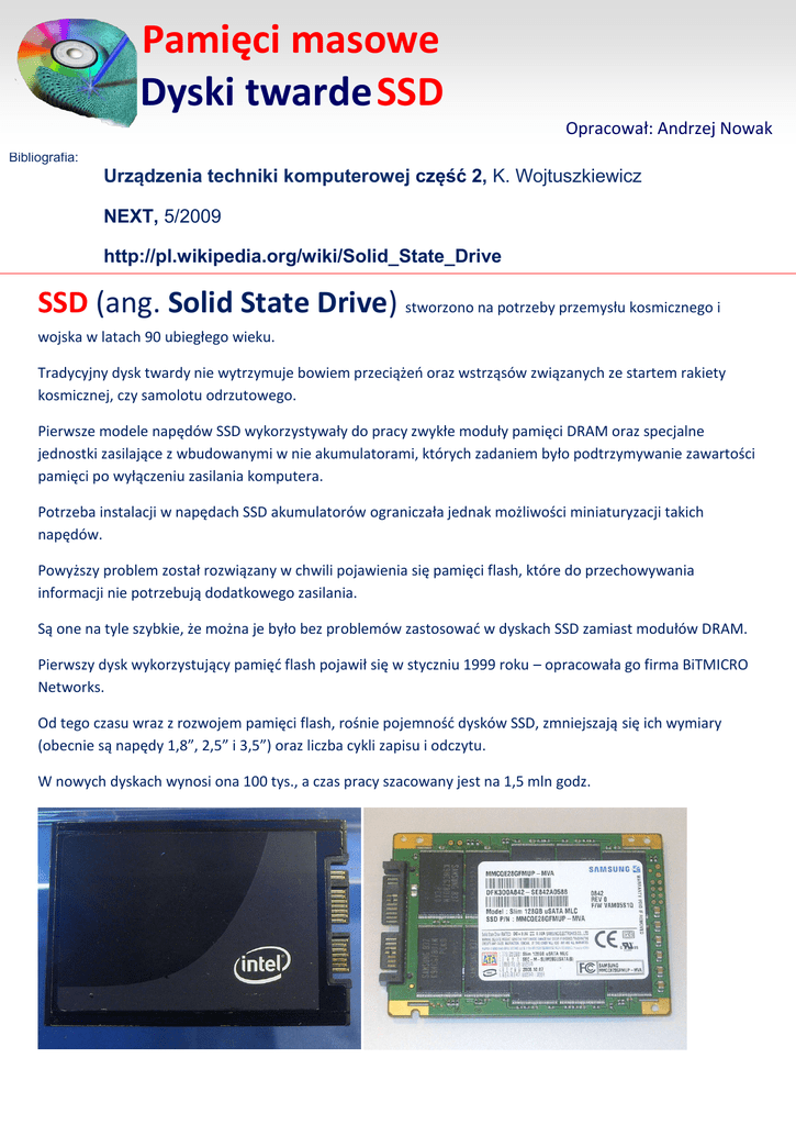 Pamięci masowe Dyski twarde SSD Opracował: Andrzej Nowak Bibliografia: Urządzenia techniki komputerowej część 2, K. Wojtuszkiewicz NEXT, 5/2009 http://pl.wikipedia.org/wiki/Solid_State_Drive SSD (ang. Solid State Drive) stworzono na potrzeby przemysłu kosmicznego i wojska w latach 90 ubiegłego wieku. Tradycyjny dysk twardy nie wytrzymuje bowiem przeciążeń oraz wstrząsów związanych ze startem rakiety kosmicznej, czy samolotu odrzutowego. Pierwsze modele napędów SSD wykorzystywały do pracy zwykłe moduły pamięci DRAM oraz specjalne jednostki zasilające z wbudowanymi w nie akumulatorami, których zadaniem było podtrzymywanie zawartości pamięci po wyłączeniu zasilania komputera. Potrzeba instalacji w napędach SSD akumulatorów ograniczała jednak możliwości miniaturyzacji takich napędów. Powyższy problem został rozwiązany w chwili pojawienia się pamięci flash, które do przechowywania informacji nie potrzebują dodatkowego zasilania. Są one na tyle szybkie, że można je było bez problemów zastosować w dyskach SSD zamiast modułów DRAM. Pierwszy dysk wykorzystujący pamięć flash pojawił się w styczniu 1999 roku – opracowała go firma BiTMICRO Networks. Od tego czasu wraz z rozwojem pamięci flash, rośnie pojemność dysków SSD, zmniejszają się ich wymiary (obecnie są napędy 1,8”, 2,5” i 3,5”) oraz liczba cykli zapisu i odczytu. W nowych dyskach wynosi ona 100 tys., a czas pracy szacowany jest na 1,5 mln godz. Zalety dysków SSD Dyski SSD są całkowicie bezgłośne, zużywają mniej energii (nawet do 60-70 proc.), wydzielają mniej ciepła, mogą pracować w większym zakresie temperatur otoczenia od – 400C do + 800C /tradycyjne tylko od +50C do +550C/ Wady dysków SSD Komórki pamięci NAND nie są wieczne. Charakteryzują się określoną liczbą cykli zapisu, po jej przekroczeniu dane zostają na dysku zapisane na stałe i nie można ich już skasować i w związku z tym zapisywać nowych danych. Układy MLC wytrzymują nie więcej niż 10 tysięcy operacji zapisywania danych. Nie jest to zbyt wiele, jeśli chodzi o system pamięci masowej, dlatego na dyskach SSD stosuje się technologię równomiernego rozsiewania informacji po całej przestrzeni adresowej pamięci flash. Nosi ona nazwę wear levelling. Drugim mechanizmem wykorzystywanym w dyskach SSD jest stosowanie mechanizmów wykrywających uszkodzone bloki pamięci flash. Stosowane algorytmy pozwalają odzyskać dane z takich bloków, a następnie wyłączają je z użytku, zastępując innymi rezerwowymi blokami. Aby było to możliwe, rzeczywista pojemność dysków jest przynajmniej o kilkanaście procent większa niż ta, którą widzi użytkownik – to są właśnie zapasowe komórki. Im jest ich więcej, tym dłużej dysk będzie sprawny. W przypadku pamięci SLC liczba cykli zapisu jest 10 razy większa niż dla MLC, dlatego nie zawsze stosuje się algorytmy rozsiewające równomiernie dane w różnych obszarach dysku. Budowa dysków SSD Dyski SSD budowane są przy wykorzystaniu pamięci typu: 1. MLC (Multi Level Cell) – w każdej komórce może występować jednocześnie kilka stanów napięcia, co pozwala zapisać w nich kilka bitów informacji. Obecnie większość pamięci NAND MLC flash jest zaprojektowana do zapisu w jednej komórce dwóch lub trzech bitów informacji. Zalety pamięci MLC tanie, bardzo pojemne, Wady pamięci MLC bardziej zawodne niż pamięci SLC, zapis wymaga znalezienia pustego, przygotowanego do zapisu bloku, a w zasadzie grupy bloków pamięci, noszących nazwę – erase block brak bloku erase block powoduje skasowanie danych w jakimś obszarze pamięci brak bloku erase block wprowadza dodatkowe opóźnienia około 2 milisekund brak bloku erase block dodatkowa konieczność zapamiętywania kasowanych danych i doklejania ich do nowo zapisywanej paczki blok erase block ma pojemność od 1 do 5 MB /pojedynczy blok ma 128 KB/, oznacza to, że np.. Skasowanie 4 KB danych wymaga odczytu i zapisu w buforze, a następnie wykasowania bloku o pojemności 1 – 5 MB, skasowania odpowiedniego fragmentu danych w buforze, a następnie wykonania ponownego zapisu pozostałych danych /zdarza się, że tego typu operacje trwają dłużej niż w tradycyjnym dysku/ 2. SLC (Single Level Cell) – w jednej komórce pamięci przechowuje się tylko jeden bit informacji. Zalety pamięci SLC duża niezawodność pracy, do dziesięciu razy trwalsze od MLC, bloki pamięci tylko 64-kilobajtowe, grupy bloków earse block mają mniejsze pojemności od 256 KB do 512 KB możliwość jednoczesnego adresowania wielu bloków pamięci flash /niedostępne w MLC/ Wady pamięci SLC cena przynajmniej czterokrotnie wyższa od MLC Osiągi pamięci SSD 1. SLC – prędkość odczytu: 250-300 MB/s; a. - prędkość zapisu: 170-200 MB/s; 2. MLC – prędkość odczytu: 150-200 MB/s; a. - prędkość zapisu: 75-100 MB/s; Porównanie czasów odczytu dysków twardych i SSD