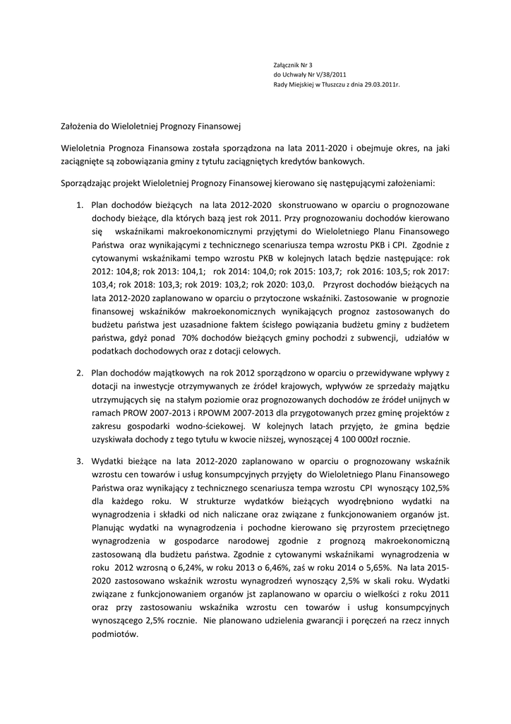 Załącznik Nr 3 do Uchwały Nr V/38/2011 Rady Miejskiej w Tłuszczu z dnia 29.03.2011r. Założenia do Wieloletniej Prognozy Finansowej Wieloletnia Prognoza Finansowa została sporządzona na lata 2011-2020 i obejmuje okres, na jaki zaciągnięte są zobowiązania gminy z tytułu zaciągniętych kredytów bankowych. Sporządzając projekt Wieloletniej Prognozy Finansowej kierowano się następującymi założeniami: 1. Plan dochodów bieżących na lata 2012-2020 skonstruowano w oparciu o prognozowane dochody bieżące, dla których bazą jest rok 2011. Przy prognozowaniu dochodów kierowano się wskaźnikami makroekonomicznymi przyjętymi do Wieloletniego Planu Finansowego Państwa oraz wynikającymi z technicznego scenariusza tempa wzrostu PKB i CPI. Zgodnie z cytowanymi wskaźnikami tempo wzrostu PKB w kolejnych latach będzie następujące: rok 2012: 104,8; rok 2013: 104,1; rok 2014: 104,0; rok 2015: 103,7; rok 2016: 103,5; rok 2017: 103,4; rok 2018: 103,3; rok 2019: 103,2; rok 2020: 103,0. Przyrost dochodów bieżących na lata 2012-2020 zaplanowano w oparciu o przytoczone wskaźniki. Zastosowanie w prognozie finansowej wskaźników makroekonomicznych wynikających prognoz zastosowanych do budżetu państwa jest uzasadnione faktem ścisłego powiązania budżetu gminy z budżetem państwa, gdyż ponad 70% dochodów bieżących gminy pochodzi z subwencji, udziałów w podatkach dochodowych oraz z dotacji celowych. 2. Plan dochodów majątkowych na rok 2012 sporządzono w oparciu o przewidywane wpływy z dotacji na inwestycje otrzymywanych ze źródeł krajowych, wpływów ze sprzedaży majątku utrzymujących się na stałym poziomie oraz prognozowanych dochodów ze źródeł unijnych w ramach PROW 2007-2013 i RPOWM 2007-2013 dla przygotowanych przez gminę projektów z zakresu gospodarki wodno-ściekowej. W kolejnych latach przyjęto, że gmina będzie uzyskiwała dochody z tego tytułu w kwocie niższej, wynoszącej 4 100 000zł rocznie. 3. Wydatki bieżące na lata 2012-2020 zaplanowano w oparciu o prognozowany wskaźnik wzrostu cen towarów i usług konsumpcyjnych przyjęty do Wieloletniego Planu Finansowego Państwa oraz wynikający z technicznego scenariusza tempa wzrostu CPI wynoszący 102,5% dla każdego roku. W strukturze wydatków bieżących wyodrębniono wydatki na wynagrodzenia i składki od nich naliczane oraz związane z funkcjonowaniem organów jst. Planując wydatki na wynagrodzenia i pochodne kierowano się przyrostem przeciętnego wynagrodzenia w gospodarce narodowej zgodnie z prognozą makroekonomiczną zastosowaną dla budżetu państwa. Zgodnie z cytowanymi wskaźnikami wynagrodzenia w roku 2012 wzrosną o 6,24%, w roku 2013 o 6,46%, zaś w roku 2014 o 5,65%. Na lata 20152020 zastosowano wskaźnik wzrostu wynagrodzeń wynoszący 2,5% w skali roku. Wydatki związane z funkcjonowaniem organów jst zaplanowano w oparciu o wielkości z roku 2011 oraz przy zastosowaniu wskaźnika wzrostu cen towarów i usług konsumpcyjnych wynoszącego 2,5% rocznie. Nie planowano udzielenia gwarancji i poręczeń na rzecz innych podmiotów. 4. W Wieloletniej Prognozie Finansowej nie zaplanowano zaangażowania nadwyżki budżetowej z lat ubiegłych oraz wolnych środków, co wynika z przyjętej zasady ostrożności i realności prognoz – przychody z tego źródła angażowane są po dokonaniu końcowych rozliczeń z zamkniętych okresów obrachunkowych. 5. Środki na spłatę i obsługę długu zaplanowano zgodnie z kwotami spłat rat kapitałowych wynikających z zawartych umów oraz podjętych uchwał oraz w oparciu o przewidywane koszty odsetek od zadłużenia. 6. Wydatki majątkowe zaplanowano zgodnie z wykazem przedsięwzięć do WPF. Na rok 2011 zaplanowano wydatki majątkowe w dwóch kategoriach: wydatki realizowane z udziałem środków pochodzących z budżetu Unii Europejskiej oraz wydatki realizowane ze środków krajowych. W kategorii wydatków realizowanych z udziałem środków pochodzących z budżetu Unii Europejskiej umieszczono projekty, na które są zawarte umowy o dofinansowanie oraz te, które przeszły wszystkie etapy oceny i zostały skierowane do dofinansowania. Wydatki realizowane ze środków krajowych zaplanowano zgodnie z priorytetami gminy z zakresu zamierzeń inwestycyjnych dotyczących wodociągowania miasta i gminy oraz budowy kanalizacji w Tłuszczu. 7. Kwotę długu wyliczono na podstawie zadłużenia na dzień 31 grudnia 2009r. wynoszącego 10 150 024,06. Dług ten został powiększony o nowe zadłużenie z tytułu kredytów i pożyczek zaciągniętych w roku 2010 w kwotach wynikających z uchwał o zaciągnięciu kredytów i pożyczek bądź w kwotach faktycznie wykorzystanych kredytów i pożyczek (dotyczy inwestycji zakończonych i rozliczonych). Kwota długu została pomniejszona o spłaty kapitałowe dokonane w roku 2010 w wysokości 1 936 575 zł. Na zadłużenie z roku 2010 składają się następujące kredyty i pożyczki: - druga część kredytu z roku 2009 przeznaczonego na wydatki z zakresu drogownictwa gminnego w kwocie 313 508,63 zł - kredyt bankowy przeznaczony na sfinansowanie wydatków stanowiących udział własny do zadania pt. „Remont budynku, zagospodarowanie terenu i wyposażenie świetlicy wiejskiej we wsi Dzięcioły gm. Tłuszcz” w kwocie faktycznie zaciągniętej 222 802,39 - kredyt bankowy przeznaczony na pokrycie wydatków z zakresu drogownictwa gminnego w kwocie 2 149 000zł -kredyt bankowy przeznaczony na sfinansowanie wydatków z zakresu inwestycji oświatowych w kwocie 960 578,27zł -kredyt bankowy przeznaczony na sfinansowanie udziału własnego w budowie sieci wodociągowej dla mieszkańców wsi Jarzębia Łąka i Postoliska w kwocie 277 903,76 (rok 2010) -kredyt bankowy przeznaczony na sfinansowanie udziału własnego do zadania pt. Modernizacja systemu gospodarki odpadami w Gminie Tłuszcz w kwocie 101 120,00zł -kredyt przeznaczony na budowę kanalizacji w Tłuszczu os. Klonowa–Norwida, budowę wodoci