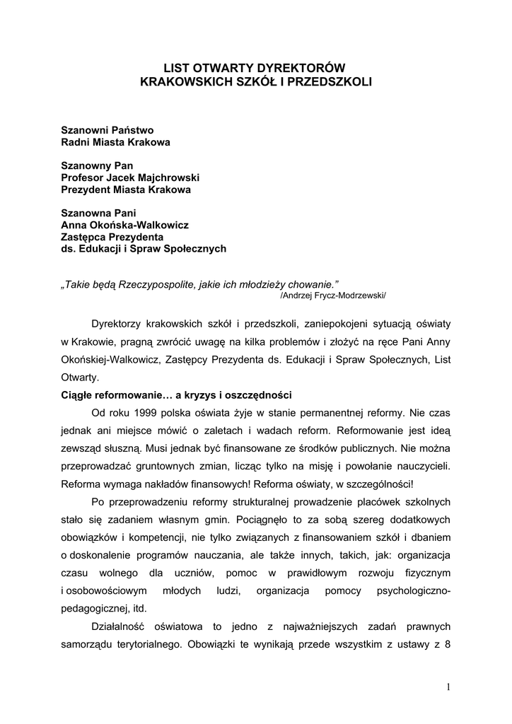 LIST OTWARTY DYREKTORÓW KRAKOWSKICH SZKÓŁ I PRZEDSZKOLI Szanowni Państwo Radni Miasta Krakowa Szanowny Pan Profesor Jacek Majchrowski Prezydent Miasta Krakowa Szanowna Pani Anna Okońska-Walkowicz Zastępca Prezydenta ds. Edukacji i Spraw Społecznych „Takie będą Rzeczypospolite, jakie ich młodzieży chowanie.” /Andrzej Frycz-Modrzewski/ Dyrektorzy krakowskich szkół i przedszkoli, zaniepokojeni sytuacją oświaty w Krakowie, pragną zwrócić uwagę na kilka problemów i złożyć na ręce Pani Anny Okońskiej-Walkowicz, Zastępcy Prezydenta ds. Edukacji i Spraw Społecznych, List Otwarty. Ciągłe reformowanie… a kryzys i oszczędności Od roku 1999 polska oświata żyje w stanie permanentnej reformy. Nie czas jednak ani miejsce mówić o zaletach i wadach reform. Reformowanie jest ideą zewsząd słuszną. Musi jednak być finansowane ze środków publicznych. Nie można przeprowadzać gruntownych zmian, licząc tylko na misję i powołanie nauczycieli. Reforma wymaga nakładów finansowych! Reforma oświaty, w szczególności! Po przeprowadzeniu reformy strukturalnej prowadzenie placówek szkolnych stało się zadaniem własnym gmin. Pociągnęło to za sobą szereg dodatkowych obowiązków i kompetencji, nie tylko związanych z finansowaniem szkół i dbaniem o doskonalenie programów nauczania, ale także innych, takich, jak: organizacja czasu wolnego i osobowościowym dla uczniów, młodych pomoc ludzi, w prawidłowym organizacja rozwoju pomocy fizycznym psychologiczno- pedagogicznej, itd. Działalność oświatowa to jedno z najważniejszych zadań prawnych samorządu terytorialnego. Obowiązki te wynikają przede wszystkim z ustawy z 8 1 marca 1990 r. o samorządzie gminnym (Dz.U. z 2001 r., nr 142, poz. 1591 ze zm.), która precyzuje, że środki na prowadzenie przedszkoli i szkół publicznych muszą być przewidziane w budżetach gminnych. Pieniądze na prowadzenie placówek oświatowych muszą zaś pochodzić ze środków publicznych. My, Dyrektorzy krakowskich szkół i przedszkoli, pragniemy włączyć się do dyskusji na temat reformy finansów oświaty krakowskiej. Pragniemy wyrazić zrozumienie dla bardzo trudnej sytuacji finansowej Miasta Krakowa. Mamy świadomość konieczności oszczędzania i pozyskiwania środków (co zresztą zawsze robiliśmy). Mamy świadomość konieczności restrukturyzacji sieci szkół. Mamy w końcu świadomość potrzeby zmian w prowadzeniu obsługi ekonomicznej przez ZEO, potrzeby unowocześniania szkół, prowadzenia inwestycji itd. itd. Mało tego, chcemy wspierać słuszne dążenia gminy, które mają na celu usprawnianie krakowskiej oświaty, także w zakresie jej finansowania. Nasze zrozumienie, zrozumienie naszych pracowników oraz Rodziców naszych uczniów musi mieścić się jednak w rozsądnych granicach. W obecnej sytuacji, gdy wzrosła cena każdej usługi, szkoła nie może mieć budżetu mniejszego niż w roku poprzednim. To przecież zagraża bezpieczeństwu jej funkcjonowania. Bezpieczeństwu funkcjonowania dzieci i młodzieży, o nauczycielach i pracownikach obsługi już nie wspominając. A przecież nie o to chodzi w słusznej skądinąd idei oszczędzania. Budżet nie do przyjęcia! Czy dyrektor może przyjąć budżet, który nie zapewnia środków na działalność statutową? Czy to jest zgodne z prawem? 1) Nie możemy bezkrytycznie pogodzić się z tym, że tak drastycznie zostały obniżone środki w planach finansowych szkół i placówek; dodatkowo pomniejszone jeszcze przez zapisy Uchwały Rady Miasta Krakowa Nr XXXV/461/12 z dnia 4 stycznia 2012 r. Przecież normalna czteroosobowa rodzina wydaje rocznie na zakupy, bynajmniej nie pierwszej potrzeby, więcej niż 4 tysiące zł, a niektórzy z nas, dyrektorów, mają łącznie tyle środków w tegorocznym budżecie placówki na §4210 (zakup materiałów i wyposażenia) i §4240 (zakup pomocy naukowych i dydaktycznych). 2) Nie możemy bezkrytycznie pogodzić się z Zarządzeniem nr 152/2012 Prezydenta Miasta Krakowa z dnia 23 stycznia 2012 w sprawie zmiany Zarządzeń Prezydenta Miasta Krakowa w sprawie określenia zasad organizacji pracy szkół i placówek 2 w roku szkolnym 2011/2012, w którym wprowadzono zapisy: „Dyrektorzy szkół prowadzą działalność dydaktyczną, wychowawczą i opiekuńczą oraz obsługę administracyjną, finansową i gospodarczą szkoły w ramach środków określonych w planie finansowym szkoły [podkreślone nasze]”. Nadano nam autonomię, z której nie sposób skorzystać zgodnie z prawem. Cięcia będą dotyczyć przede wszystkim obsługi, ale również pedagogów, psychologów, logopedów itp., a przepisy o pomocy psychologiczno-pedagogicznej nakładają na nas nowe obowiązki. Wysoki koszt oszczędności poniosą również świetlice i biblioteki. W jaki sposób mamy więc wypełnić wymogi rozporządzeń, tj. właściwie zapewnić pomoc psychologiczno-pedagogiczną (Rozporządzenie Ministra Edukacji Narodowej z dnia 17 listopada 2010 r. w sprawie zasad udzielania i organizacji pomocy psychologiczno-pedagogicznej w publicznych przedszkolach, szkołach i placówkach Dziennik Ustaw z 2 grudnia 2010 Nr 228 poz. 1487), bezpieczeństwo uczniów (Rozporządzenie Ministra Edukacji Narodowej I Sportu z dnia 31 grudnia 2002 r. w sprawie bezpieczeństwa i higieny w publicznych i niepublicznych szkołach i placówkach Dz. U. z dnia 22 stycznia 2003 r. z późn. Zmianami). To tylko dwa przykłady? 3) Nie możemy pogodzić się z tym, że jesteśmy zmuszeni sytuacją finansową do jawnego łamania prawa i „wyciągania” ręki po pieniądze rodziców. Edukacja w Polsce jest bezpłatna, co jasno stanowią przepisy Konstytucji, najważniejszego aktu prawnego w RP. Skutki uchwał Radnych i zarządzenia Prezydenta W projektach planów finansowych na kolejny rok budżetowy (grudzień 2011) wszyscy otrzymaliśmy znacznie niższe środki niż w roku poprzednim. A uchwała Państwa Radnych z dnia 4 stycznia br. spowodowała ko