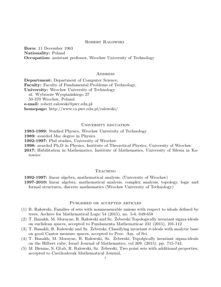 Robert Ralowski Born: 11 December 1963 Nationality: Poland Occupation: assistant professor, Wroclaw University of Technology Address Department: Department of Computer Science, Faculty: Faculty of Fundamental Problems of Technology, University: Wroclaw University of Technology ul. Wybrzeże Wyspiańskiego 27 50-370 Wroclaw, Poland e-mail: [email protected] homepage: http://www.cs.pwr.edu.pl/ralowski/ University education 1983-1989: Studied Physics, Wroclaw University of Technology 1989: avarded Msc degree in Physics 1992-1997: Phd studies, University of Wroclaw 1998: avarded Ph,D in Physics, Institute of Theoretical Physics, University of Wroclaw 2017: Habilitation in Mathematics, Institute of Mathematics, University of Silesia in Katowice Teaching 1992-1997: linear algebra, mathematical analysis, (University of Wroclaw) 1997-2010: linear algebra, mathematical analysis, complex analysis, topology, logic and formal structures, discrete mathematics (Wroclaw University of Technology) Published or accepted articles (1) R. Ralowski, Families of sets with nonmeasurable unions with respect to ideals defined by trees, Archive for Mathematical Logic 54 (2015), no. 5-6, 649-658 (2) T. Banakh, M. Morayne, R. Ralowski and Sz. Żeberski Topologically invariant sigma-ideals on euclidean spaces, accepted to Fundamenta Mathematicae 231 (2015), 101-112 (3) T. Banakh, R. Ralowski and Sz. Żeberski, Classifying invariant σ-ideals with analytic base on good Cantor measure spaces, accepted to Proc. Am. of Sci. (4) T. Banakh, M. Morayne, R. Ralowski, Sz. Żeberski, Topolgically invariant sigma-ideals on the Hilbert cube, Israel Journal of Mathematics, vol 209, (2015), pp. 715-743. (5) M. Bienias, S. Gl ab, R. Ralowski, Sz. Żeberski, Two point sets with additional properties, accepted to Czechoslovak Mathematical Journal, 1 2 (6) M. Burnecki, R. Ralowski, Topologies on the group of invertible transformations, Banach Center Publications, 95 (2011), pp. 273-280. (7) R. Ralowski and Sz. Żeberski, Generalized Luzin sets, accepted to Houston Journal of Mathematics, (8) R. Ralowski, Sz. Żeberski, Completely nonmeasurable unions, Central European Journal of Mathematics, 8(4) (2010), pp. 683-687. (9) R. Ralowski, P. Szczepaniak and Sz. Żeberski, A generalization of Steinhaus theorem and some nonmeasurable sets, Real Analysis Exchange, vol. 35, nr 1 (2009/2010), pp. 1-9. (10) R. Ralowski and Sz. Żeberski, On nonmeasurable images, Czechoslovak Mathematical Journal, 60(135) (2010), pp. 424-434. (11) J. Kraszewski, R. Ralowski, P. Szczepaniak and Sz. Żeberski, Bersnstein sets and κ coverings, Mathematical Logic Quarterly, 56 (2) 2010, pp. 216-224. (12) R. Ralowski, Nonmeasurability in Banach spaces, Far East Journal of Mathematical Sciences, vol. 36, nr 2 (2010), pp. 125-131. (13) R. Ralowski, Remarks on nonmeasurable unions of big point families, Mathematical Logic Quarterly, vol. 55, nr 6 (2009), pp. 659-665. (14) M. Kozlowski and R. Ralowski, The dielectric response with respect to the weight distribution of relaxation times, accepted to Journ. of Math. Chem. vol. 46, nr 4 (2009), pp. 1087-1102, (15) R. Ralowski, Sz. Żeberski, Complete nonmeasurability in regular families, Houston Journal of Mathematics, 34 (3) (2008), pp. 773-780 (16) J. Cichoń, M. Morayne, R. Ralowski, Cz. Ryll-Nardzewski, Sz. Żeberski, On nonmeasurable unions, Topology and its Applications, 154 (2007), pp.884-893 (17) R. Ralowski and M. Kozlowski, The Havriliak-Negami Dielectric Response in Time Domain, Polish J. Chem., Vol 79 (2005), 1353–1356 (18) R. Gielerak and R. Ralowski, Statistical mechanics of Class of Anyonic Systems. The Rigorous Approach, J. of Nonlinear Math. Phys. Vol 11 (2004), 85–91 (19) M. Kozlowski, R. Ralowski, H. Kolodziej, An Application of the Burr Function to the Description of Dielectric Relaxation Data in Frequency Domain, IEEE Trans. DEI. Vol 10 (2003), 256-259 (20) R. Gielerak and R. Ralowski, Convergence of virial expansions for some anyonic-like systems, Proceedings of the Seminar on Stability Problems for Stochastic Models, Part I (Naleczów, 1999). J. Math. Sci. (New York) 105 (2001), no. 6, 2555–2556 (21) R. Ralowski, On the kernel of the Hermitian Form and Partition Function, Proceedings of 6th Int. School on Theoretical Physics, Symmetry and Structural Properties of Condensed Matter. Word Scientific, 2001. (22) R. Gielerak and R. Ralowski, Wick Algebras Approach to Physics of 2D Systems, Proceedings of 5th Int. School on Theoretical Physics, Symmetry and Structural Properties of Condensed Matter. Word Scientific, 1999. (23) R. Ralowski, On Wick algebras with additional twisted commutation relations, J. Phys. A 30 (1997),no. 9, 3235–3247 (24) W. Marcinek R. Ralowski, On Wick algebras with braid relations, J. Math. Phys. 36(1995), no. 6, 2803–2812 (25) W. Marcinek and R. Ralowski, Particle operators from braided geometry, Quantum groups (Karpacz, 1994), 149–153, PWN, Warsaw, 1995. (MR 99k:81119 )