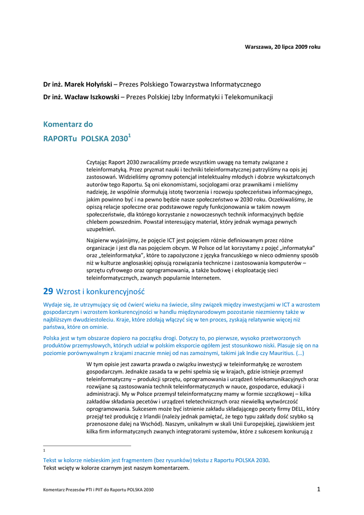 Warszawa, 20 lipca 2009 roku Dr inż. Marek Hołyński – Prezes Polskiego Towarzystwa Informatycznego Dr inż. Wacław Iszkowski – Prezes Polskiej Izby Informatyki i Telekomunikacji Komentarz do RAPORTu POLSKA 20301 Czytając Raport 2030 zwracaliśmy przede wszystkim uwagę na tematy związane z teleinformatyką. Przez pryzmat nauki i techniki teleinformatycznej patrzyliśmy na opis jej zastosowań. Widzieliśmy ogromny potencjał intelektualny młodych i dobrze wykształconych autorów tego Raportu. Są oni ekonomistami, socjologami oraz prawnikami i mieliśmy nadzieję, że wspólnie sformułują istotę tworzenia i rozwoju społeczeństwa informacyjnego, jakim powinno być i na pewno będzie nasze społeczeństwo w 2030 roku. Oczekiwaliśmy, że opiszą relacje społeczne oraz podstawowe reguły funkcjonowania w takim nowym społeczeństwie, dla którego korzystanie z nowoczesnych technik informacyjnych będzie chlebem powszednim. Powstał interesujący materiał, który jednak wymaga pewnych uzupełnień. Najpierw wyjaśnijmy, że pojęcie ICT jest pojęciem różnie definiowanym przez różne organizacje i jest dla nas pojęciem obcym. W Polsce od lat korzystamy z pojęć „informatyka” oraz „teleinformatyka”, które to zapożyczone z języka francuskiego w nieco odmienny sposób niż w kulturze anglosaskiej opisują rozwiązania techniczne i zastosowania komputerów – sprzętu cyfrowego oraz oprogramowania, a także budowę i eksploatację sieci teleinformatycznych, zwanych popularnie Internetem. 29 Wzrost i konkurencyjność Wydaje się, że utrzymujący się od ćwierć wieku na świecie, silny związek między inwestycjami w ICT a wzrostem gospodarczym i wzrostem konkurencyjności w handlu międzynarodowym pozostanie niezmienny także w najbliższym dwudziestoleciu. Kraje, które zdołają włączyć się w ten proces, zyskają relatywnie więcej niż państwa, które on ominie. Polska jest w tym obszarze dopiero na początku drogi. Dotyczy to, po pierwsze, wysoko przetworzonych produktów przemysłowych, których udział w polskim eksporcie ogółem jest stosunkowo niski. Plasuje się on na poziomie porównywalnym z krajami znacznie mniej od nas zamożnymi, takimi jak Indie czy Mauritius. (…) W tym opisie jest zawarta prawda o związku inwestycji w teleinformatykę ze wzrostem gospodarczym. Jednakże zasada ta w pełni spełnia się w krajach, gdzie istnieje przemysł teleinformatyczny – produkcji sprzętu, oprogramowania i urządzeń telekomunikacyjnych oraz rozwijane są zastosowania technik teleinformatycznych w nauce, gospodarce, edukacji i administracji. My w Polsce przemysł teleinformatyczny mamy w formie szczątkowej – kilka zakładów składania pecetów i urządzeń teletechnicznych oraz niewielką wytwórczość oprogramowania. Sukcesem może być istnienie zakładu składającego pecety firmy DELL, który przejął też produkcję z Irlandii (należy jednak pamiętać, że tego typu zakłady dość szybko są przenoszone dalej na Wschód). Naszym, unikalnym w skali Unii Europejskiej, zjawiskiem jest kilka firm informatycznych zwanych integratorami systemów, które z sukcesem konkurują z 1 Tekst w kolorze niebieskim jest fragmentem (bez rysunków) tekstu z Raportu POLSKA 2030. Tekst wcięty w kolorze czarnym jest naszym komentarzem. Komentarz Prezesów PTI i PIIT do Raportu POLSKA 2030 1 koncernami zagranicznymi i już są obecne również na rynkach zagranicznych. Warto, aby przynajmniej te firmy jak najdłużej były naszym krajowym wkładem w rozwój teleinformatyki w Polsce i Unii Europejskiej. Tworzenie konkurencyjnych produktów teleinformatycznych wymaga bardzo dużych nakładów finansowych o dużym poziomie ryzyka zwrotu z wyłożonego kapitału oraz wysokiej klasy kadry inżynierskiej a także kosztownych technologii wytwarzania. Zaprojektowanie nowego komputera wymaga kilkuset najlepszych inżynierów i programistów (bo fachowcy drugiej klasy zrobią drugiej klasy maszynę, której nikt nie kupi), linii produkcyjnych, silnego marketingu i globalnej sieci dystrybucji. Trzeba mierzyć zamiary na siły, żeby unikać rozczarowań i straty pieniędzy. Całe szczęście, że nie musimy sami wytwarzać tych wielu produktów. W naszych warunkach szansą są natomiast projekty niszowe – urządzeń oraz oprogramowania wysoce specjalistycznego, których też trochę w Polsce powstało i powstaje. Dobrym rozwiązaniem wydają się też oddziały R&D tworzone w kraju przez międzynarodowe korporacje (Motorola, Intel, Google, Microsoft). 120 Odpowiedni potencjał infrastruktury Podobne problemy zaistniały w sektorze łączności, gdzie usługi telekomunikacyjne i teleinformatyczne świadczyły przedsiębiorstwa obarczone nadmierną strukturą organizacyjną, generującą wysokie koszty i usługi niskiej jakości. Deregulacja sektora telekomunikacyjnego, wprowadzona w Stanach Zjednoczonych i w Europie w latach 80. i 90. zeszłego wieku w celu uruchomienia bodźców rynkowych w tym sektorze, nastąpiła w Polsce dopiero na początku obecnego wieku. Opóźnienie to przyczyniło się do utrzymania silnej (w porównaniu z innymi krajami europejskimi) pozycji zasiedziałego operatora telekomunikacyjnego (…) . Przykład ze Stanów Zjednoczonych jest zupełnie nietrafiony, gdyż nie była to deregulacja a po prostu uzgodniony z administracją federalną jej podział na mniejsze przedsiębiorstwa. Przy czym dzielono ATT mające wtedy ok. 1,2 mln pracowników i sieć na terenie całych Stanów, a wydzielone z niej firmy BELL były wielkości naszej TP. Co więcej była to tylko firma telefoniczna oraz nie istniały rozwiązania zastępcze – jak telefonia mobilna. I niestety te lokalne BELLe stały się na tych terenach długo monopolami. To była całkiem inna historia. W tym miejscu lepiej byłoby opisać przyjęte przez Komisję Europejską zasady obecnej deregulacji rynku teleinformatycznego polegające na wyznaczeniu na każdym z rodzajów rynkó