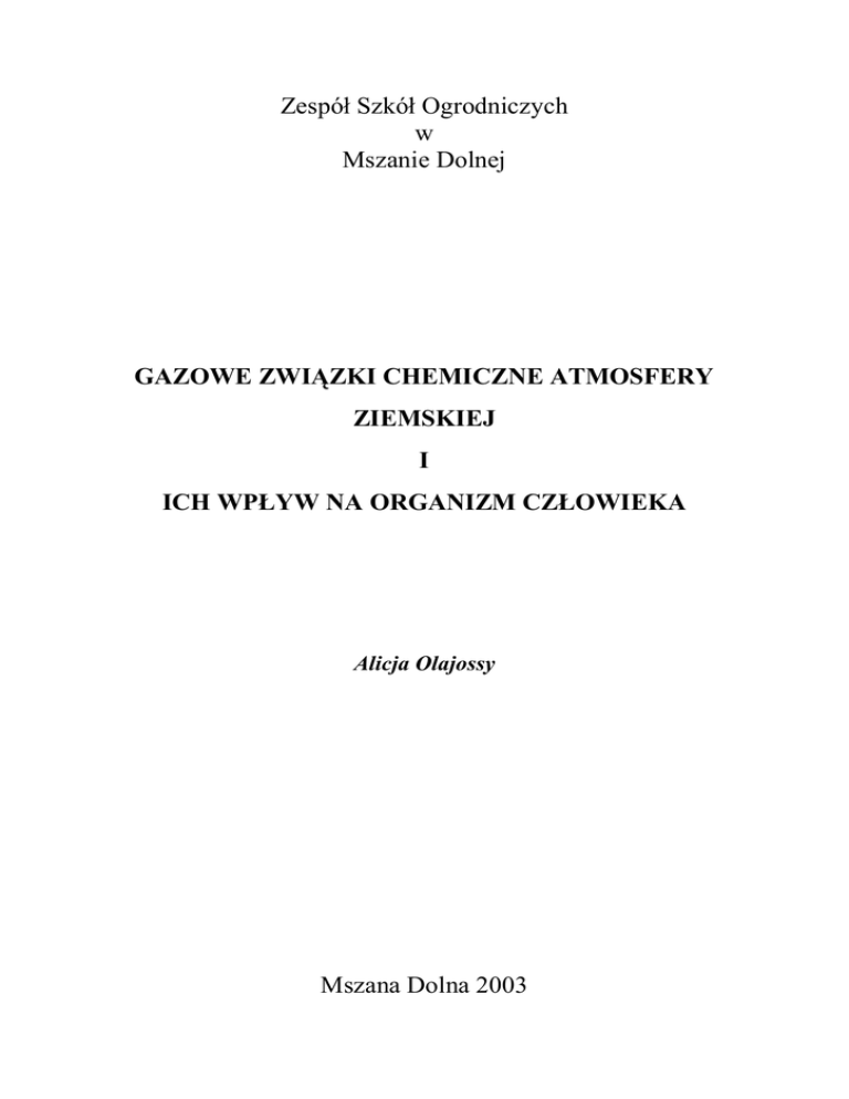 Zespół Szkół Ogrodniczych w Mszanie Dolnej GAZOWE ZWIĄZKI CHEMICZNE ATMOSFERY ZIEMSKIEJ I ICH WPŁYW NA ORGANIZM CZŁOWIEKA Alicja Olajossy Mszana Dolna 2003 SPIS TREŚCI Streszczenie. Wstęp. 1.0. Atmosfera. 1.1. Warstwowa budowa atmosfery. 1.2. Powstawanie atmosfery – teoria wielkiego wybuchu. 1.3. Skład chemiczny współczesnej atmosfery. 1.3.1. Skład czystego powietrza atmosferycznego. 1.3.2. Źródła składników atmosfery. 2.0. Charakterystyka gazowych związków chemicznych. 2.1. Woda. 2.1.1. Budowa i właściwości cząsteczki wody. 2.1.2. Rola wody w atmosferze. 2.2. Związki siarki. 2.2.1. Tlenek siarki. 2.2.1.1. Budowa i właściwości tlenku siarki(IV). 2.2.1.2. Wpływ tlenku siarki(IV) na organizm człowieka. 2.2.2. Siarkowodór. 2.2.2.1. Budowa i właściwości siarkowodoru. 2.2.2.2. Wpływ siarkowodoru na organizm człowieka. 2.3. Związki węgla. 2.3.1. Tlenki węgla. 2.3.1.1. Budowa i właściwości tlenku węgla(IV). 2.3.1.2. Budowa i właściwości tlenku węgla(II). 2.3.1.3. Wpływ tlenków węgla na organizm człowieka. 2.3.2. Węglowodory i ich pochodne. 2.3.2.1. Budowa i właściwości metanu. 2.3.2.2. Formaldehyd. 2.3.2.3. Freony i halony. 2.4. Związki azotu. 2.4.1. Źródła związków azotu w atmosferze. 2.4.2. Tlenki azotu. 2.4.2.1. Budowa i właściwości tlenku azotu(I). 2.4.2.2. Budowa i właściwości tlenku azotu(II). 2.4.2.3. Budowa i właściwości tlenku azotu(IV). 2.4.2.4. Wpływ NOx na organizm człowieka 2.4.3. Amoniak 2.4.3.1. Budowa i właściwości amoniaku. 2.4.3.2. Wpływ amoniaku na organizm człowieka. 2.5. Gazowe związki fluoru. 3.0. Biologiczne oddziaływanie gazów toksycznych. 4.0. Przemiany chemiczne i fotochemiczne gazowych związków atmosfery. 2 4.1. 5.0. 6.0. Mechanizmy tworzenia smogu. 4.1.1. Smog fotochemiczny. 4.1.2. Smog kwaśny. 4.2. Mechanizmy powstawania kwaśnych deszczów. 4.3. Mechanizm efektu cieplarnianego. 4.4. Zmiany zawartości ozonu w atmosferze. 4.4.1. Niszczenie ozonu stratosferycznego. 4.4.2. Wzrost stężenia ozonu w troposferze. Sposoby ochrony atmosfery przed zanieczyszczeniami. Literatura. 3 STRESZCZENIE W pracy poruszono podstawowe zagadnienia dotyczące gazowych związków chemicznych atmosfery ziemskiej. Omówiono budowę wybranych substancji chemicznych, ich właściwości oraz ich wpływ na organizm człowieka. Przedstawiono procesy i przemiany jakim w atmosferze podlegają związki siarki, węgla i azotu pod wpływem promieniowania słonecznego i wolnych rodników. Zwrócono uwagę na mechanizmy powstawania smogów, kwaśnych deszczów, efektu cieplarnianego i dziury ozonowej, a także na procesy prowadzące do obniżenia zawartości w atmosferze związków chemicznych niekorzystnych dla życia na Ziemi. 4 STRESZCZENIE W pracy poruszono podstawowe zagadnienia dotyczące gazowych związków chemicznych atmosfery ziemskiej. Omówiono budowę wybranych substancji chemicznych, ich właściwości oraz ich wpływ na organizm człowieka. Przedstawiono procesy i przemiany jakim w atmosferze podlegają związki siarki, węgla i azotu pod wpływem promieniowania słonecznego i wolnych rodników. Zwrócono uwagę na mechanizmy powstawania smogów, kwaśnych deszczów, efektu cieplarnianego i dziury ozonowej, a także na procesy prowadzące do obniżenia zawartości w atmosferze związków chemicznych niekorzystnych dla życia na Ziemi. 5 Wstęp Środowisko to ogół elementów materialnych, energia i zjawiska od których zależy istnienie organizmów. Podstawowymi elementami składowymi środowiska są: - litosfera – zewnętrzna warstwa kuli ziemskiej sięgająca do głębokości 80-150 km, obejmująca skorupę ziemską, kopaliny i glebę, która jest siedliskiem życia wielu organizmów - hydrosfera – wodna powłoka Ziemi, która obejmuje wody powierzchniowe takie jak oceany, morza, jeziora, bagna, pokrywy śnieżne i lodowce oraz zbiorniki wód podziemnych - atmosfera – powłoka gazowa otaczająca Ziemię Elementami środowiska są również organizmy żywe – rośliny, zwierzęta, grzyby, bakterie, pierwotniaki zamieszkujące biosferę utworzoną z części hydrosfery, litosfery i atmosfery oraz dobra wytworzone ręką człowieka. Nie można wyznaczyć wyraźnej granicy pomiędzy poszczególnymi sferami, są one wzajemnie powiązane i zależne od siebie. Zasoby hydrosfery mogą przenikać do innych powłok otaczających Ziemię tj. do litosfery i atmosfery oraz mogą zmieniać stan skupienia z ciekłego w gazowy lub stały. Gazy typowe dla atmosfery przenikają do litosfery i hydrosfery, a organizmy żywe korzystają ze wszystkich elementów środowiska. Wszystkie elementy tworzące środowisko wzajemnie na siebie oddziałują, co w istotny sposób wpływa na krążenie materii w przyrodzie. 1.0. Atmosfera ziemska 1.1. Warstwowa budowa atmosfery Ziemi. Atmosfera ziemska to mieszanina różnorodnych gazów o łącznej masie około 5,15 * 1015 ton. Wraz z wysokością zmianie ulegają takie parametry jak skład, ciśnienie, temperatura, gęstość. Są one podstawą do wyróżnienia w atmosferze charakterystycznych warstw. 6 Rys.1 Schemat warstwowej budowy atmosfery ziemskiej. Troposfera to warstwa przylegająca bezpośrednio do powierzchni Ziemi. W zależności od pory roku i szerokości geograficznej sięga do 8 km nad biegunami i do 17 km nad równikiem. Jej charakterystyczną cechą jest spadek temperatur wraz ze wzrostem wysokości o średnio 6.5K/km. Najwyższą warstwą troposfery jest cienka tropopauza, w której pionowy gradient temperatur zachowuje wartość 0. Nad troposferą do wysokości 50 km od powierzchni Ziemi znajduje się stratosfera. W niższych partiach tej warstwy temperatura waha się w granicach 205 – 222K, a w wyższych rośnie wraz z wysokością, osiągając przy górnej granicy około 273K. W stratosferze na wysokości około 20 – 40 km można wyróżnić warstwę bogatszą od pozostałych w ozon (O3) – ozonosferę, która tworzy dla Ziemi płaszcz chroniący prze