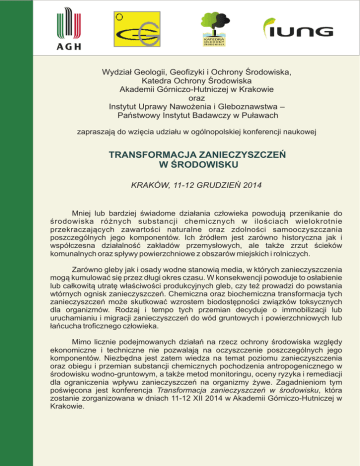 Wydzia³ Geologii, Geofizyki i Ochrony Œrodowiska, Katedra Ochrony Œrodowiska Akademii Górniczo-Hutniczej w Krakowie oraz Instytut Uprawy Nawo¿enia i Gleboznawstwa – Pañstwowy Instytut Badawczy w Pu³awach zapraszaj¹ do wziêcia udzia³u w ogólnopolskiej konferencji naukowej TRANSFORMACJA ZANIECZYSZCZEÑ W ŒRODOWISKU KRAKÓW, 11-12 GRUDZIEÑ 2014 Mniej lub bardziej œwiadome dzia³ania cz³owieka powoduj¹ przenikanie do œrodowiska ró¿nych substancji chemicznych w iloœciach wielokrotnie przekraczaj¹cych zawartoœci naturalne oraz zdolnoœci samooczyszczania poszczególnych jego komponentów. Ich Ÿród³em jest zarówno historyczna jak i wspó³czesna dzia³alnoœæ zak³adów przemys³owych, ale tak¿e zrzut œcieków komunalnych oraz sp³ywy powierzchniowe z obszarów miejskich i rolniczych. Zarówno gleby jak i osady wodne stanowi¹ media, w których zanieczyszczenia mog¹ kumulowaæ siê przez d³ugi okres czasu. W konsekwencji powoduje to os³abienie lub ca³kowit¹ utratê w³aœciwoœci produkcyjnych gleb, czy te¿ prowadzi do powstania wtórnych ognisk zanieczyszczeñ. Chemiczna oraz biochemiczna transformacja tych zanieczyszczeñ mo¿e skutkowaæ wzrostem biodostêpnoœci zwi¹zków toksycznych dla organizmów. Rodzaj i tempo tych przemian decyduje o immobilizacji lub uruchamianiu i migracji zanieczyszczeñ do wód gruntowych i powierzchniowych lub ³añcucha troficznego cz³owieka. Mimo licznie podejmowanych dzia³añ na rzecz ochrony œrodowiska wzglêdy ekonomiczne i techniczne nie pozwalaj¹ na oczyszczenie poszczególnych jego komponentów. Niezbêdna jest zatem wiedza na temat poziomu zanieczyszczenia oraz obiegu i przemian substancji chemicznych pochodzenia antropogenicznego w œrodowisku wodno-gruntowym, a tak¿e metod monitoringu, oceny ryzyka i remediacji dla ograniczenia wp³ywu zanieczyszczeñ na organizmy ¿ywe. Zagadnieniom tym poœwiêcona jest konferencja Transformacja zanieczyszczeñ w œrodowisku, która zostanie zorganizowana w dniach 11-12 XII 2014 w Akademii Górniczo-Hutniczej w Krakowie. Miejsce Obrad Wa¿ne terminy Akademia Górniczo-Hutnicza, Gmach G³ówny A-0 Al. Mickiewicza 30, 30-059 Kraków - Zg³oszenie udzia³u w konferencji do 15 maja 2014 - Komunikat 2 – 30 maj 2014 - Nadsy³anie streszczeñ wyst¹pieñ do 30 wrzeœnia 2014 - Wniesienie op³aty konferencyjnej do 30 wrzeœnia 2014 - Komunikat 3 – 15 listopad 2014 Komitet Naukowy Prof. dr hab. Izabela Bojakowska Prof. dr hab. Edeltrauda Helios-Rybicka Prof. dr hab. Zdzis³aw Migaszewski Prof. dr hab. Jerzy Siepak Prof. dr hab. Tadeusz Filipek Komitet Organizacyjny Dr hab. Dariusz Ciszewski, prof. AGH przewodnicz¹cy Dr hab. Urszula Aleksander-Kwaterczak Dr Grzegorz Siebielec Rejestracja Wype³nion¹ kartê zg³oszeniow¹ prosimy przes³aæ do 15 maja 2014 na adres: [email protected] Op³ata konferencyjna: Pe³ne uczestnictwo – 400 z³ Doktoranci i studenci – 250 z³ Koszt wpisowego obejmuje: materia³y konferencyjne, przerwy kawowe, lunch i udzia³ w spotkaniu towarzyskim w dniu 11 XII 2014. Kontakt KATEDRA OCHRONY ŒRODOWISKA Wydzia³ Geologii, Geofizyki i Ochrony Œrodowiska Akademia Górniczo-Hutnicza Al. Mickiewicza 30, 30-059 Kraków tel. 12-6172571 lub 12-6174710 e-mail: [email protected] http://www.wggios.agh.edu.pl/wydzial/badania Publikacja Planowane jest wydanie nadsy³anych materia³ów w postaci artyku³ów w kwartalniku Geology, Geophysics & Environment (5 pkt wg MNiSW) Noclegi Propozycja hoteli w najbli¿ej odleg³oœci od miejsca obrad: http://www.alexhotel.pl/ http://www.antica.jordan.pl/ http://www.hotel-polonez.pl/ http://www.apartamentyakademickie.pl/ http://www.ach.krakow.pl/