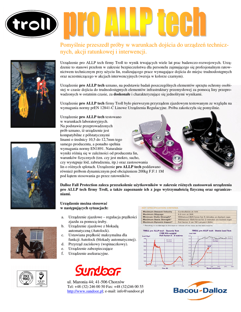 Pomyślnie przeszedł próby w warunkach dojścia do urządzeń technicznych, akcji ratunkowej i interwencji. Urządzenie pro ALLP tech firmy Troll to wynik trwających wiele lat prac badawczo-rozwojowych. Urządzenie to stanowi przełom w zakresie bezpieczeństwa dla personelu zajmującego się profesjonalnym ratownictwem technicznym przy użyciu lin, realizującego prace wymagające dojścia do miejsc trudnodostępnych oraz uczestniczącego w akcjach interwencyjnych (wersja w kolorze czarnym). Urządzenie pro ALLP tech uznano, na podstawie badań poszczególnych elementów sprzętu ochrony osobistej w czasie dojścia do trudnodostępnych elementów infrastruktury przemysłowej za pomocą liny przeprowadzonych w ostatnim czasie, za doskonałe i charakteryzujące się jednolitymi wynikami. Urządzenie pro ALLP tech firmy Troll było pierwszym przyrządem zjazdowym testowanym ze względu na wymagania normy prEN 12841-C Linowe Urządzenia Regulacyjne. Próba zakończyła się pomyślnie. Urządzenie pro ALLP tech testowano w warunkach laboratoryjnych. Na podstawie przeprowadzonych prób uznano, iż urządzenie jest kompatybilne z półstatycznymi linami o średnicy 10,5 do 12,7mm tego samego producenta, a ponadto spełnia wymagania normy EN1891. Naturalnie wyniki różnią się w zależności od producenta lin, warunków fizycznych (tzn. czy jest mokro, sucho, czy występuje lód, zabrudzenia, itp.) oraz zastosowania lin o różnych splotach. Urządzenie pro ALLP tech poddawano również próbom dynamicznym pod obciążeniem 200kg F.F.1 1M pod kątem stosowania go przez ratowników. Dalloz Fall Protection zaleca przeszkolenie użytkowników w zakresie różnych zastosowań urządzenia pro ALLP tech firmy Troll, a także zapoznanie ich z jego wytrzymałością fizyczną oraz ograniczeniami. Urządzenie można stosować w następujących sytuacjach: a. b. c. d. e. f. Urządzenie zjazdowe – regulacja prędkości zjazdu za pomocą śruby. Urządzenie zjazdowe z blokadą automatyczną (Autolock). Ustawiana prędkość maksymalna dla funkcji Autolock (blokady automatycznej). Przyrząd zaciskowy (wspinaczkowy). Urządzenie zabezpieczające Urządzenie asekuracyjne. ul. Maronia 44; 41-506 Chorzów Tel: +48 (32) 246 00 50 Fax: +48 (32)246 00 55 http://www.sundoor.pl; e-mail: [email protected]