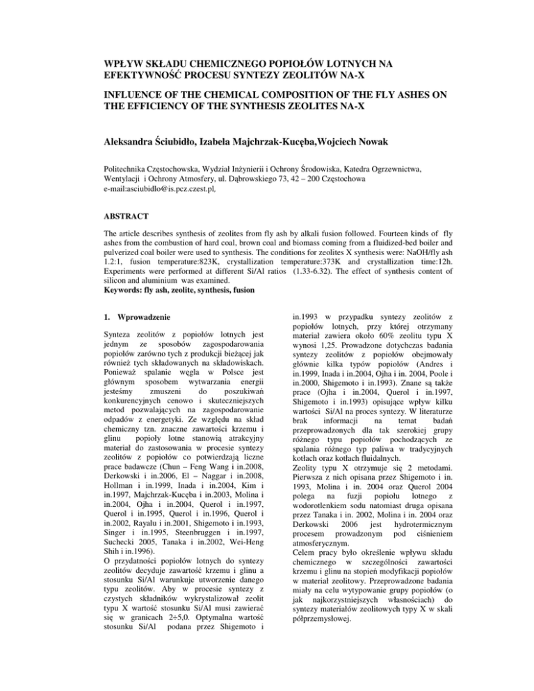 WPŁYW SKŁADU CHEMICZNEGO POPIOŁÓW LOTNYCH NA EFEKTYWNOŚĆ PROCESU SYNTEZY ZEOLITÓW NA-X INFLUENCE OF THE CHEMICAL COMPOSITION OF THE FLY ASHES ON THE EFFICIENCY OF THE SYNTHESIS ZEOLITES NA-X Aleksandra Ściubidło, Izabela Majchrzak-Kucęba,Wojciech Nowak Politechnika Częstochowska, Wydział Inżynierii i Ochrony Środowiska, Katedra Ogrzewnictwa, Wentylacji i Ochrony Atmosfery, ul. Dąbrowskiego 73, 42 – 200 Częstochowa e-mail:[email protected], ABSTRACT The article describes synthesis of zeolites from fly ash by alkali fusion followed. Fourteen kinds of fly ashes from the combustion of hard coal, brown coal and biomass coming from a fluidized-bed boiler and pulverized coal boiler were used to synthesis. The conditions for zeolites X synthesis were: NaOH/fly ash 1.2:1, fusion temperature:823K, crystallization temperature:373K and crystallization time:12h. Experiments were performed at different Si/Al ratios (1.33-6.32). The effect of synthesis content of silicon and aluminium was examined. Keywords: fly ash, zeolite, synthesis, fusion 1. Wprowadzenie Synteza zeolitów z popiołów lotnych jest jednym ze sposobów zagospodarowania popiołów zarówno tych z produkcji bieżącej jak również tych składowanych na składowiskach. Ponieważ spalanie węgla w Polsce jest głównym sposobem wytwarzania energii jesteśmy zmuszeni do poszukiwań konkurencyjnych cenowo i skuteczniejszych metod pozwalających na zagospodarowanie odpadów z energetyki. Ze względu na skład chemiczny tzn. znaczne zawartości krzemu i glinu popioły lotne stanowią atrakcyjny materiał do zastosowania w procesie syntezy zeolitów z popiołów co potwierdzają liczne prace badawcze (Chun – Feng Wang i in.2008, Derkowski i in.2006, El – Naggar i in.2008, Hollman i in.1999, Inada i in.2004, Kim i in.1997, Majchrzak-Kucęba i in.2003, Molina i in.2004, Ojha i in.2004, Querol i in.1997, Querol i in.1995, Querol i in.1996, Querol i in.2002, Rayalu i in.2001, Shigemoto i in.1993, Singer i in.1995, Steenbruggen i in.1997, Suchecki 2005, Tanaka i in.2002, Wei-Heng Shih i in.1996). O przydatności popiołów lotnych do syntezy zeolitów decyduje zawartość krzemu i glinu a stosunku Si/Al warunkuje utworzenie danego typu zeolitów. Aby w procesie syntezy z czystych składników wykrystalizował zeolit typu X wartość stosunku Si/Al musi zawierać się w granicach 2÷5,0. Optymalna wartość stosunku Si/Al podana przez Shigemoto i in.1993 w przypadku syntezy zeolitów z popiołów lotnych, przy której otrzymany materiał zawiera około 60% zeolitu typu X wynosi 1,25. Prowadzone dotychczas badania syntezy zeolitów z popiołów obejmowały głównie kilka typów popiołów (Andres i in.1999, Inada i in.2004, Ojha i in. 2004, Poole i in.2000, Shigemoto i in.1993). Znane są także prace (Ojha i in.2004, Querol i in.1997, Shigemoto i in.1993) opisujące wpływ kilku wartości Si/Al na proces syntezy. W literaturze brak informacji na temat badań przeprowadzonych dla tak szerokiej grupy różnego typu popiołów pochodzących ze spalania różnego typ paliwa w tradycyjnych kotłach oraz kotłach fluidalnych. Zeolity typu X otrzymuje się 2 metodami. Pierwsza z nich opisana przez Shigemoto i in. 1993, Molina i in. 2004 oraz Querol 2004 polega na fuzji popiołu lotnego z wodorotlenkiem sodu natomiast druga opisana przez Tanaka i in. 2002, Molina i in. 2004 oraz Derkowski 2006 jest hydrotermicznym procesem prowadzonym pod ciśnieniem atmosferycznym. Celem pracy było określenie wpływu składu chemicznego w szczególności zawartości krzemu i glinu na stopień modyfikacji popiołów w materiał zeolitowy. Przeprowadzone badania miały na celu wytypowanie grupy popiołów (o jak najkorzystniejszych własnościach) do syntezy materiałów zeolitowych typy X w skali półprzemysłowej. 226 2. Część doświadczalna 2.1 Popioły lotne Jako materiał wyjściowy zastosowano 14 popiołów lotnych ze spalania węgla kamiennego, węgla brunatnego i biomasy zarówno z kotłów fluidalnych jak i pyłowych, które nie zostały poddane żadnej obróbce wstępnej. Próbki nr 1,2,6,7,8,10 i 11 to popioły pochodzące ze spalania paliw w kotłach pyłowych zwane popiołami lotnymi, natomiast próbki numer 3,4,5,9,12,13 i 14 to popioły pochodzące ze spalania paliw w kotłach z cyrkulacyjną warstwą fluidalną zwane popiołami fluidalnymi. Próbki popiołów 2,3 i 8 pochodzą ze spalania węgla brunatnego natomiast próbka numer 13 to popiół ze spalania biomasy a próbka 14 to popiół pochodzący ze w spółspalania biomasy. 2.2 Synteza materiału zeolitowego Na podstawie danych literaturowych (Molina i in.2004, Ojha i in.2004, Shigemoto i in.1993) wybrano optymalne parametry procesu syntezy metodą fuzji pozwalające uzyskać jak największą wydajność reakcji oraz produkt o wysokiej krystaliczności. Próbki popiołów po zmieszaniu z NaOH w stosunki 1:1,2 ogrzewano w temp. 823K przez 1 godzinę ze stopniem nagrzewania 1K/min. Po ochłodzeniu do temp pokojowej i zmieleniu próbki zmieszano z wodą w stosunku 1:4,5. Próbki wytrząsano w temp pokojowej przez 12 godzin, po czym proces krystalizacji prowadzony był w temp. 373K przez 12 godzin. Po filtracji i przemyciu wodą próbki suszono w temp. 393K przez 12 godzin. 2.3 Charakterystyka otrzymanych produktów Skład chemiczny użytych popiołów do syntezy został oznaczony zgodnie z normą dot. składu chemicznego paliw. Do wykonania analizy jakościowej oraz półilościowej popiołów oraz otrzymanych w wyniku modyfikacji materiałów wykorzystano dyfraktometr proszkowy D8 Advance. Aparat zaopatrzony był w monochromator Ge ( długość promieniowana CuKα1=1,5406 Å). Refleksy rejestrowane były przy pomocy detektora paskowego, krzemowego LynxEye. Pomiarów dokonano przy użyciu kuwet wykonanych z polimetakrylanu metylu. Dyfraktogramy rejestrowane były w temp. pokojowej w zakresie 10-70o 2Θ dla materiałów zeolitowych oraz w zakresie 6-60o 2Θ dla popiołów, z k