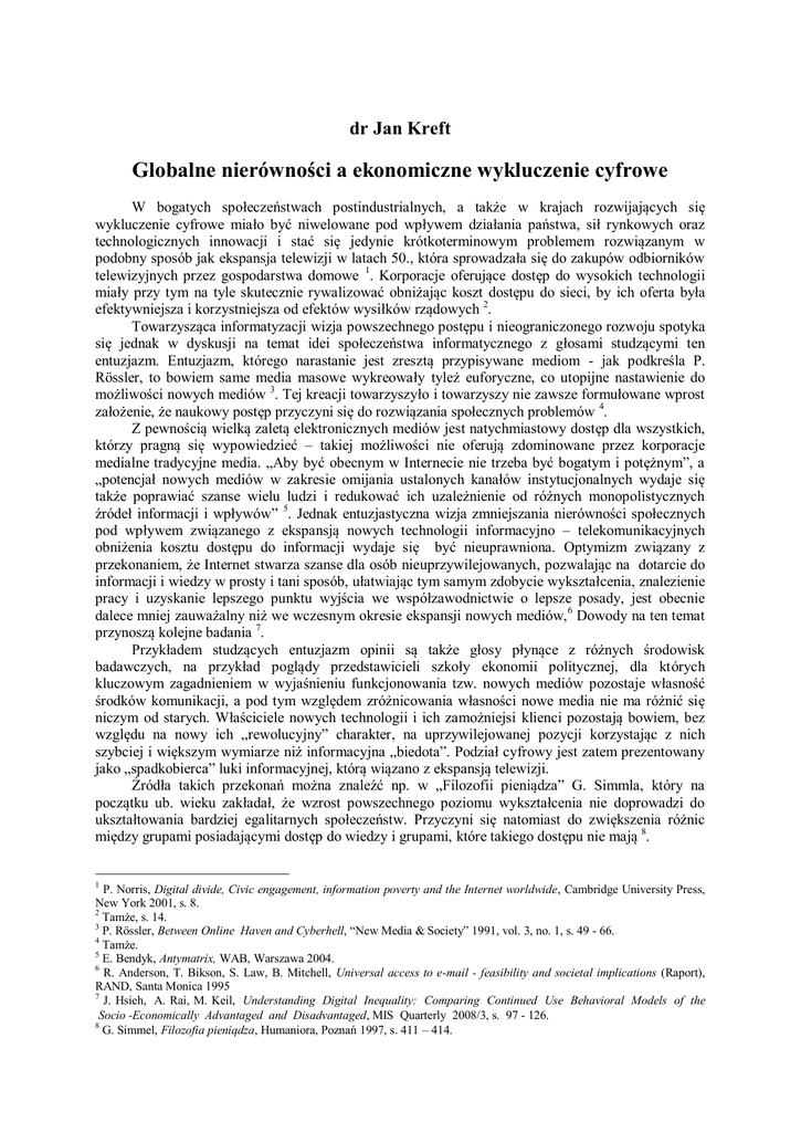 dr Jan Kreft Globalne nierówności a ekonomiczne wykluczenie cyfrowe W bogatych społeczeństwach postindustrialnych, a także w krajach rozwijających się wykluczenie cyfrowe miało być niwelowane pod wpływem działania państwa, sił rynkowych oraz technologicznych innowacji i stać się jedynie krótkoterminowym problemem rozwiązanym w podobny sposób jak ekspansja telewizji w latach 50., która sprowadzała się do zakupów odbiorników telewizyjnych przez gospodarstwa domowe 1. Korporacje oferujące dostęp do wysokich technologii miały przy tym na tyle skutecznie rywalizować obniżając koszt dostępu do sieci, by ich oferta była efektywniejsza i korzystniejsza od efektów wysiłków rządowych 2. Towarzysząca informatyzacji wizja powszechnego postępu i nieograniczonego rozwoju spotyka się jednak w dyskusji na temat idei społeczeństwa informatycznego z głosami studzącymi ten entuzjazm. Entuzjazm, którego narastanie jest zresztą przypisywane mediom - jak podkreśla P. Rössler, to bowiem same media masowe wykreowały tyleż euforyczne, co utopijne nastawienie do możliwości nowych mediów 3. Tej kreacji towarzyszyło i towarzyszy nie zawsze formułowane wprost założenie, że naukowy postęp przyczyni się do rozwiązania społecznych problemów 4. Z pewnością wielką zaletą elektronicznych mediów jest natychmiastowy dostęp dla wszystkich, którzy pragną się wypowiedzieć – takiej możliwości nie oferują zdominowane przez korporacje medialne tradycyjne media. „Aby być obecnym w Internecie nie trzeba być bogatym i potężnym”, a „potencjał nowych mediów w zakresie omijania ustalonych kanałów instytucjonalnych wydaje się także poprawiać szanse wielu ludzi i redukować ich uzależnienie od różnych monopolistycznych źródeł informacji i wpływów” 5. Jednak entuzjastyczna wizja zmniejszania nierówności społecznych pod wpływem związanego z ekspansją nowych technologii informacyjno – telekomunikacyjnych obniżenia kosztu dostępu do informacji wydaje się być nieuprawniona. Optymizm związany z przekonaniem, że Internet stwarza szanse dla osób nieuprzywilejowanych, pozwalając na dotarcie do informacji i wiedzy w prosty i tani sposób, ułatwiając tym samym zdobycie wykształcenia, znalezienie pracy i uzyskanie lepszego punktu wyjścia we współzawodnictwie o lepsze posady, jest obecnie dalece mniej zauważalny niż we wczesnym okresie ekspansji nowych mediów, 6 Dowody na ten temat przynoszą kolejne badania 7. Przykładem studzących entuzjazm opinii są także głosy płynące z różnych środowisk badawczych, na przykład poglądy przedstawicieli szkoły ekonomii politycznej, dla których kluczowym zagadnieniem w wyjaśnieniu funkcjonowania tzw. nowych mediów pozostaje własność środków komunikacji, a pod tym względem zróżnicowania własności nowe media nie ma różnić się niczym od starych. Właściciele nowych technologii i ich zamożniejsi klienci pozostają bowiem, bez względu na nowy ich „rewolucyjny” charakter, na uprzywilejowanej pozycji korzystając z nich szybciej i większym wymiarze niż informacyjna „biedota”. Podział cyfrowy jest zatem prezentowany jako „spadkobierca” luki informacyjnej, którą wiązano z ekspansją telewizji. Źródła takich przekonań można znaleźć np. w „Filozofii pieniądza” G. Simmla, który na początku ub. wieku zakładał, że wzrost powszechnego poziomu wykształcenia nie doprowadzi do ukształtowania bardziej egalitarnych społeczeństw. Przyczyni się natomiast do zwiększenia różnic między grupami posiadającymi dostęp do wiedzy i grupami, które takiego dostępu nie mają 8. 1 P. Norris, Digital divide, Civic engagement, information poverty and the Internet worldwide, Cambridge University Press, New York 2001, s. 8. 2 Tamże, s. 14. 3 P. Rössler, Between Online Haven and Cyberhell, “New Media & Society” 1991, vol. 3, no. 1, s. 49 - 66. 4 Tamże. 5 E. Bendyk, Antymatrix, WAB, Warszawa 2004. 6 R. Anderson, T. Bikson, S. Law, B. Mitchell, Universal access to e-mail - feasibility and societal implications (Raport), RAND, Santa Monica 1995 7 J. Hsieh, A. Rai, M. Keil, Understanding Digital Inequality: Comparing Continued Use Behavioral Models of the Socio -Economically Advantaged and Disadvantaged, MIS Quarterly 2008/3, s. 97 - 126. 8 G. Simmel, Filozofia pieniądza, Humaniora, Poznań 1997, s. 411 – 414. Do koncepcji tej nawiązywała po kilkudziesięciu latach koncepcja „luki wiedzy” (knowledge gap), a mówiąca o tym, że ze wzrostem informacji przekazywanych przez masowe media, grupy o wyższym społeczno - ekonomicznym statusie przyswajają je szybciej niż grupy o statusie niższym. 9 Dzieje się tak dlatego, że „osoby o wysokim statusie społeczny są zawsze faworyzowane w wykorzystaniu nowych źródeł informacji. Z powodu ich uprzywilejowanej pozycji dowiadują się o nich jako pierwsze, a z powodu wysokich dochodów mogą sobie na nie pozwolić, gdy są jeszcze nowościami. Ponadto wykształcenie daje im kognitywną przewagę, która pozwala im (…) skorzystać bardziej efektywnie z nowych informacji, zwracając im poniesione wcześniej inwestycje w pozyskanie wiedzy” 10. O upowszechnieniu wiedzy i informacji decydują zatem wykształcenie i status społeczno – ekonomiczny. Wraz z rozwojem mediów, zwłaszcza technologicznym, lepiej wykształceni i zamożniejsi będą uzyskiwali i utrzymywali przewagę nad gorzej sytuowanymi i wykształconymi 11. Zatem rozwój mediów przyczynić ma się, wbrew optymistycznym założeniom, do powiększenia społecznych różnic pod wpływem zróżnicowanego dostępu do informacji i wiedzy i możliwości ich wykorzystania. Może to oznaczać w wymiarze makro, że kraje „informatycznie słabe” będą uzależnione i bezradne 12. Porównując Internet z dotychczas dominującymi mediami wskazuje się przede wszystkim, że internetowa informacja jest dobrem niemal darmowym, które zgodn