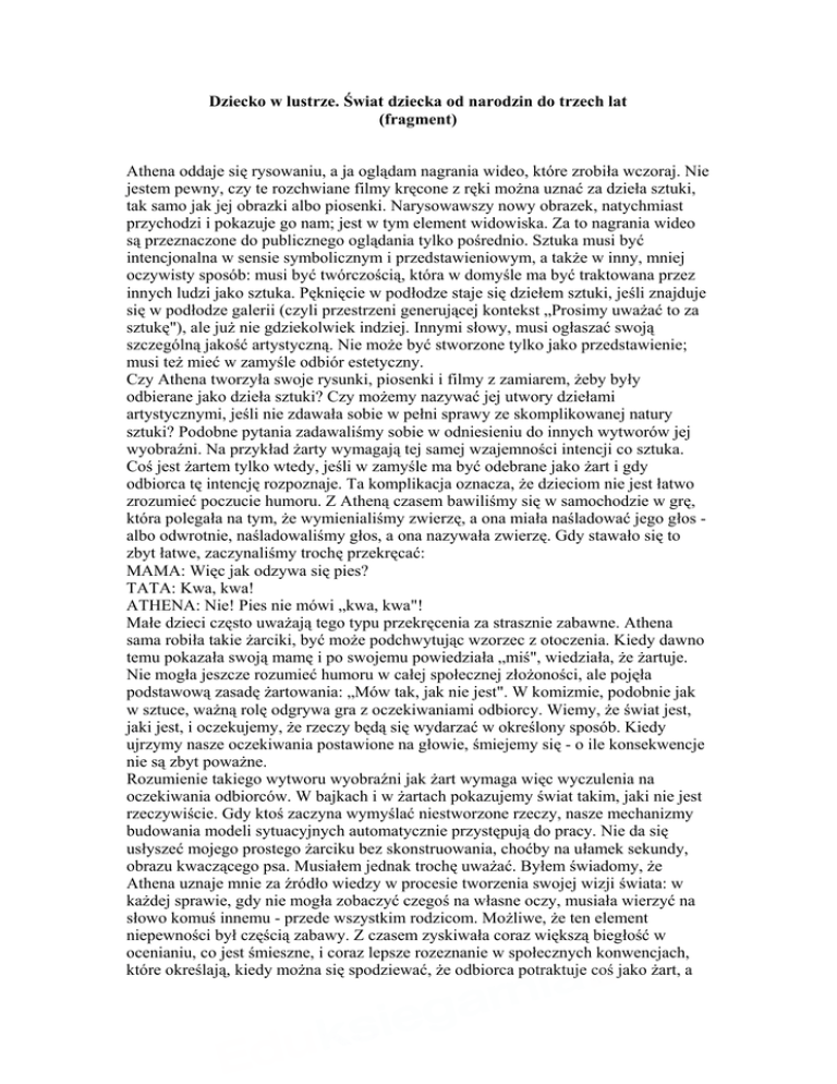 Dziecko w lustrze. Świat dziecka od narodzin do trzech lat (fragment) Athena oddaje się rysowaniu, a ja oglądam nagrania wideo, które zrobiła wczoraj. Nie jestem pewny, czy te rozchwiane filmy kręcone z ręki można uznać za dzieła sztuki, tak samo jak jej obrazki albo piosenki. Narysowawszy nowy obrazek, natychmiast przychodzi i pokazuje go nam; jest w tym element widowiska. Za to nagrania wideo są przeznaczone do publicznego oglądania tylko pośrednio. Sztuka musi być intencjonalna w sensie symbolicznym i przedstawieniowym, a także w inny, mniej oczywisty sposób: musi być twórczością, która w domyśle ma być traktowana przez innych ludzi jako sztuka. Pęknięcie w podłodze staje się dziełem sztuki, jeśli znajduje się w podłodze galerii (czyli przestrzeni generującej kontekst „Prosimy uważać to za sztukę"), ale już nie gdziekolwiek indziej. Innymi słowy, musi ogłaszać swoją szczególną jakość artystyczną. Nie może być stworzone tylko jako przedstawienie; musi też mieć w zamyśle odbiór estetyczny. Czy Athena tworzyła swoje rysunki, piosenki i filmy z zamiarem, żeby były odbierane jako dzieła sztuki? Czy możemy nazywać jej utwory dziełami artystycznymi, jeśli nie zdawała sobie w pełni sprawy ze skomplikowanej natury sztuki? Podobne pytania zadawaliśmy sobie w odniesieniu do innych wytworów jej wyobraźni. Na przykład żarty wymagają tej samej wzajemności intencji co sztuka. Coś jest żartem tylko wtedy, jeśli w zamyśle ma być odebrane jako żart i gdy odbiorca tę intencję rozpoznaje. Ta komplikacja oznacza, że dzieciom nie jest łatwo zrozumieć poczucie humoru. Z Atheną czasem bawiliśmy się w samochodzie w grę, która polegała na tym, że wymienialiśmy zwierzę, a ona miała naśladować jego głos albo odwrotnie, naśladowaliśmy głos, a ona nazywała zwierzę. Gdy stawało się to zbyt łatwe, zaczynaliśmy trochę przekręcać: MAMA: Więc jak odzywa się pies? TATA: Kwa, kwa! ATHENA: Nie! Pies nie mówi „kwa, kwa"! Małe dzieci często uważają tego typu przekręcenia za strasznie zabawne. Athena sama robiła takie żarciki, być może podchwytując wzorzec z otoczenia. Kiedy dawno temu pokazała swoją mamę i po swojemu powiedziała „miś", wiedziała, że żartuje. Nie mogła jeszcze rozumieć humoru w całej społecznej złożoności, ale pojęła podstawową zasadę żartowania: „Mów tak, jak nie jest". W komizmie, podobnie jak w sztuce, ważną rolę odgrywa gra z oczekiwaniami odbiorcy. Wiemy, że świat jest, jaki jest, i oczekujemy, że rzeczy będą się wydarzać w określony sposób. Kiedy ujrzymy nasze oczekiwania postawione na głowie, śmiejemy się - o ile konsekwencje nie są zbyt poważne. Rozumienie takiego wytworu wyobraźni jak żart wymaga więc wyczulenia na oczekiwania odbiorców. W bajkach i w żartach pokazujemy świat takim, jaki nie jest rzeczywiście. Gdy ktoś zaczyna wymyślać niestworzone rzeczy, nasze mechanizmy budowania modeli sytuacyjnych automatycznie przystępują do pracy. Nie da się usłyszeć mojego prostego żarciku bez skonstruowania, choćby na ułamek sekundy, obrazu kwaczącego psa. Musiałem jednak trochę uważać. Byłem świadomy, że Athena uznaje mnie za źródło wiedzy w procesie tworzenia swojej wizji świata: w każdej sprawie, gdy nie mogła zobaczyć czegoś na własne oczy, musiała wierzyć na słowo komuś innemu - przede wszystkim rodzicom. Możliwe, że ten element niepewności był częścią zabawy. Z czasem zyskiwała coraz większą biegłość w ocenianiu, co jest śmieszne, i coraz lepsze rozeznanie w społecznych konwencjach, które określają, kiedy można się spodziewać, że odbiorca potraktuje coś jako żart, a nie jako impertynencję albo kłamstwo. Z czasem nasze żarty stawały się bardziej złożone. Bywało, że kończyło się to nieporozumieniem i Athena zaczynała chichotać, kiedy mówiłem zupełnie poważnie. Na przykład któregoś wieczora po kolacji moje stwierdzenie, że zamierzam przestać pić wino, wywołało u niej kaskadę perlistego śmiechu. Dlaczego byłem zniesmaczony? Athena nauczyła się, że śmiech jest odpowiednią reakcją, gdy ktoś mówi coś, co w żaden sposób nie może być prawdziwe. Nie powiedziałem tego z żartobliwą intencją, ale ona tak to potraktowała. Proszę ją, żeby powiedziała jakiś żart. Przez chwilę usilnie się zastanawia. - Weszła na mnie mysz. - I co? - Spadło na mnie drzewo. To może być śmieszne - w jakiś absurdalny sposób - ale czy to żart? Aż do ukończenia trzech lat Athena nie opowiada prawdziwych żartów. Zresztą potem spieszy się bardzo z wygłaszaniem puenty, nie zostawiając słuchaczom czasu na żadne tradycyjne interakcje. Być może kojarzy te dialogi o utartej formie z cudzym śmiechem; dla niej samej nic nie znaczą, ale świat najwyraźniej uważa je za coś śmiesznego. A może doskonale wie, na czym polegają dowcipy, ale po prostu niezbyt dobrze umie je opowiedzieć. Albo chodzi o coś więcej. Mysz, jak relacjonowała rano, przyśniła jej się tamtej nocy, i kiedy proszę ją o opowiedzenie żartu, opowiada swój sen. I żart, i sen to historie; oba są o tym, czego nie ma. Oba interesowały Freuda, który twierdził, że są przejawami pierwotnych pragnień, wypieranych przez świadomość. Nie jestem pewien, co kwaczący pies mówi o mojej podświadomości, ale poza tym przyrównanie snu do żartu wydaje się sensowne. To, że przestanę pić alkohol, jest dobrym żartem, bo jest także dobrym snem. Gdy Athena ma dwa lata, Lizzie pyta ją, czym są sny. „Takie kolorowe rzeczy" - odpowiada i pokazuje coś dziwnego rączkami, prosząc mamę, żeby ją naśladowała. „Taki sen" - instruuje. „A teraz taki". Gdy Piaget pytał dzieci, skąd się biorą sny, dostawał odpowiedzi, które same w sobie były dziełami sztuki. Pewien czterolatek twierdził na przykład, że sny są zrobione ze „światełek z księżyca. On się rozp