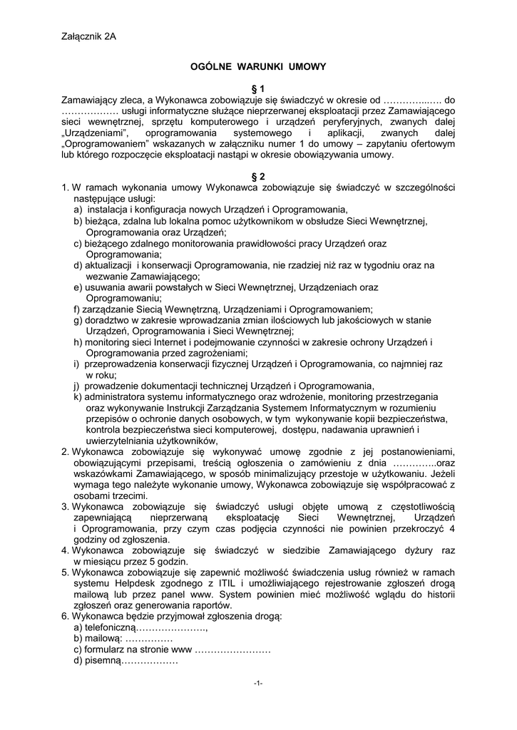 Załącznik 2A OGÓLNE WARUNKI UMOWY §1 Zamawiający zleca, a Wykonawca zobowiązuje się świadczyć w okresie od …………...…. do ……………… usługi informatyczne służące nieprzerwanej eksploatacji przez Zamawiającego sieci wewnętrznej, sprzętu komputerowego i urządzeń peryferyjnych, zwanych dalej „Urządzeniami”, oprogramowania systemowego i aplikacji, zwanych dalej „Oprogramowaniem” wskazanych w załączniku numer 1 do umowy – zapytaniu ofertowym lub którego rozpoczęcie eksploatacji nastąpi w okresie obowiązywania umowy. §2 1. W ramach wykonania umowy Wykonawca zobowiązuje się świadczyć w szczególności następujące usługi: a) instalacja i konfiguracja nowych Urządzeń i Oprogramowania, b) bieżąca, zdalna lub lokalna pomoc użytkownikom w obsłudze Sieci Wewnętrznej, Oprogramowania oraz Urządzeń; c) bieżącego zdalnego monitorowania prawidłowości pracy Urządzeń oraz Oprogramowania; d) aktualizacji i konserwacji Oprogramowania, nie rzadziej niż raz w tygodniu oraz na wezwanie Zamawiającego; e) usuwania awarii powstałych w Sieci Wewnętrznej, Urządzeniach oraz Oprogramowaniu; f) zarządzanie Siecią Wewnętrzną, Urządzeniami i Oprogramowaniem; g) doradztwo w zakresie wprowadzania zmian ilościowych lub jakościowych w stanie Urządzeń, Oprogramowania i Sieci Wewnętrznej; h) monitoring sieci Internet i podejmowanie czynności w zakresie ochrony Urządzeń i Oprogramowania przed zagrożeniami; i) przeprowadzenia konserwacji fizycznej Urządzeń i Oprogramowania, co najmniej raz w roku; j) prowadzenie dokumentacji technicznej Urządzeń i Oprogramowania, k) administratora systemu informatycznego oraz wdrożenie, monitoring przestrzegania oraz wykonywanie Instrukcji Zarządzania Systemem Informatycznym w rozumieniu przepisów o ochronie danych osobowych, w tym wykonywanie kopii bezpieczeństwa, kontrola bezpieczeństwa sieci komputerowej, dostępu, nadawania uprawnień i uwierzytelniania użytkowników, 2. Wykonawca zobowiązuje się wykonywać umowę zgodnie z jej postanowieniami, obowiązującymi przepisami, treścią ogłoszenia o zamówieniu z dnia …………..oraz wskazówkami Zamawiającego, w sposób minimalizujący przestoje w użytkowaniu. Jeżeli wymaga tego należyte wykonanie umowy, Wykonawca zobowiązuje się współpracować z osobami trzecimi. 3. Wykonawca zobowiązuje się świadczyć usługi objęte umową z częstotliwością zapewniającą nieprzerwaną eksploatację Sieci Wewnętrznej, Urządzeń i Oprogramowania, przy czym czas podjęcia czynności nie powinien przekroczyć 4 godziny od zgłoszenia. 4. Wykonawca zobowiązuje się świadczyć w siedzibie Zamawiającego dyżury raz w miesiącu przez 5 godzin. 5. Wykonawca zobowiązuje się zapewnić możliwość świadczenia usług również w ramach systemu Helpdesk zgodnego z ITIL i umożliwiającego rejestrowanie zgłoszeń drogą mailową lub przez panel www. System powinien mieć możliwość wglądu do historii zgłoszeń oraz generowania raportów. 6. Wykonawca będzie przyjmował zgłoszenia drogą: a) telefoniczną…………………., b) mailową: …………… c) formularz na stronie www …………………… d) pisemną……………… -1- Załącznik 2A 7. Wykonawca zobowiązuje się wskazać z imienia i nazwiska osoby, którymi posługuje się przy wykonywaniu umowy, (obowiązek ten dotyczy również pracowników Wykonawcy). §3 Wykonawca zobowiązuje się przygotować projekt Instrukcji Zarządzania Systemem Informatycznym zgodnie z przepisami ustawy o ochronie danych osobowych i przepisami wykonawczymi wydanymi na jej podstawie. Wykonawca zobowiązuje się przenieść na Zamawiającego prawa autorskie do Instrukcji na następujących polach eksploatacji: a) utrwalanie i zwielokrotnienie w całości lub we fragmentach jakąkolwiek techniką, w tym techniką drukarską lub cyfrową, b) rozpowszechnianie w całości lub we fragmentach, a w szczególności udostępnianie w ten sposób, by każdy mógł się z nimi zapoznać w wybranym miejscu i czasie, w tym w sieci Internet, c) wprowadzenie w całości lub we fragmentach do pamięci komputera, d) wykonywanie praw zależnych. §4 Wykonawca zobowiązany jest niezwłocznie zawiadomić Zamawiającego jeżeli usunięcie awarii wymaga przeprowadzenia czynności nie objętych umową. Zamawiający nie ponosi kosztów i ryzyka za podjęcie przez Wykonawcę takich czynności bez wyraźnego i uprzedniego zlecenia przez Zamawiającego. §5 Wykonawca zobowiązuje się zachować w tajemnicy wszelkie informacje, które uzyskał w związku z zawarciem i wykonywaniem umowy. Obowiązek zachowania tajemnicy trwa również po wygaśnięciu umowy. Obowiązek zachowania tajemnicy nie dotyczy przypadków, w których ich ujawnienie wymagane jest obowiązującymi przepisami. Zasady przetwarzania przez Wykonawcę powierzonych danych osobowych określa odrębne porozumienie – załącznik A3. §5 1. Z tytułu wykonywania umowy Wykonawcy przysługuje łączne wynagrodzenie w wysokości …………………………... Wynagrodzenie płatne będzie w trzydziestu sześciu częściach równych po zakończeniu każdego miesiąca kalendarzowego wykonywania umowy w terminie 14 dni od daty otrzymania faktury VAT na rachunek tam wskazany. 2. Wynagrodzenie obejmuje wszelkie wynikające z umowy świadczenia, a Zamawiający nie jest zobowiązany do zwolnienia Wykonawcy z zaciąganych w związku z wykonywaniem umowy zobowiązań oraz ponoszenia innych kosztów. §6 1. Zamawiającemu przysługują od Wykonawcy kary umowne w przypadku nienależytego wykonania umowy: a) w wysokości 200,00 złotych, z zastrzeżeniem lit. b) b) w wysokości 20% wynagrodzenia umownego brutto w przypadku odstąpienia od umowy lub jej wypowiedzenia ze względu na okoliczności, za które odpowiedzialność ponosi Wykonawca. 2. Wykonawcy przysługuje od Zamawiającego kara umowna w wysokości 20% wynagrodzenia umownego brutto w przypadku odstąpi