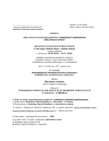 ......................................................... Lubsko, 23.03.2010r. (pieczęć organizacji pozarządowej* /podmiotu*/jednostki organizacyjnej*) (data i miejsce złoŜenia oferty) OFERTA ORGANIZACJI POZARZĄDOWEJ*/ PODMIOTU*/JEDNOSTKI ORGANIZACYJNEJ* REALIZACJI ZADANIA PUBLICZNEGO Cykl zajęć zielone klasy- zielone lekcje (rodzaj zadania) w okresie od 05.09.2010r – 30.11. 2010r. składana na podstawie przepisów działu II rozdziału 2 ustawy z dnia 24 kwietnia 2003 r. o działalności poŜytku publicznego i o wolontariacie (Dz. U. Nr 96, poz. 873, z późn. zm.) W FORMIE POWIERZENIA WYKONYWANIA ZADANIA* WSPIERANIA WYKONANIA ZADANIA* PRZEZ Burmistrz Lubsko (nazwa organu zlecającego) WRAZ Z WNIOSKIEM O PRZYZNANIE DOTACJI ZE ŚRODKÓW PUBLICZNYCH W KWOCIE - 2 500.00 zł I. Dane na temat organizacji pozarządowej*/ podmiotu*/ jednostki organizacyjnej* 1) pełna nazwa Rodzinny Ogród Działkowy „Jutrzenka” w Lubsku 2) forma prawna- Rodzinny Ogród Działkowy o charakterze stałym 3) numer w Krajowym Rejestrze Sądowym lub w innym rejestrze* rejestr prowadzony przez Krajową Radę Polskiego Związku Działkowców A – XLIX-162-4741 4) data wpisu , rejestracji lub utworzenia - 1982 5) nr NIP 928 17 85 605 nr REGON 007015915-15135 6) dokładny adres: miejscowość Rodzinny Ogród Działkowy „Jutrzenka” Ul. Dojazdowa 68-300 Lubsko gmina Lubsko powiat śary. województwo lubuskie 7) tel. (068) 457 22 32, 693- 258-519 faks (068) 457 22 32 e-mail: .................................................................. http:// ............................................................... 8) nazwa banku i numer rachunku PKO S.A 7010 20 5460 0000 5002 0041 9069 9) nazwiska i imiona osób upowaŜnionych do podpisywania umowy o wykonanie zadania publicznego Władysław Kosiada- prezes działek, Jolanta Pietrus, 10) nazwa, adres i telefon kontaktowy jednostki bezpośrednio wykonującej zadanie, o którym mowa w ofercie Szkoła Podstawowa nr 2 ul. Niepodległości 2 68-300 Lubsko tel. (068) 457 22 32 11) osoba upowaŜniona do składania wyjaśnień i uzupełnień dotyczących oferty (imię i nazwisko oraz nr telefonu kontaktowego) Jolanta Pietrus ( 068) 457 22 32 Tel. komórkowy: 665 258 062 12) przedmiot działalności statutowej: a) działalność statutowa nieodpłatna • W celu propagowania ruchu ogrodnictwa działkowego wśród dzieci i młodzieŜy zarząd powinien dąŜyć do współpracy z placówkami oświatowymi i szkołami, a takŜe domami dziecka i innymi placówkami, i organizacjami. • W celu zwiększenia wśród dzieci i młodzieŜy zainteresowania uŜytkowaniem działki, upowszechniania wiedzy ogrodniczej i ekologicznej, w ogrodzie moŜe być powołane przez zarząd kolo młodych działkowców. • Zarząd otacza opieką koło młodych działkowców, udziela mu pomocy organizacyjnej oraz w miarę moŜliwości pomocy finansowej. b) działalność statutowa odpłatna 13) jeŜeli organizacja pozarządowa*/ podmiot*/ jednostka organizacyjna*/ prowadzi działalność gospodarczą: a) numer wpisu do rejestru przedsiębiorców, b) przedmiot działalności gospodarczej 2 Nie dotyczy II. Opis zadania 1. Nazwa zadania Cykl zajęć zielone klasy- zielone lekcje 2. Miejsce wykonywania zadania Gmina Lubsko 3. Cel zadania Nadrzędnym celem eko- lekcji będzie nauka przez obserwowanie przyrody i zabawę na łonie natury oraz: • promocja edukacji ekologicznej i działań prośrodowiskowych • rozbudzenie potrzeby kontaktu z przyrodą, • wyrabianie szacunku dla przyrody i jej piękna, • wyrabiania szacunku dla pracy człowieka, • systematyczna i cierpliwa praca, której efekty są w czasie zbiorów, • uczestnictwo w działaniach mających na celu ochronę środowiska i pielęgnację powierzonego ogródka. 4. Szczegółowy opis zadania /spójny z kosztorysem/ 1. Realizacja innowacji pedagogicznej „Zielone klasy- zielone lekcje” , - wdraŜanie zasad zdrowego stylu Ŝycia - wyrabianie odpowiedzialności i dbałości o zdrowie - rozwijanie zainteresowań aktywnymi metodami spędzania czasu 5. Harmonogram planowanych działań /z podaniem terminów ich rozpoczęcia i zakończenia/ wraz z liczbowym określeniem skali działań planowanych przy realizacji zadania /naleŜy uŜyć miar adekwatnych dla danego zadania, np. liczba świadczeń udzielanych tygodniowo, miesięcznie, liczba adresatów/ 3 Działania w projekcie: 10 wyjazdów na działkę kl. II-III. Kl I – prowadzą tzw. Ogródki parapetowe. Uczniowie pracują metodą projektów. Na początku roku szkolnego sami proponują co chcą realizować i w jaki sposób oraz jaki chcą uzyskać cel. Propozycje uczniów to: podział na grupy. Pierwsza grupa wykonanie albumu o owocach i warzywach jakie moŜna uprawiać na działce. Druga grupa przygotowuje odpowiedź na piśmie co to jest ekologia i na czym polega ekologiczna uprawa warzyw i owoców. Trzecia grupa przygotowuje jadłospis (Działkową ksiąŜkę kucharską) ekologicznych posiłków. Czwarta grupa układa wiersze ekologiczne. KaŜda z grup zajmuje się swoją grządką. W czerwcu: prezentacja grup. . Metody pracy: metoda projektów, pogadanka, działania praktyczne, metody aktywizujące w tym min burza mózgów, Forma lekcji: Praca zbiorowa: - praca w grupach - praca z całą klasą Zadanie 1- wyjazdy do Rodzinnego Ogrodu Działkowego „Jutrzenka” w Lubsku Harmonogram projektu (kalendarium realizacji zaplanowanych działań) 1.KWIECIEŃ -Grabienie działki (działka przekopana zostaje przez zaprzyjaźnionych działkowców)wytyczanie grządek, podlewanie posianych i posadzonych roślin. Zabawy na świeŜym powietrzu. Pieczenie kiełbasek. Metoda: pogadanka, działania praktyczne. Forma lekcji: Praca zbiorowa: - praca w grupach - praca z całą klasą 2. MAJ- pielęgnowanie działki – wyrywanie chwastów, podlewanie posianych roślin. . Zabawy na świeŜym powietrzu. Pieczenie kiełbasek. Grupa pierwsza prezentuje album o owocach i warzywach jakie moŜna uprawia