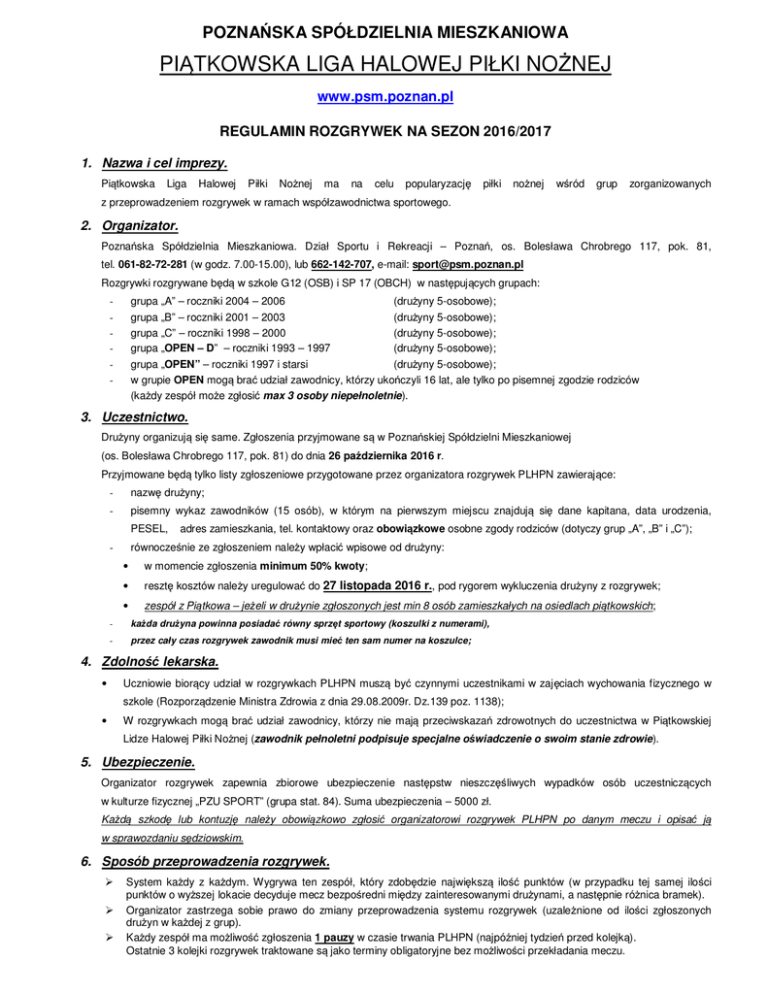 POZNAŃSKA SPÓŁDZIELNIA MIESZKANIOWA PIĄTKOWSKA LIGA HALOWEJ PIŁKI NOŻNEJ www.psm.poznan.pl REGULAMIN ROZGRYWEK NA SEZON 2016/2017 1. Nazwa i cel imprezy. Piątkowska Liga Halowej Piłki Nożnej ma na celu popularyzację piłki nożnej wśród grup zorganizowanych z przeprowadzeniem rozgrywek w ramach współzawodnictwa sportowego. 2. Organizator. Poznańska Spółdzielnia Mieszkaniowa. Dział Sportu i Rekreacji – Poznań, os. Bolesława Chrobrego 117, pok. 81, tel. 061-82-72-281 (w godz. 7.00-15.00), lub 662-142-707, e-mail: [email protected] Rozgrywki rozgrywane będą w szkole G12 (OSB) i SP 17 (OBCH) w następujących grupach: grupa „A” – roczniki 2004 – 2006 (drużyny 5-osobowe); grupa „B” – roczniki 2001 – 2003 (drużyny 5-osobowe); grupa „C” – roczniki 1998 – 2000 (drużyny 5-osobowe); grupa „OPEN – D” – roczniki 1993 – 1997 (drużyny 5-osobowe); grupa „OPEN” – roczniki 1997 i starsi (drużyny 5-osobowe); w grupie OPEN mogą brać udział zawodnicy, którzy ukończyli 16 lat, ale tylko po pisemnej zgodzie rodziców (każdy zespół może zgłosić max 3 osoby niepełnoletnie). - 3. Uczestnictwo. Drużyny organizują się same. Zgłoszenia przyjmowane są w Poznańskiej Spółdzielni Mieszkaniowej (os. Bolesława Chrobrego 117, pok. 81) do dnia 26 października 2016 r. Przyjmowane będą tylko listy zgłoszeniowe przygotowane przez organizatora rozgrywek PLHPN zawierające: - nazwę drużyny; - pisemny wykaz zawodników (15 osób), w którym na pierwszym miejscu znajdują się dane kapitana, data urodzenia, - równocześnie ze zgłoszeniem należy wpłacić wpisowe od drużyny: PESEL, adres zamieszkania, tel. kontaktowy oraz obowiązkowe osobne zgody rodziców (dotyczy grup „A”, „B” i „C”); • w momencie zgłoszenia minimum 50% kwoty; • resztę kosztów należy uregulować do 27 listopada 2016 r., pod rygorem wykluczenia drużyny z rozgrywek; • zespół z Piątkowa – jeżeli w drużynie zgłoszonych jest min 8 osób zamieszkałych na osiedlach piątkowskich; - każda drużyna powinna posiadać równy sprzęt sportowy (koszulki z numerami), - przez cały czas rozgrywek zawodnik musi mieć ten sam numer na koszulce; 4. Zdolność lekarska. • Uczniowie biorący udział w rozgrywkach PLHPN muszą być czynnymi uczestnikami w zajęciach wychowania fizycznego w szkole (Rozporządzenie Ministra Zdrowia z dnia 29.08.2009r. Dz.139 poz. 1138); • W rozgrywkach mogą brać udział zawodnicy, którzy nie mają przeciwskazań zdrowotnych do uczestnictwa w Piątkowskiej Lidze Halowej Piłki Nożnej (zawodnik pełnoletni podpisuje specjalne oświadczenie o swoim stanie zdrowie). 5. Ubezpieczenie. Organizator rozgrywek zapewnia zbiorowe ubezpieczenie następstw nieszczęśliwych wypadków osób uczestniczących w kulturze fizycznej „PZU SPORT” (grupa stat. 84). Suma ubezpieczenia – 5000 zł. Każdą szkodę lub kontuzję należy obowiązkowo zgłosić organizatorowi rozgrywek PLHPN po danym meczu i opisać ją w sprawozdaniu sędziowskim. 6. Sposób przeprowadzenia rozgrywek. System każdy z każdym. Wygrywa ten zespół, który zdobędzie największą ilość punktów (w przypadku tej samej ilości punktów o wyższej lokacie decyduje mecz bezpośredni między zainteresowanymi drużynami, a następnie różnica bramek). Organizator zastrzega sobie prawo do zmiany przeprowadzenia systemu rozgrywek (uzależnione od ilości zgłoszonych drużyn w każdej z grup). Każdy zespół ma możliwość zgłoszenia 1 pauzy w czasie trwania PLHPN (najpóźniej tydzień przed kolejką). Ostatnie 3 kolejki rozgrywek traktowane są jako terminy obligatoryjne bez możliwości przekładania meczu. 7. Nagrody. Sponsorem nagród jest Poznańska Spółdzielnia Mieszkaniowa, przewidziano nagrody dla zespołów za miejsca 1-3 (max dla 12 osób) oraz dla najlepszych strzelców w poszczególnych grupach. 8. Przepisy gry. - - - czas trwania meczu : 2 x 14 minut, 1 minuta przerwy; na salę wpuszczani są tylko i wyłącznie zawodnicy (z listy), trener lub opiekun zespołu, wszyscy w obuwiu sportowym; bramki 2 x 3 m; rzut karny z odległości 6m; dopuszczalne spóźnienie drużyny na mecz to 5 minut; linia boczna boiska to uderzenie piłki o ścianę; linia końcowa to linia bramkowa; na boisku gra pięciu zawodników, w tym bramkarz;; grę można rozpocząć w niepełnym składzie – zespół 4 osobowy; w czasie trwania meczu zespół musi liczyć minimum 3 zawodników na boisku; zmiany dowolne, powrotne w przerwie w grze („piłka martwa”) w strefie zmian (za swoimi bramkami); odbicie piłki od sufitu to rzut wolny pośredni; odbicie piłki od tablicy od kosza nad bramkami – rzut od bramki lub rzut z rogu; odbicie piłki od tablicy od kosza z boku sali – aut boczny (wybijany nogą); każde wznowienie gry musi nastąpić w ciągu 5 sekund. W przeciwnym razie rzut wolny pośredni dla drużyny przeciwnej; zakaz gry wślizgiem (dotyczy również ataku na samą piłkę w tzw. zasięgu gry) – rzut wolny bezpośredni, w polu karnym – rzut karny; rzut z autu – wznowienie gry następuje poprzez ustawienie piłki na linii autowej. bramkarz wznawia grę ręką z rzutu od bramki – piłka musi opuścić pole karne. Nie można przerzucić piłki przez linię środkową. Z akcji bramkarz może przerzucić piłkę przez środek boiska. Bramkarz nie może wrzucić piłki do bramki przeciwnika; bramkarz nie może chwytać piłki od swojego współpartnera z drużyny (rzut wolny pośredni); odległość muru od piłki minimum 3 metry; o zatrzymaniu czasu gry podczas rozgrywanego meczu decyduje tylko i wyłącznie sędzia zawodów. za nie sportowe zachowanie zawodnik może otrzymać: • w grupach A, B, C, OPEN – kary kartkowe (napomnienie lub wykluczenie): o za kartkę czerwoną zawodnik otrzymuje karę minimum 2 meczów (o długości kar decyduje organizator rozgrywek); o po otrzymaniu czerwonej kartki zawodnik musi opuścić salę i udać się do 