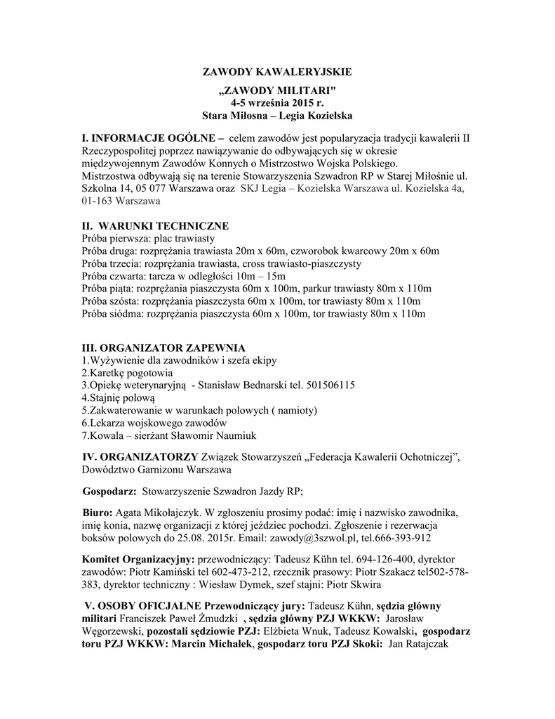 ZAWODY KAWALERYJSKIE „ZAWODY MILITARI" 4-5 września 2015 r. Stara Miłosna – Legia Kozielska I. INFORMACJE OGÓLNE – celem zawodów jest popularyzacja tradycji kawalerii II Rzeczypospolitej poprzez nawiązywanie do odbywających się w okresie międzywojennym Zawodów Konnych o Mistrzostwo Wojska Polskiego. Mistrzostwa odbywają się na terenie Stowarzyszenia Szwadron RP w Starej Miłośnie ul. Szkolna 14, 05 077 Warszawa oraz SKJ Legia – Kozielska Warszawa ul. Kozielska 4a, 01-163 Warszawa II. WARUNKI TECHNICZNE Próba pierwsza: plac trawiasty Próba druga: rozprężania trawiasta 20m x 60m, czworobok kwarcowy 20m x 60m Próba trzecia: rozprężania trawiasta, cross trawiasto-piaszczysty Próba czwarta: tarcza w odległości 10m – 15m Próba piąta: rozprężania piaszczysta 60m x 100m, parkur trawiasty 80m x 110m Próba szósta: rozprężania piaszczysta 60m x 100m, tor trawiasty 80m x 110m Próba siódma: rozprężania piaszczysta 60m x 100m, tor trawiasty 80m x 110m III. ORGANIZATOR ZAPEWNIA 1.Wyżywienie dla zawodników i szefa ekipy 2.Karetkę pogotowia 3.Opiekę weterynaryjną - Stanisław Bednarski tel. 501506115 4.Stajnię polową 5.Zakwaterowanie w warunkach polowych ( namioty) 6.Lekarza wojskowego zawodów 7.Kowala – sierżant Sławomir Naumiuk IV. ORGANIZATORZY Związek Stowarzyszeń „Federacja Kawalerii Ochotniczej”, Dowództwo Garnizonu Warszawa Gospodarz: Stowarzyszenie Szwadron Jazdy RP; Biuro: Agata Mikołajczyk. W zgłoszeniu prosimy podać: imię i nazwisko zawodnika, imię konia, nazwę organizacji z której jeździec pochodzi. Zgłoszenie i rezerwacja boksów polowych do 25.08. 2015r. Email: [email protected], tel.666-393-912 Komitet Organizacyjny: przewodniczący: Tadeusz Kühn tel. 694-126-400, dyrektor zawodów: Piotr Kamiński tel 602-473-212, rzecznik prasowy: Piotr Szakacz tel502-578383, dyrektor techniczny : Wiesław Dymek, szef stajni: Piotr Skwira V. OSOBY OFICJALNE Przewodniczący jury: Tadeusz Kühn, sędzia główny militari Franciszek Paweł Żmudzki , sędzia główny PZJ WKKW: Jarosław Węgorzewski, pozostali sędziowie PZJ: Elżbieta Wnuk, Tadeusz Kowalski, gospodarz toru PZJ WKKW: Marcin Michałek, gospodarz toru PZJ Skoki: Jan Ratajczak Sędzia prób kawaleryjskich – Robert Woronowicz; komisja odwoławcza: Piotr Szakacz – przewodniczący, Adam Sujecki VI. PROGRAM ZAWODÓW 4 września 2015r. - Stara Miłosna 5 września 2015r. - Legia Kozielska Godz. 8:00- odprawa techniczna Godz. 8:00 – przegląd weterynaryjny Godz. 9:00 – przegląd weterynaryjny Godz. 9:00 - próba piąta – skoki przez Godz.10:00 – próba pierwsza – ocena przeszkody parkur klasa L wyglądu konia, rzędu i jeźdźca Godz. 10:30 próba szósta - władanie Godz. 10:30 – próba druga – ujeżdżenie szablą konno wg klasy L program wkkw Godz. 11:30 - próba siódma władanie Godz. 12:00 – próba trzecia– jazda terenowa lancą konno przez przeszkody (cross) wg klasy L WKKW Godz. 20:00 - wręczenie nagród Godz. 13:00 - próba czwarta – strzelanie z pozycji stojącej, bron długa Godziny rozpoczęcia prób mogą ulec zmianie ze względu na liczbę startujących zawodników. VII. NAGRODY Dla zwycięzców indywidualnych przewidziane są nagrody honorowe i rzeczowe. Zwycięzcy muszą uzyskać łącznie najmniej punktów karnych ze wszystkich 7 prób. VIII. INFORMACJE DODATKOWE Uczestnicy biorący udział na więcej niż jednym koniu, do klasyfikacji mistrzostw militarii, zobowiązani są do wyznaczenia konia na którym będą klasyfikowani. Przejazd na drugim koniu będzie traktowany jako przejazd szkoleniowy, będzie podlegał ocenie lecz nie będzie uwzględniany w klasyfikacji generalnej militarii. Przejazdy te będą ustawiane na listach startowych po wszystkich przejazdach branych pod uwagę w klasyfikacji generalnej. Uczestnik bierze całkowitą odpowiedzialność za zdrowie swoje i konia. Organizator nie ponosi żadnej odpowiedzialności w razie wypadków i zachorowań uczestnika, luzaków i koni, jak również w przypadku kradzieży, zniszczenia, pożarów i innych zdarzeń losowych podczas Zawodów lub transportu. Organizator zastrzega sobie prawo zmian w programie Zawodów. Zawody rozgrywane zgodnie z Przepisami i Regulaminem PZJ oraz Regulaminem Rozgrywania Zawodów FKO. Zawodników i konie obowiązuje dokumentacja wg regulaminów i przepisów PZJ. Konkursy towarzyskie rozgrywaną są zgodnie z Uchwałą PZJ z dnia 06.12.2013 oraz z równą dbałością o konie, zawodników i rywalizację sportową . Wymagany jest paszport urzędowy konia i szczepienia konia. Uczestników konkursów towarzyskich obowiązują orzeczenia lekarskie dopuszczające do uprawiania jeździectwa, ubezpieczenie NNW oraz w przypadku osób niepełnoletnich zgoda rodziców lub opiekunów prawnych. Wstęp na teren zawodów bezpłatny KODEKS POSTĘPOWANIA Z KONIEM Polski Związek Jeździecki w ślad za Międzynarodową Federacją Jeździecką FEI oczekuje, że wszystkie osoby zaangażowane w jakikolwiek sposób w sporty konne, będą przestrzegać zasad niniejszego Kodeksu Postępowania z Koniem oraz przyjmą do wiadomości, że w każdym przypadku dobro konia musi być sprawą nadrzędną i nigdy nie może być podporządkowane współzawodnictwu sportowemu ani celom komercyjnym. Na wszystkich etapach treningu i przygotowań konia do startu w zawodach, dobro konia musi stać ponad wszelkimi innymi wymaganiami. Dotyczy to stałej opieki, metod treningu, starannego obrządku, kucia i transportu. Konie i jeźdźcy muszą być wytrenowani, kompetentni i zdrowi zanim wezmą udział w zawodach. Odnosi się to także do podawania leków i środków medycznych, zabiegów chirurgicznych zagrażających dobru konia lub ciąży klaczy, oraz do przypadków nadużywania pomocy medycznej. Zawody nie mogą zagrażać dobru konia. Wymaga to zwrócenia szczególnej uwagi na teren zawodów, powierzchnię podłoża, pogodę , warunki stajenne, kondycję koni i ich bezpieczeństwo także p