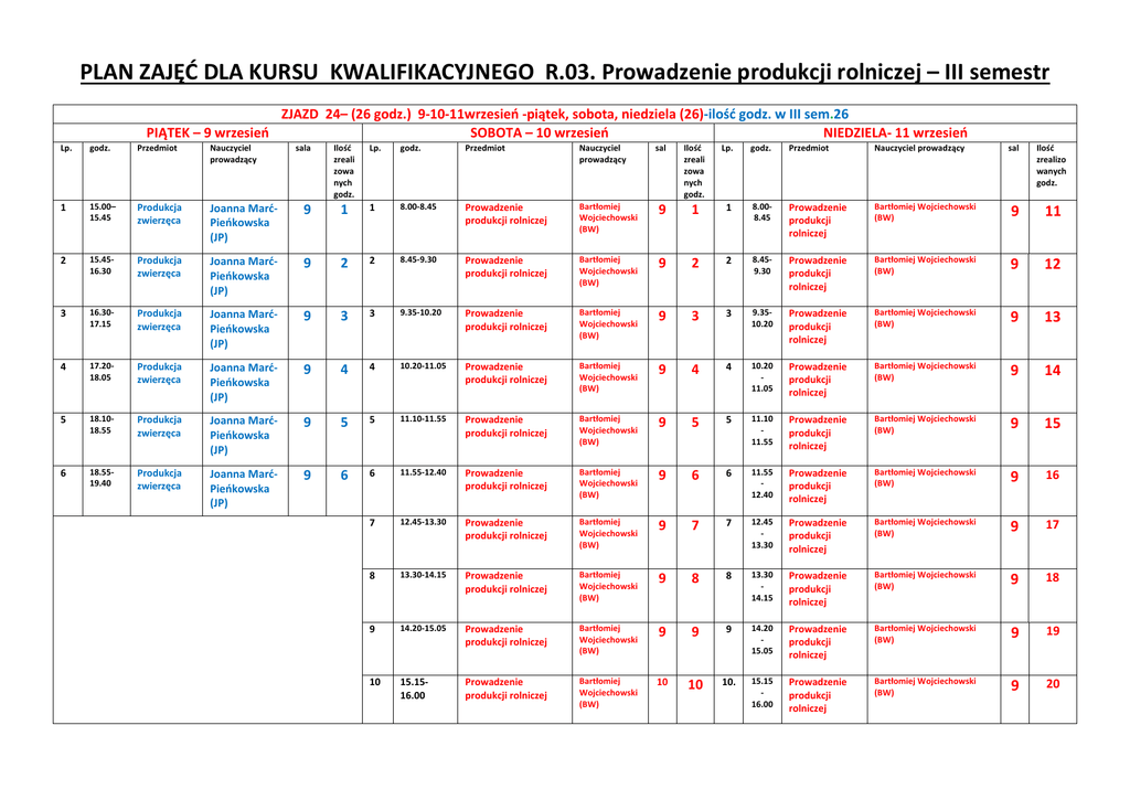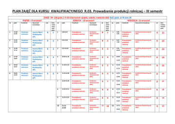 PLAN ZAJĘĆ DLA KURSU KWALIFIKACYJNEGO R.03. Prowadzenie produkcji rolniczej – III semestr PIĄTEK – 9 wrzesień ZJAZD 24– (26 godz.) 9-10-11wrzesień -piątek, sobota, niedziela (26)-ilość godz. w III sem.26 SOBOTA – 10 wrzesień NIEDZIELA- 11 wrzesień Lp. godz. Przedmiot Nauczyciel prowadzący sala 1 15.00– 15.45 Produkcja zwierzęca Joanna MarćPieńkowska (JP) 9 2 15.4516.30 Produkcja zwierzęca Joanna MarćPieńkowska (JP) 3 16.3017.15 Produkcja zwierzęca 4 17.2018.05 5 6 Ilość zreali zowa nych godz. Lp. godz. Przedmiot Nauczyciel prowadzący sal Ilość zreali zowa nych godz. Lp. godz. Przedmiot Nauczyciel prowadzący sal Ilość zrealizo wanych godz. 1 1 8.00-8.45 Prowadzenie produkcji rolniczej Bartłomiej Wojciechowski (BW) 9 1 1 8.008.45 Prowadzenie produkcji rolniczej Bartłomiej Wojciechowski (BW) 9 11 9 2 2 8.45-9.30 Prowadzenie produkcji rolniczej Bartłomiej Wojciechowski (BW) 9 2 2 8.459.30 Prowadzenie produkcji rolniczej Bartłomiej Wojciechowski (BW) 9 12 Joanna MarćPieńkowska (JP) 9 3 3 9.35-10.20 Prowadzenie produkcji rolniczej Bartłomiej Wojciechowski (BW) 9 3 3 9.3510.20 Prowadzenie produkcji rolniczej Bartłomiej Wojciechowski (BW) 9 13 Produkcja zwierzęca Joanna MarćPieńkowska (JP) 9 4 4 10.20-11.05 Prowadzenie produkcji rolniczej Bartłomiej Wojciechowski (BW) 9 4 4 10.20 11.05 Prowadzenie produkcji rolniczej Bartłomiej Wojciechowski (BW) 9 14 18.1018.55 Produkcja zwierzęca Joanna MarćPieńkowska (JP) 9 5 5 11.10-11.55 Prowadzenie produkcji rolniczej Bartłomiej Wojciechowski (BW) 9 5 5 11.10 11.55 Prowadzenie produkcji rolniczej Bartłomiej Wojciechowski (BW) 9 15 18.5519.40 Produkcja zwierzęca Joanna MarćPieńkowska (JP) 9 6 6 11.55-12.40 Prowadzenie produkcji rolniczej Bartłomiej Wojciechowski (BW) 9 6 6 11.55 12.40 Prowadzenie produkcji rolniczej Bartłomiej Wojciechowski (BW) 9 16 7 12.45-13.30 Prowadzenie produkcji rolniczej Bartłomiej Wojciechowski (BW) 9 7 7 12.45 13.30 Prowadzenie produkcji rolniczej Bartłomiej Wojciechowski (BW) 9 17 8 13.30-14.15 Prowadzenie produkcji rolniczej Bartłomiej Wojciechowski (BW) 9 8 8 13.30 14.15 Prowadzenie produkcji rolniczej Bartłomiej Wojciechowski (BW) 9 18 9 14.20-15.05 Prowadzenie produkcji rolniczej Bartłomiej Wojciechowski (BW) 9 9 9 14.20 15.05 Prowadzenie produkcji rolniczej Bartłomiej Wojciechowski (BW) 9 19 10 15.1516.00 Prowadzenie produkcji rolniczej Bartłomiej Wojciechowski (BW) 10 10 10. 15.15 16.00 Prowadzenie produkcji rolniczej Bartłomiej Wojciechowski (BW) 9 20 PIĄTEK – 23 wrzesień Lp. godz. Przedmiot Nauczyciel prowadzący 1 15.00– 15.45 Produkcja zwierzęca 2 15.4516.30 Produkcja zwierzęca 3 16.3017.15 Produkcja zwierzęca 4 17.2018.05 Produkcja zwierzęca 5 18.1018.55 Produkcja zwierzęca 6 18.5519.40 Produkcja zwierzęca Joanna MarćPieńkowska (JP) Joanna MarćPieńkowska (JP) Joanna MarćPieńkowska (JP) Joanna MarćPieńkowska (JP) Joanna MarćPieńkowska (JP) Joanna MarćPieńkowska (JP) ZJAZD 25– (26 godz.) 23-24-25 wrzesień-piątek, sobota, niedziela (26)-ilość godz. w III sem.52 SOBOTA – 24 wrzesień NIEDZIELA- 25 wrzesień sala Ilość zreali zowa nych godz. Lp. godz. Przedmiot Nauczyciel prowadzący sal Ilość zreali zowa nych godz. Lp. godz. Przedmiot Nauczyciel prowadzący sal Ilość zrealizo wanych godz. Agnieszka Krusik (AK) 9 6 9 7 1 8.00-8.45 Język angielski zawodowy Damian Poniewierski (DP) 9 1 1 8.008.45 Działalność gospodarcza w rolnictwie 9 8 2 8.45-9.30 Język angielski zawodowy Damian Poniewierski (DP) 9 2 2 8.459.30 Działalność gospodarcza w rolnictwie Agnieszka Krusik (AK) 9 7 9 9 3 9.35-10.20 Język angielski zawodowy Damian Poniewierski (DP) 9 3 3 9.3510.20 Działalność gospodarcza w rolnictwie Agnieszka Krusik (AK) 9 8 9 10 4 10.20-11.05 Język angielski zawodowy Damian Poniewierski (DP) 9 4 4 10.20 11.05 Działalność gospodarcza w rolnictwie Agnieszka Krusik (AK) 9 9 9 11 5 11.10-11.55 Język angielski zawodowy Damian Poniewierski (DP) 9 5 5 11.10 11.55 Działalność gospodarcza w rolnictwie Agnieszka Krusik (AK) 9 10 9 12 6 11.55-12.40 Działalność gospodarcza w rolnictwie Agnieszka Krusik (AK) 9 1 6 11.55 12.40 Język angielski zawodowy Damian Poniewierski (DP) 9 6 7 12.45-13.30 Agnieszka Krusik (AK) 9 2 7 12.45 13.30 Język angielski zawodowy Damian Poniewierski (DP) 9 7 8 13.30-14.15 Agnieszka Krusik (AK) 9 3 8 13.30 14.15 Język angielski zawodowy Damian Poniewierski (DP) 9 8 9 14.20-15.05 Agnieszka Krusik (AK) 9 4 9 14.20 15.05 Język angielski zawodowy Damian Poniewierski (DP) 9 9 10 15.1516.00 Działalność gospodarcza w rolnictwie Działalność gospodarcza w rolnictwie Działalność gospodarcza w rolnictwie Działalność gospodarcza w rolnictwie Agnieszka Krusik (AK) 9 5 10 15.15 16.00 Język angielski zawodowy Damian Poniewierski (DP) 9 10 ZJAZD 26– (27 godz.) 7-8-9 październik -piątek, sobota, niedziela (27)-ilość godz. w III sem.79 PIĄTEK – 7 październik SOBOTA – 8 październik NIEDZIELA- 9 październik Lp. godz. Przedmiot Nauczyciel prowadzący sala Ilość zreali zowa nych godz. Lp. godz. Joanna MarćPieńkowska (JP) Joanna MarćPieńkowska (JP) Joanna MarćPieńkowska (JP) Joanna MarćPieńkowska (JP) 9 13 1 8.00-8.45 9 14 2 9 15 9 Przedmiot Nauczyciel prowadzący sal Ilość zreali zowa nych godz. Lp. godz. Język angielski zawodowy Damian Poniewierski (DP) 9 11 1 8.008.45 8.45-9.30 Język angielski zawodowy j Damian Poniewierski (DP) 9 12 2 3 9.35-10.20 Język angielski zawodowy Damian Poniewierski (DP) 9 13 16 4 10.20-11.05 Prowadzenie produkcji rolniczej Bartłomiej Wojciechowski (BW) 9 Przedmiot Nauczyciel prowadzący sal Ilość zrealizo wanych godz. Produkcja roślinna Bartłomiej Wojciechowski (BW) 9 1 8.459.30 Produkcja roślinna Bartłomiej Wojciechowski (BW) 9 2 3 9.3510.20 Produkcja roślinna Bartłomiej Wojciechowski (BW) 9 3 21 4 10.20 11.05 Produkcja roślinna Bartłomiej Wojciechowski (BW) 9 4 1 15.00– 15.45 Produkcja zwierzęca 2 15.4516.30 Produkcja zwierz