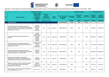 Załącznik 1. Harmonogram rzeczowo-finansowy realizacji działań ujętych w Planie gospodarki niskoemisyjnej Gminy Miasta Toruń na lata 2015 - 2020 Planowane działania Nr Główne działania Odpowiedzialn y dział, osoba lub firma (w przypadku zaangażowani a osób trzecich) Wdrożenie [termin rozpoczęcia i zakończenia] Początek Stan realizacji 1 Wytwarzanie energii odnawialnej Redukcja emisji CO2 Wskaźnik kosztowy [zł/MWh] Wskaźnik kosztowy [zł/MgCO2] [MWh/r] [MWh/r] [Mg CO2/r] [zł/MWh] [zł/MgCO2] 154 670 000,00 zł 17 579 729 6 753 Szacowane koszty Oszczędnoś na realizację ci energii działania Koniec BUDOWNICTWO Poprawa efektywności energetycznej poprzez termomodernizację i wykorzystanie OZE w obiektach użyteczności publicznej, w placówkach oświatowych i rekreacyjnych w Toruniu Wskaźniki kosztowe Oczekiwane efekty Wydział Gospodarki Komunalnej, Wydział Inwestycji i Remontów 2015 2018 realizowane 19 000 000,00 zł 5 000 200 1 134 3 800,00 zł 16 754,85 zł Wydział Środowiska i Zieleni, Wydział Inwestycji i Remontów, Zarządcy spółdzielni, wspólnot 2016 2020+ nierozpoczęte 7 500 000,00 zł 2 900 61 1 180 2 586,21 zł 6 355,93 zł 2 Termomodernizacja budynków mieszkalnych – Kawka II 3 Poprawa efektywności energetycznej poprzez termomodernizację i wykorzystanie OZE w sektorze mieszkalnym w Toruniu Wydział Inwestycji i Remontów, Zakład Gospodarki Mieszkaniowej 2016 2020 nierozpoczęte 96 400 000,00 zł 3 034 368 692 31 773,24 zł 139 306,36 zł 4 Poprawa efektywności energetycznej poprzez termomodernizację i wykorzystanie OZE w obiektach użyteczności publicznej – budynki UMK Uniwersytet Mikołaja Kopernika w Toruniu 2016 2020 nierozpoczęte 5 250 000,00 zł 500 100 20 10 500,00 zł 262 500,00 zł 5 Oprogramowanie (platforma) do zdalnego i automatycznego odczytu i archiwizowania danych dotyczących zużycia energii w obiektach gminnych Wydział Gospodarki Komunalnej 2016 2017 realizowane 1 500 000,00 zł 1 700 580 882,35 zł 2 586,21 zł 6 Stopniowa wymiana w biurach sprzętu biurowego (ITC), urządzeń elektrycznych (klimatyzatory, podgrzewacze wody, AGD) Zarządcy placówek, instytucji, Urząd Miasta Toruń 2015 2020 realizowane 12 600 000,00 zł 3 354 2 723 3 756,71 zł 4 627,25 zł 7 Zmiana sposobu zasilania budynków podłączonych do sieci zakładowej c.o., c.w.u. EDF Toruń S.A. 2017 2023 realizowane 420 000,00 zł 631 245 665,61 zł 1 714,29 zł 8 Termomodernizacja budynków rozdzielni ciepła i przewiązki EDF Toruń S.A. 2017 2023 nierozpoczęte 4 000 000,00 zł 260 101 15 384,62 zł 39 603,96 zł 9 Rozbudowa systemów zdalnego odczytu, monitoringu i sterowania oraz zarządzania zużyciem mediów u klientów podłączonych do sieci ciepłowniczej EDF Toruń S.A. 2016 2023 nierozpoczęte 8 000 000,00 zł 200 78 40 000,00 zł 102 564,10 zł 814 760 000,00 zł 501 379 ENERGETYKA - 173 756 10 Zastosowanie energooszczędnych rozwiązań w zakresie oświetlenia obiektów EDF Toruń S.A. 2016 2023 nierozpoczęte 8 000 000,00 zł 25 21 320 000,00 zł 380 952,38 zł 11 Zmniejszenie niskiej emisji na terenie Torunia EDF Toruń S.A. 2017 2023 nierozpoczęte 5 450 000,00 zł 5 271 1 694 1 033,96 zł 3 217,24 zł 12 Przyłączenie obiektów do sieci ciepłowniczej, w celu zwiększenia wykorzystania wysokosprawnej kogeneracji EDF Toruń S.A. 2017 2023 nierozpoczęte 36 370 000,00 zł 4 505 1 337 8 073,25 zł 27 202,69 zł 13 Budowa sieci ciepłowniczej zasilającej m.in. budynki mieszkalne i placówki systemu oświaty miasta Torunia Geotermia Toruń Sp. z o.o. 2015 2020 realizowane 22 040 000,00 zł 1 700 631 12 964,71 zł 34 928,68 zł 14 Budowa bloków kogeneracyjnych - gazowych GT50 i kotłów szczytowo – rezerwowych HOB Spółka celowa EDF Polska i PIR na rzecz EDF Toruń S.A. 2014 2017 realizowane 550 000 000,00 zł 425 121 144 116 1 293,75 zł 3 816,37 zł 15 Budowa pierścienia dn 500 „Bielawy-Skarpa” od źródła EC1 do komory S16s EDF Toruń S.A. 2016 2023 nierozpoczęte 35 240 000,00 zł 2 657 1 034 13 263,08 zł 34 081,24 zł 16 Budowa lokalnych źródeł (w tym kogeneracyjnych) i lokalnych sieci na terenach nie objętych miejską siecią ciepłowniczą EDF Toruń S.A. 2015 2022 realizowane 32 000 000,00 zł 24 892 9 683 1 285,55 zł 3 304,76 zł 17 Modernizacja węzłów indywidualnych EDF Toruń S.A. 2018 2023 nierozpoczęte 4 960 000,00 zł 1 237 410 4 009,70 zł 12 097,56 zł 18 Modernizacja grupowych węzłów cieplnych i budowa węzłów indywidualnych EDF Toruń S.A. 2018 2023 nierozpoczęte 16 120 000,00 zł 4 443 1 488 3 628,18 zł 10 833,33 zł 19 Modernizacja odcinka wyprowadzenia sieci na terenie EC1 EDF Toruń S.A. 2017 2023 nierozpoczęte 1 030 000,00 zł 164 64 6 280,49 zł 16 093,75 zł 20 Termomodernizacja rurociągów DN600 EDF Toruń S.A. 2017 2023 nierozpoczęte 400 000,00 zł 618 240 647,25 zł 1 666,67 zł 21 Ograniczenie potrzeb własnych w zakresie zużycia energii elektrycznej EDF Toruń S.A. 2016 2020 nierozpoczęte 2 000 000,00 zł 30 12 66 666,67 zł 166 666,67 zł 22 Budowa węzłów cieplno-chłodniczych EDF Toruń S.A. 2016 2023 nierozpoczęte 7 000 000,00 zł Nie oszacowano Nie oszacowano 23 Wymiana sieci ciepłowniczej wraz z optymalizacją średnic. Modernizacja sieci magistralnej, rozdzielczej wraz z przyłączami EDF Toruń S.A. 2018 2030 nierozpoczęte TRANSPORT 94 150 000,00 zł 30 716 2 846 100 000,00 zł 45 596 - 12 496 - Gmina Miasta Toruń, Miejski Zakład Komunikacji Sp. z o.o., Miejski Zarząd Dróg w Toruniu, Województwo KujawskoPomorskie, PKP S.A., PKP PLK S.A. 2015 2022 realizowane 1 500 000 000,00 zł 30721 3 065,18 zł 7 227,85 zł 8662 48 826,54 zł 173 170,17 zł 13 026 24 Projekt BiT-City II 25 Usprawnienie połączeń w sieci TEN-T w Toruniu. Podprojekt 1: Nowy przebieg drogi krajowej nr 91 w granicach administracyjnych Torunia – kontynuacja Miejski Zarząd Dróg w Toruniu 2011 2020 realizowane 687 000 000,00 zł 2 080 536 330 288,46 zł 1 281 716,42 zł 26 Usprawnienie poł