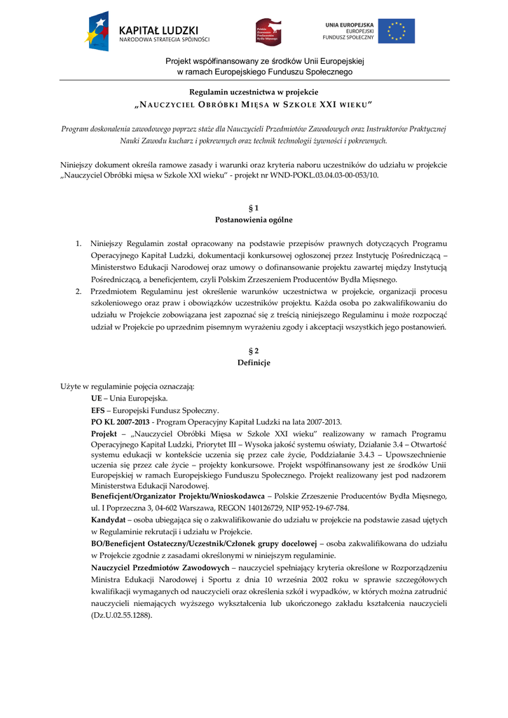 Projekt współfinansowany ze środków Unii Europejskiej w ramach Europejskiego Funduszu Społecznego Regulamin uczestnictwa w projekcie „N A U C Z Y C I E L O B R Ó B K I M I Ę S A W S Z K O L E XXI W IE K U ” Program doskonalenia zawodowego poprzez staże dla Nauczycieli Przedmiotów Zawodowych oraz Instruktorów Praktycznej Nauki Zawodu kucharz i pokrewnych oraz technik technologii żywności i pokrewnych. Niniejszy dokument określa ramowe zasady i warunki oraz kryteria naboru uczestników do udziału w projekcie „Nauczyciel Obróbki mięsa w Szkole XXI wieku” - projekt nr WND-POKL.03.04.03-00-053/10. §1 Postanowienia ogólne 1. Niniejszy Regulamin został opracowany na podstawie przepisów prawnych dotyczących Programu Operacyjnego Kapitał Ludzki, dokumentacji konkursowej ogłoszonej przez Instytucję Pośredniczącą – Ministerstwo Edukacji Narodowej oraz umowy o dofinansowanie projektu zawartej między Instytucją Pośredniczącą, a beneficjentem, czyli Polskim Zrzeszeniem Producentów Bydła Mięsnego. 2. Przedmiotem Regulaminu jest określenie warunków uczestnictwa w projekcie, organizacji procesu szkoleniowego oraz praw i obowiązków uczestników projektu. Każda osoba po zakwalifikowaniu do udziału w Projekcie zobowiązana jest zapoznać się z treścią niniejszego Regulaminu i może rozpocząć udział w Projekcie po uprzednim pisemnym wyrażeniu zgody i akceptacji wszystkich jego postanowień. §2 Definicje Użyte w regulaminie pojęcia oznaczają: UE – Unia Europejska. EFS – Europejski Fundusz Społeczny. PO KL 2007-2013 - Program Operacyjny Kapitał Ludzki na lata 2007-2013. Projekt – „Nauczyciel Obróbki Mięsa w Szkole XXI wieku” realizowany w ramach Programu Operacyjnego Kapitał Ludzki, Priorytet III – Wysoka jakość systemu oświaty, Działanie 3.4 – Otwartość systemu edukacji w kontekście uczenia się przez całe życie, Poddziałanie 3.4.3 – Upowszechnienie uczenia się przez całe życie – projekty konkursowe. Projekt współfinansowany jest ze środków Unii Europejskiej w ramach Europejskiego Funduszu Społecznego. Projekt realizowany jest pod nadzorem Ministerstwa Edukacji Narodowej. Beneficjent/Organizator Projektu/Wnioskodawca – Polskie Zrzeszenie Producentów Bydła Mięsnego, ul. I Poprzeczna 3, 04-602 Warszawa, REGON 140126729, NIP 952-19-67-784. Kandydat – osoba ubiegająca się o zakwalifikowanie do udziału w projekcie na podstawie zasad ujętych w Regulaminie rekrutacji i udziału w Projekcie. BO/Beneficjent Ostateczny/Uczestnik/Członek grupy docelowej – osoba zakwalifikowana do udziału w Projekcie zgodnie z zasadami określonymi w niniejszym regulaminie. Nauczyciel Przedmiotów Zawodowych – nauczyciel spełniający kryteria określone w Rozporządzeniu Ministra Edukacji Narodowej i Sportu z dnia 10 września 2002 roku w sprawie szczegółowych kwalifikacji wymaganych od nauczycieli oraz określenia szkół i wypadków, w których można zatrudnić nauczycieli niemających wyższego wykształcenia lub ukończonego zakładu kształcenia nauczycieli (Dz.U.02.55.1288). Projekt współfinansowany ze środków Unii Europejskiej w ramach Europejskiego Funduszu Społecznego Instruktor Praktycznej Nauki Zawodu – instruktor spełniający wymogi określone w Rozporządzeniu Ministra Edukacji Narodowej i Sportu z dnia 1 lipca 2002 roku w sprawie praktycznej nauki zawodu (Dz.U.03.192.1875 ze zm. Dz.U.03.192.1875). Zawody pokrewne zawodu kucharz oraz technik technologii żywności – kucharz, kucharz małej gastronomii, technik technologii żywienia i gospodarstwa domowego, technik technologii żywności, dietetyk, rzeźnik-wędliniarz, operator maszyn i urządzeń przemysłu spożywczego, technik organizacji usług gastronomicznych i innych związanych z gastronomią zgodnie z Dz.U.07.124.860. Doskonalenie zawodowe - proces aktualizowania i pogłębiania wiedzy i umiejętności związanych z wykonywanym zawodem. W ramach niniejszego projektu doskonalenie zawodowe będzie realizowane poprzez praktyki. Biuro Projektu – siedziba Organizatora, adres do korespondencji: ul. Niepodległości 53/55, 10-044 Olsztyn. Adres email rekrutacji: [email protected] Strona internetowa: www.irafood.eu Numer faksu biura projektu: (022) 378 14 34 Telefon osoby odpowiedzialnej za rekrutację: 0 503 781 579 §3 Ogólne założenia projektu 1. Projekt przewiduje realizację programu doskonalenia zawodowego dla uczestników z terenu całej 2. Projekt ma na celu podniesienie poziomu kwalifikacji praktycznych i dydaktycznych Beneficjentów Polski. Ostatecznych oraz po uwzględnieniu wyników ewaluacji wypracowanie modelu doskonalenia zawodowego w przedsiębiorstwach. 3. Projekt jest adresowany do Nauczycieli Przedmiotów Zawodowych oraz Instruktorów Praktycznej Nauki Zawodu kucharz i pokrewnych oraz technik technologii żywności i pokrewnych zgodnie z rozporządzeniem Ministra Edukacji Narodowej z dnia 26 czerwca 2007 r. w sprawie klasyfikacji zawodów szkolnictwa zawodowego (Dz.U. z 2007 r., nr 124, poz. 860). 4. Realizacja programu doskonalenia zawodowego obejmować będzie następujące zadania: • rejestracja techniką wideo zajęć z nauki zawodu prowadzonych przez BO w miejscu jego pracy • przeprowadzenie ankiety oceniającej Nauczyciela Przedmiotów Zawodowych/Instruktora (w szkole lub na warsztatach), przed oraz po odbyciu praktyk, Praktycznej Nauki Zawodu przez uczniów biorących udział w zajęciach praktycznych prowadzonych przez BO, przed oraz po odbyciu praktyk, • przeprowadzenie testu wiedzy teoretycznej i praktycznej z zakresu technologii obróbki mięsa, • przeprowadzenie • odbycie przez BO dwutygodniowych praktyk w profesjonalnie zarządzanych mikro, małych i przez BO, przed oraz po odbyciu praktyk, prezentacji dydaktycznej dotyczącej instruktarzu wykonania potrawy/czynności kulinarnej przez BO, przed oraz po odbyciu praktyk, średnich przedsiębiorstwach. 5. Projekt doskonalenia zawodowego zakłada udz