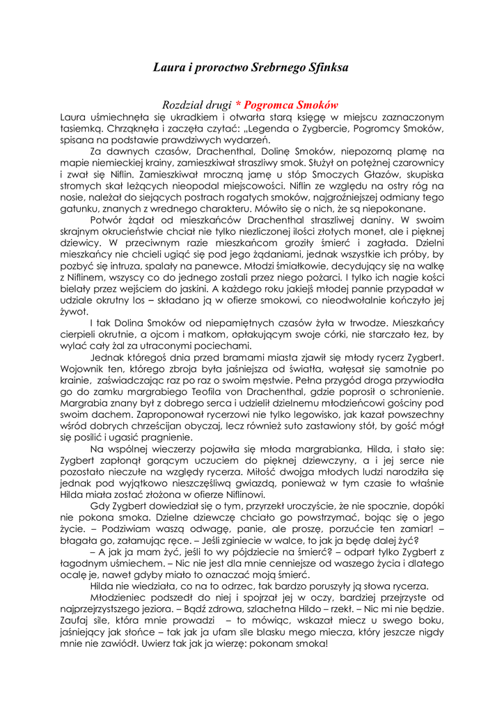 Laura i proroctwo Srebrnego Sfinksa Rozdział drugi * Pogromca Smoków Laura uśmiechnęła się ukradkiem i otwarła starą księgę w miejscu zaznaczonym tasiemką. Chrząknęła i zaczęła czytać: „Legenda o Zygbercie, Pogromcy Smoków, spisana na podstawie prawdziwych wydarzeń. Za dawnych czasów, Drachenthal, Dolinę Smoków, niepozorną plamę na mapie niemieckiej krainy, zamieszkiwał straszliwy smok. Służył on potężnej czarownicy i zwał się Niflin. Zamieszkiwał mroczną jamę u stóp Smoczych Głazów, skupiska stromych skał leżących nieopodal miejscowości. Niflin ze względu na ostry róg na nosie, należał do siejących postrach rogatych smoków, najgroźniejszej odmiany tego gatunku, znanych z wrednego charakteru. Mówiło się o nich, że są niepokonane. Potwór żądał od mieszkańców Drachenthal straszliwej daniny. W swoim skrajnym okrucieństwie chciał nie tylko niezliczonej ilości złotych monet, ale i pięknej dziewicy. W przeciwnym razie mieszkańcom groziły śmierć i zagłada. Dzielni mieszkańcy nie chcieli ugiąć się pod jego żądaniami, jednak wszystkie ich próby, by pozbyć się intruza, spalały na panewce. Młodzi śmiałkowie, decydujący się na walkę z Niflinem, wszyscy co do jednego zostali przez niego pożarci. I tylko ich nagie kości bielały przez wejściem do jaskini. A każdego roku jakiejś młodej pannie przypadał w udziale okrutny los – składano ją w ofierze smokowi, co nieodwołalnie kończyło jej żywot. I tak Dolina Smoków od niepamiętnych czasów żyła w trwodze. Mieszkańcy cierpieli okrutnie, a ojcom i matkom, opłakującym swoje córki, nie starczało łez, by wylać cały żal za utraconymi pociechami. Jednak któregoś dnia przed bramami miasta zjawił się młody rycerz Zygbert. Wojownik ten, którego zbroja była jaśniejsza od światła, wałęsał się samotnie po krainie, zaświadczając raz po raz o swoim męstwie. Pełna przygód droga przywiodła go do zamku margrabiego Teofila von Drachenthal, gdzie poprosił o schronienie. Margrabia znany był z dobrego serca i udzielił dzielnemu młodzieńcowi gościny pod swoim dachem. Zaproponował rycerzowi nie tylko legowisko, jak kazał powszechny wśród dobrych chrześcijan obyczaj, lecz również suto zastawiony stół, by gość mógł się posilić i ugasić pragnienie. Na wspólnej wieczerzy pojawiła się młoda margrabianka, Hilda, i stało się: Zygbert zapłonął gorącym uczuciem do pięknej dziewczyny, a i jej serce nie pozostało nieczułe na względy rycerza. Miłość dwojga młodych ludzi narodziła się jednak pod wyjątkowo nieszczęśliwą gwiazdą, ponieważ w tym czasie to właśnie Hilda miała zostać złożona w ofierze Niflinowi. Gdy Zygbert dowiedział się o tym, przyrzekł uroczyście, że nie spocznie, dopóki nie pokona smoka. Dzielne dziewczę chciało go powstrzymać, bojąc się o jego życie. – Podziwiam waszą odwagę, panie, ale proszę, porzućcie ten zamiar! – błagała go, załamując ręce. – Jeśli zginiecie w walce, to jak ja będę dalej żyć? – A jak ja mam żyć, jeśli to wy pójdziecie na śmierć? – odparł tylko Zygbert z łagodnym uśmiechem. – Nic nie jest dla mnie cenniejsze od waszego życia i dlatego ocalę je, nawet gdyby miało to oznaczać moją śmierć. Hilda nie wiedziała, co na to odrzec, tak bardzo poruszyły ją słowa rycerza. Młodzieniec podszedł do niej i spojrzał jej w oczy, bardziej przejrzyste od najprzejrzystszego jeziora. – Bądź zdrowa, szlachetna Hildo – rzekł. – Nic mi nie będzie. Zaufaj sile, która mnie prowadzi – to mówiąc, wskazał miecz u swego boku, jaśniejący jak słońce – tak jak ja ufam sile blasku mego miecza, który jeszcze nigdy mnie nie zawiódł. Uwierz tak jak ja wierzę: pokonam smoka! Następnego ranka, ledwie na horyzoncie zamajaczyło słońce, Zygbert osiodłał białego konia Granira, pożegnał się z margrabią i z jego córką, po czym udał się ku Smoczym Głazom. Potwór już czekał przy wejściu do jaskini. Wpatrywał się ponuro w piętrzące się przed pieczarą kości. Gdy zorientował się, że młodzieniec w lśniącej białej zbroi nie zamierza przekazać mu sakiewki ze złotymi monetami i pięknej dziewicy, ruszył ku niemu co sił. Ryk potwora dotarł nawet do uliczek Drachenthal, a płomienie zionące z ogromnej paszczy były tak gorące, że okoliczne skały zaczęły topić się jak masło. I choć Zygbert jeszcze nigdy w życiu nie stał oko w oko z tak przeraźliwą bestią, nie dał się zastraszyć. Niezłomny rycerz ruszył do walki z potworem. Chwycił włócznię, by cisnąć ją smokowi w paszczę, gdy wtem spostrzegł mnóstwo rozrzuconych na ziemi i połamanych lanc swoich nieszczęsnych poprzedników. Zaprawiony w bojach Zygbert natychmiast postanowił wykorzystać inną metodę walki: chroniąc się za tarczą, wykutą przed wiekami przez wielkoludy, wymykał się palącym językom ognia, którymi smok próbował go pokonać. Zwinnie skakał z jednej strony na drugą, tak że Niflinowi niemal zakręciło się od tego w głowie. Wykorzystując schronienie za rozsianymi na ziemi odłamkami skalnymi, rycerz coraz bliżej podchodził do potwora. Jednak smok zdawał się domyślać, co knuje Zygbert. A może to czarownica, jego pani, podsunęła mu tę myśl? Tak czy owak, Niflin przestał ziać ogniem, a zamiast tego z jego nozdrzy zaczął się wydobywać siarkowy dym, cuchnący zarazą i śmiercią. I nim kłęby dymu dotarły do Zygberta, już padł on bez życia na ziemię”. – Co? – pełen niedowierzania głos Franceski Turini przerwał głuchą ciszę. – Nie, no w to to nie uwierzę. – Właśnie – przytaknęła Magda. Laura dostrzegła oburzenie na twarzy wyrośniętej blondyny. – I niby czemu ten gość nazywa się Pogromcą Smoków? Laura z uśmiechem spojrzała na rozczarowane twarze koleżanek i kolegów. – Poczekajcie, to jeszcze nie koniec! – oświadczyła i znów zacz