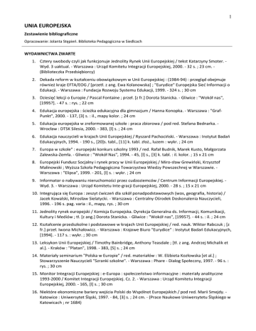 1 UNIA EUROPEJSKA Zestawienie bibliograficzne Opracowanie: Jolanta Stępień. Biblioteka Pedagogiczna w Siedlcach WYDAWNICTWA ZWARTE 1. Cztery swobody czyli jak funkcjonuje Jednolity Rynek Unii Europejskiej / tekst Katarzyny Smoter. Wyd. 3 uaktual. - Warszawa : Urząd Komitetu Integracji Europejskiej, 2000. - 32 s. ; 23 cm. (Biblioteczka Przedsiębiorcy) 2. Dekada reform w kształceniu obowiązkowym w Unii Europejskiej : (1984-94) : przegląd obejmuje również kraje EFTA/EOG / [przetł. z ang. Ewa Kolanowska] ; "Eurydice" Europejska Sieć Informacji o Edukacji. - Warszawa : Fundacja Rozwoju Systemu Edukacji, 1999. - 324 s. ; 30 cm 3. Dziesięć lekcji o Europie / Pascal Fontaine ; przeł. [z fr.] Dorota Stanicka. - Gliwice : "Wokół nas", [1995?]. - 44 s. : rys. ; 22 cm 4. Edukacja europejska : ścieżka edukacyjna dla gimnazjum / Hanna Konopka. - Warszawa : "GrafPunkt", 2000. - 134, [3] s. : il., mapy kolor. ; 24 cm 5. Edukacja europejska w zreformowanej szkole : praca zbiorowa / pod red. Stefana Bednarka. Wrocław : DTSK Silesia, 2000. - 383, [l] s. ; 24 cm 6. Edukacja nauczycieli w krajach Unii Europejskiej / Ryszard Pachociński. - Warszawa : Instytut Badań Edukacyjnych, 1994. - 190 s., [20]s. tabl., [11] k. tabl. złoż., luzem : wykr. ; 24 cm 4. Europa w szkole" : europejski konkurs szkolny 1993 / red. Rafał Budnik, Marek Kusto, Małgorzata Zalewska-Zemła. - Gliwice : "Wokół Nas", 1994. - 45, [l] s., [3] k. tabl. : il. kolor. ; 15 x 21 cm 8. Europejski Fundusz Socjalny i rynek pracy w Unii Europejskiej / Miro-sław Grewiński, Krzysztof Malinowski ; Wyższa Szkoła Pedagogiczna Towarzystwa Wiedzy Powszechnej w Warszawie. Warszawa : "Elipsa", 1999. - 201, [l] s. : wykr. ; 24 cm 9. Informator o nabywaniu nieruchomości przez cudzoziemców / Centrum Informacji Europejskiej. Wyd. 3. - Warszawa : Urząd Komitetu Inte-gracji Europejskiej, 2000. - 28 s. ; 15 x 21 cm 10. Integrująca się Europa : zeszyt ćwiczeń dla szkół ponadpodstawowych (wos, geografia, historia) / Jacek Kowalski, Mirosław Sielatycki. - Warszawa : Centralny Ośrodek Doskonalenia Nauczycieli, 1996. - 196 s. pag. varia : il., mapy, rys. ; 30 cm 11. Jednolity rynek europejski / Komisja Europejska. Dyrekcja Generalna ds. Informacji, Komunikacji, Kultury i Mediów ; tł. [z ang.] Dorota Stanicka. - Gliwice : "Wokół nas", [1995?]. - 44 s. : il. ; 24 cm 12. Kształcenie przedszkolne i podstawowe w krajach Unii Europejskiej / red. nauk. Wiktor Rabczuk ; [z fr.] przeł. Iwona Michałowicz. - Warszawa : Krajowe Biuro "Eurydice" : Instytut Badań Edukacyjnych, [1994]. - 114 s. : wykr. ; 30 cm 13. Leksykon Unii Europejskiej / Timothy Bainbridge, Anthony Teasdale ; [tł. z ang. Andrzej Michalik et al.]. - Kraków : "Platan", 1998. - 383, [5] s. ; 24 cm 14. Materiały seminarium "Polska w Europie" / red. materiałów : W. Elżbieta Kozłowska [et al.] ; Stowarzyszenie Nauczycieli "Szranki szkolne". - Warszawa : Phare - Dialog Społeczny, 1994. - 96 s. : rys. ; 30 cm 15. Monitor Integracji Europejskiej : e-Europa : społeczeństwo informacyjne : materiały analityczne 1993-2000 / Komitet Integracji Europejskiej. Cz. 2. - Warszawa : Urząd Komitetu Integracji Europejskiej, 2000. - 165, [l] s. ; 30 cm 16. Niektóre ekonomiczne bariery wejścia Polski do Wspólnot Europejskich / pod red. Marii Smejdy. Katowice : Uniwersytet Śląski, 1994. - 84, [3] s. ; 24 cm. - (Prace Naukowe Uniwersytetu Śląskiego w Katowicach ; nr 1684) 2 14. Polityczna integracja Europy zachodniej / Krystyna Wiaderny-Bidzińska. - Toruń : Wydawnictwo Adam Marszalek, cop. 1999. - 312 s. ; 24 cm 18. Polityka edukacyjna Unii Europejskiej na tle przemian w szkolnictwie krajów członkowskich / Wiktor Rabczuk. - Warszawa : Instytut Badań Edukacyjnych, 1994. - 211 s. : wykr. ; 24 cm 19. Polityka regionalna Unii Europejskiej : zagadnienia prawno-finansowe / Maciej Rudnicki. - Poznań : Wydawnictwo Wyższej Szkoły Bankowej, 2000. - 214, [1] s. : il. ; 24 cm Stan prawny na dzień 1 września 2000 r. 20. Polityka regionalna Unii Europejskiej i regiony w państwach członkowskich / Irena Pietrzyk. - Wyd. 1 dodruk 2. - Warszawa : Wydawnictwo Naukowe PWN, 2001. - 321, [2] s. : il. ; 21 cm 21. Polityka rozwoju regionalnego : wybrane zagadnienia / Julian Skrzyp ; Akademia Podlaska. - Siedlce : Wydawnictwo AP, 2002. - 125 s. : il., mapy ; 24 cm 22. Pomoc publiczna w prawie Unii Europejskiej - implikacje dla Polski / Bartosz Jankowski. - Warszawa : Urząd Komitetu Integracji Europejskiej, 2001. - 61, [l] s. : rys. ; 24 cm. - (Biblioteka Europejska ; 20) 23. Prawo europejskie / Frank Emmert, Mateusz Morawiecki ; [tł. z niem. Viktor Grotowicz]. - Wyd. 2. Warszawa ; Wrocław : Wydawnictwo Naukowe PWN, 2000. - 584, [l] s. ; 21 cm 24. Rady konsultacyjne i inne formy społecznego uczestnictwa w edukacji w Unii Europejskiej / [przetł. z ang. Ewa Kolanowska] ; "Eurydice" Europejska Sieć Informacji o Edukacji. - Warszawa : Fundacja Rozwoju Systemu Edukacji, 1999. - 84, [4] s. : mapy ; 30 cm 25. Rola rodziców w systemach edukacyjnych Unii Europejskiej / red. Anna Smoczyńska ; przetł. Stanisław Kasperec ; Eurydice (Europejska Sieć In-formacji o Edukacji). - Warszawa : Krajowe Biuro Eurydice : Fundacja Rozwoju Systemu Edukacji, cop. 1994. - 122 s. : mapy, tab., wykr. ; 30 cm 26. Słowniczek europejski / Zbigniew Czachór. - Warszawa : Unia Europejska. Przedstawicielstwo Komisji Europejskiej, 1996. - 56 s. ; 21 cm 24. Struktury systemów kształcenia ogólnego i zawodowego w Unii Europejskiej / red. nauk. Wiktor Rabczuk ; EURYDICE, CEDEFOP. - Warszawa : Komisja Europejska, cop. 1998. - 558 s. ; 30 cm 28. System środków kontroli handlowej Unii Europejskiej w warunkach globalizacji / Zdzisław W. Puślecki. - Poznań : Wydawnictwo Naukowe UAM, 2001. - 239, [l] s. : 2 il. ; 24 cm. - (Nauki Ekonomiczne / Uniwersytet im. Adama Mickiewicza w Poznaniu ; nr 8) 29. Systemy szkolne Unii Europejskiej / Dobromir Dziewulak. - Wyd. 3 popr. i uzup. - Warszawa : "Żak", 1994. - 166 