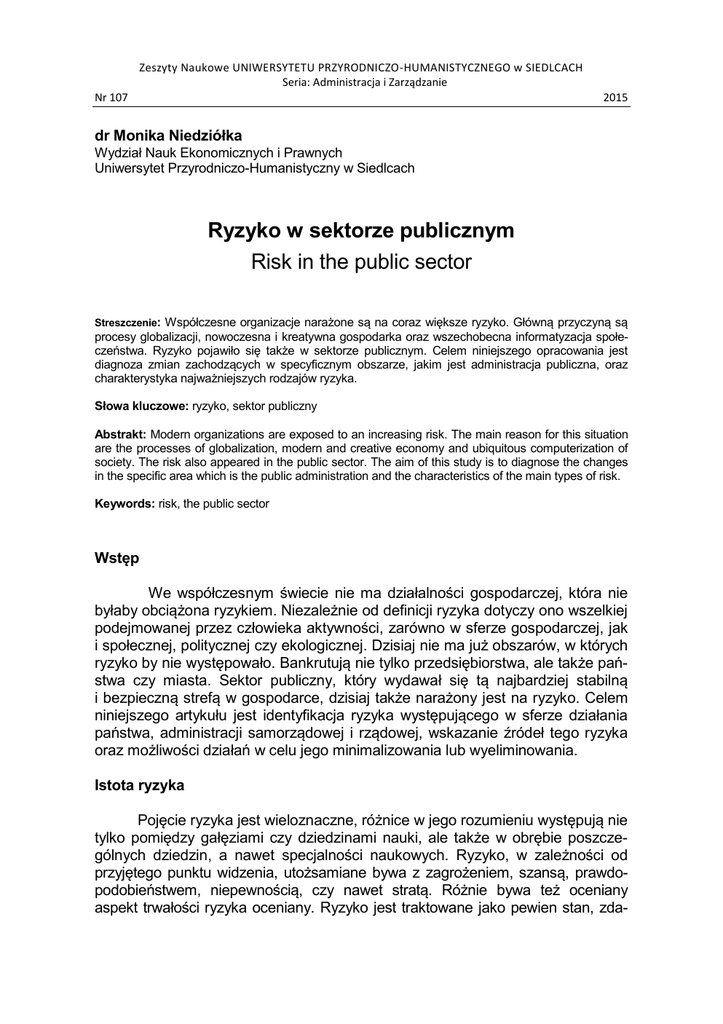 Zeszyty Naukowe UNIWERSYTETU PRZYRODNICZO-HUMANISTYCZNEGO w SIEDLCACH Seria: Administracja i Zarządzanie Nr 107 2015 dr Monika Niedziółka Wydział Nauk Ekonomicznych i Prawnych Uniwersytet Przyrodniczo-Humanistyczny w Siedlcach Ryzyko w sektorze publicznym Risk in the public sector Streszczenie: Współczesne organizacje narażone są na coraz większe ryzyko. Główną przyczyną są procesy globalizacji, nowoczesna i kreatywna gospodarka oraz wszechobecna informatyzacja społeczeństwa. Ryzyko pojawiło się także w sektorze publicznym. Celem niniejszego opracowania jest diagnoza zmian zachodzących w specyficznym obszarze, jakim jest administracja publiczna, oraz charakterystyka najważniejszych rodzajów ryzyka. Słowa kluczowe: ryzyko, sektor publiczny Abstrakt: Modern organizations are exposed to an increasing risk. The main reason for this situation are the processes of globalization, modern and creative economy and ubiquitous computerization of society. The risk also appeared in the public sector. The aim of this study is to diagnose the changes in the specific area which is the public administration and the characteristics of the main types of risk. Keywords: risk, the public sector Wstęp We współczesnym świecie nie ma działalności gospodarczej, która nie byłaby obciążona ryzykiem. Niezależnie od definicji ryzyka dotyczy ono wszelkiej podejmowanej przez człowieka aktywności, zarówno w sferze gospodarczej, jak i społecznej, politycznej czy ekologicznej. Dzisiaj nie ma już obszarów, w których ryzyko by nie występowało. Bankrutują nie tylko przedsiębiorstwa, ale także państwa czy miasta. Sektor publiczny, który wydawał się tą najbardziej stabilną i bezpieczną strefą w gospodarce, dzisiaj także narażony jest na ryzyko. Celem niniejszego artykułu jest identyfikacja ryzyka występującego w sferze działania państwa, administracji samorządowej i rządowej, wskazanie źródeł tego ryzyka oraz możliwości działań w celu jego minimalizowania lub wyeliminowania. Istota ryzyka Pojęcie ryzyka jest wieloznaczne, różnice w jego rozumieniu występują nie tylko pomiędzy gałęziami czy dziedzinami nauki, ale także w obrębie poszczególnych dziedzin, a nawet specjalności naukowych. Ryzyko, w zależności od przyjętego punktu widzenia, utożsamiane bywa z zagrożeniem, szansą, prawdopodobieństwem, niepewnością, czy nawet stratą. Różnie bywa też oceniany aspekt trwałości ryzyka oceniany. Ryzyko jest traktowane jako pewien stan, zda- 50 Monika Niedziółka rzenie, dynamicznie zmieniający się stan lub nawet proces. W pierwszym przypadku stanowi jedno ze stałych zjawisk w otoczeniu, w drugim jest rozumiane jako raptowne zdarzenie - często niezależne od człowieka, w trzecim łączy się je z podejmowaniem działań, a w czwartym wiąże z upływem czasu1. Dla nauk ekonomicznych charakterystyczne jest antropocentryczne podejście do ryzyka, oznaczające analizę ryzyka przez pryzmat skutków, jakie niesie dla człowieka oraz uświadomiony i nieuświadomiony wpływ, jaki wywiera na ludzkie działania. Przedmiotem zainteresowania nie jest więc abstrakcyjne zjawisko ryzyka, lecz konteksty interakcji, jakie zachodzą między nim a człowiekiem. Koncentrowanie się na różnych aspektach relacji „człowiek−ryzyko” spowodowało, że nie wykształciła się do tej pory jednolita metodologia dotycząca badania samego ryzyka. Złożoność zjawiska jakim jest ryzyko, jego uwarunkowania, a zwłaszcza wielowymiarowość jego wpływu na ludzkie decyzje sprawia, że nie należy oczekiwać ukształtowania się takiej metodologii również w przyszłości2. Ryzyko dotyczy wszystkich działalności człowieka – różni się tylko jego intensywność, zmienność czy przewidywalność. W Polsce w głównej mierze to transformacja rynkowa i dynamiczne procesy globalizacyjne sprawiły, że zmieniły się drastycznie zasady funkcjonowania w gospodarce, a z nimi poziom ryzyka. Jednak intensywność przeobrażeń gospodarczo-społecznych spowodowała i wymusiła także zmiany w działaniu sektora publicznego. Zmiany funkcjonowania sektora publicznego W teorii ekonomii od zawsze istnieje problem z określeniem sektora publicznego, wyraźnym wyspecyfikowaniem zasad jego funkcjonowania, a przede wszystkim z przedstawieniem celów i zadań, jakie ma do realizacji3. Sektor publiczny gwarantuje realizację podstawowych funkcji państwa w zakresie struktury administracyjno-instytucjonalnej, niezbędnej do funkcjonowania społeczeństwa i współczesnej gospodarki. Może być powoływany tylko przez państwo (nie ma samodzielnych celów i nie może być w pełni zastąpiony przez sektor prywatny), które wyznacza i zleca określone zadania4. Sektor publiczny jest bardzo zróżnicowany. Stanowi go administracja publiczna i samorządowa. Odkąd Polska weszła na tory gospodarki rynkowej, podjęto wiele wątków i dyskusji dotyczących zasad jego funkcjonowania, efektywności, skuteczności, nowy szans i zagrożeń. Najważniejszą jednak kwestią wydaje się odpowiedź na pytanie, czy można zarządzać sektorem publicznym analogicznie jak jednostkami komercyjnymi. Ciekawą dyskusję na ten temat podjął Profesor Kazimierz Kuciński, wspólnie z zespołem, w monografii „Miasto jako analog przedsiębiorstwa. Inspiracje dydaktyczne i badawcze”5. Wynika z niej, że wiele A. Adamska, Ryzyko jako przedmiot nauk ekonomicznych, [w:] Kuciński K. (red.), Ryzyko lokalizacji przedsiębiorstw w Polsce, CeDeWu, Warszawa, 2014, s.14. 2 Tamże. 3 J. Kleer, Identyfikacja dóbr wytwarzanych przez sektor publiczny, [w:] Sektor publiczny w Polsce i na świecie. Między upadkiem a rozkwitem, Warszawa 2005, s.9. 4 B. Bobińska, Funkcjonowanie sektora publicznego jako organizacji „otwartych na klienta”, http://fir.zpsb.pl/sites/fir.zpsb.pl/files/artykul/pdf/fir_2012_01_bbobinska.pdf (dostęp: 20.06.2014). 5 K. Kuciński (red.), Miasto jako analog przedsiębiorstwa. Ins