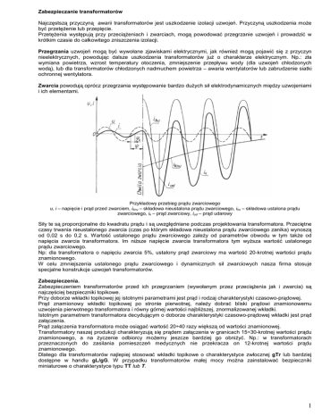 Zabezpieczanie transformatorów Najczęstszą przyczyną awarii transformatorów jest uszkodzenie izolacji uzwojeń. Przyczyną uszkodzenia może być przetężenie lub przepięcie. Przetężenia występują przy przeciążeniach i zwarciach, mogą powodować przegrzanie uzwojeń i prowadzić w krótkim czasie do całkowitego zniszczenia izolacji. Przegrzania uzwojeń mogą być wywołane zjawiskami elektrycznymi, jak również mogą pojawić się z przyczyn nieelektrycznych, powodując dalsze uszkodzenia transformatorów już o charakterze elektrycznym. Np.: zła wymiana powietrza, wzrost temperatury otoczenia, zmniejszenie przepływu wody (dla uzwojeń chłodzonych wodą), lub dla transformatorów chłodzonych nadmuchem powietrza – awaria wentylatorów lub zabrudzenie siatki ochronnej wentylatora. Zwarcia powodują oprócz przegrzania występowanie bardzo dużych sił elektrodynamicznych między uzwojeniami i ich elementami. Przykładowy przebieg prądu zwarciowego u, i – napięcie i prąd przed zwarciem, iknu – składowa nieustalona prądu zwarciowego, iku – składowa ustalona prądu zwarciowego, ik – prąd zwarciowy, iud – prąd udarowy Siły te są proporcjonalne do kwadratu prądu i są uwzględniane podczas projektowania transformatora. Przeciętne czasy trwania nieustalonego zwarcia (czas po którym składowa nieustalona prądu zwarciowego zanika) wynoszą od 0,02 s do 0,2 s. Wartość ustalonego prądu zwarciowego zależy od parametrów obwodu w tym także od napięcia zwarcia transformatora. Im niższe napięcie zwarcia transformatora tym wyższa wartość ustalonego prądu zwarciowego. Np: dla transformatora o napięciu zwarcia 5%, ustalony prąd zwarciowy ma wartość 20-krotnej wartości prądu znamionowego. W celu zmniejszenia ustalonego prądu zwarciowego i dynamicznych sił zwarciowych nasza firma stosuje specjalne konstrukcje uzwojeń transformatorów. Zabezpieczenia. Zabezpieczeniem transformatorów przed ich przegrzaniem (wywołanym przez przeciążenia jak i zwarcia) są najczęściej bezpieczniki topikowe. Przy doborze wkładki topikowej jej istotnymi parametrami jest prąd i rodzaj charakterystyki czasowo-prądowej. Prąd znamionowy wkładki topikowej po stronie pierwotnej, należy dobrać bliski prądowi znamionowemu uzwojenia pierwotnego transformatora i równy górnej wartości najbliższej, znormalizowanej wkładki. Istotnym parametrem transformatora decydującym o doborze charakterystyki czasowo-prądowej wkładki jest prąd załączenia. Prąd załączenia transformatora może osiągać wartość 20÷40 razy większą od wartości znamionowej. Transformatory naszej produkcji charakteryzują się prądem załączenia w granicach 15÷30-krotnej wartości prądu znamionowego, a na życzenie odbiorcy możemy jeszcze bardziej go obniżyć. Np.: w transformatorach przeznaczonych do zasilania pomieszczeń medycznych nie przekracza on 12-krotnej wartości prądu znamionowego. Dlatego dla transformatorów najlepiej stosować wkładki topikowe o charakterystyce zwłocznej gTr lub bardziej dostępne w handlu gL/gG. W przypadku transformatorów małej mocy można zainstalować bezpieczniki miniaturowe o charakterystyce typu TT lub T. 1 400 I[A] 350 300 250 200 150 100 50 0 -50 0 0,01 0,02 0,03 0,04 0,05 0,06 0,07 0,08 0,09 0,1 t[s] -100 Przebieg prądu załączenia transformatora typu ET1MED-6,3 230V//230V (I1n=28A), produkcji ELHAND Jako zabezpieczenia transformatorów nie zaleca się stosowania popularnych wyłączników nadmiarowoprądowych typu S, mimo że jest dostępna ich wersja o charakterystyce D (pasmo 10-20xIn), ponieważ prąd rozruchu transformatora może spowodować zadziałanie wyzwalacza elektromagnetycznego podczas załączenia transformatora. Najlepszym rozwiązaniem zabezpieczenia transformatora jest zastosowanie wyłącznika o regulowanych parametrach charakterystyk czasowo-prądowych odrębnie dla członów zwarciowego i przeciążeniowego. Oprócz tego wyłącznik tego typu ma również możliwość ustawienia zwłoki (opóźnienia), tak że możemy „uśpić” jego reakcję np. na czas rozruchu, który trwa zazwyczaj pierwsze 5-7 półokresów. Wadą tych wyłączników jest dość wygórowana cena. Można stosować również zabezpieczenia po stronie wtórnej, lecz stanowią one bardziej zabezpieczenie odbiornika. W tym przypadku wartość prądu znamionowego wkładki topikowej nie może być wyższa od prądu znamionowego strony wtórnej transformatora. Rodzaj charakterystyki czasowo-prądowej wkładki zależny jest w tym wypadku od charakteru odbiornika. Czujniki temperatury O ile bezpieczniki topikowe lub wyłączniki chronią, przed skutkami przeciążeń i zwarć, to istnieje szereg czynników nieelektrycznych, które mogą doprowadzić do przegrzania i uszkodzenia izolacji. Z tego powodu dodatkowo umieszcza się w uzwojeniach czujniki temperatury zależnie od aplikacji i potrzeb użytkownika. Mogą być zastosowane czujniki wykonane jako: - rezystancyjne (typu Pt), - półprzewodnikowe (np. pozystory PTC), - miniaturowe wyłączniki bimetalowe : NO – (normalnie otwarte) lub NC – (normalnie zamknięte). Umieszcza się je wewnątrz uzwojenia. Niektóre zastosowania np. górnicze lub medyczne wymagają zamontowania nawet dwóch rodzajów czujników w jednym uzwojeniu. Przykład: za pomocą czujnika typu Pt100 realizowany jest ciągły monitoring temperatury uzwojeń, a dodatkowo zamontowany wyłącznik bimetalowy NO lub NC sygnalizuje przekroczenie temperatury dopuszczalnej. Jest to istotne z punktu widzenia eksploatacji, ale przede wszystkim korzystne dla wydłużenia żywotności transformatora, gdyż stałe przegrzanie izolacji o 5ºC powoduje dwukrotnie szybsze skrócenie jej żywotności. 2