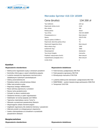 Mercedes Sprinter 416 CDI 165KM Cena (brutto): 134 200 zł Typ nadwozia pick-up Pojemność silnika (ccm) 2143 Moc silnika 165 Rodzaj paliwa diesel Typ silnika 416 CDI 165KM Przyspieszenie (s.) Brak danych Opony 205/75 R16 Zużycie paliwa (l/100km.) 8.2 Pojemność zbiornika paliwa (litry) 75 Pojemność bagażnika (litry) Brak danych Masa własna (kg.) 1940 Ładowność (kg.) 2660 Klasa/segment dostawcze Typ skrzyni biegów manualna Prędkość maksymalna (km/h) Brak danych Częstotliwość przeglądu (km.) Brak danych Liczba drzwi 2 Komfort Wyposażenie standardowe Wyposażenie dodatkowe ✓ Elektrycznie regulowane szyby w drzwiach przednich ✕ Fotel kierowcy podgrzewany 592 PLN ✓ Kontrolka informująca o awarii oświetlenia pojazdu ✕ Fotel pasażera ogrzewany 592 PLN ✓ Lusterka zewnętrzne regulowane mechanicznie z ✕ Klimatyzacja manualna 5745 PLN dodatkowymi lusterkami szerokokątnymi ✓ Osłony przeciwsłoneczne ✕ Lusterka elektrycznie sterowane i podgrzewane 841 PLN ✓ Podwójna kabina czterodrzwiowa (Doka) ✕ PARKTRONIC - system bezpiecznego parkowania 3394 PLN ✓ Półka nad przednia szybą ✕ Tempomat 1142 PLN ✓ Regulacja zasięgu reflektorów\n ✓ Resor piórowy poprzeczny z przodu\n ✓ Resory tylne paraboliczne\n ✓ Schowki na desce rozdzielczej\n ✓ Siedzenie kierowcy w pełni regulowane\n ✓ Stabilizator osi tylnej (pojazdy serii 500)\n ✓ Tapicerka materiałowa czarna "Lima"\n ✓ Wieszak w przestrzeni pasażerskiej (Doka)\n ✓ Wspomaganie układu kierowniczego\n ✓ Zagłówek regulowany dla siedzenia kierowcy i pasażera\n ✓ Zderzak przedni ze zintegrowanym stopniem\n ✓ Ławka czteroosobowa ze schowkiem w przedziale pasażerskim (Doka)\n Bezpieczeństwo Wyposażenie standardowe Wyposażenie dodatkowe 1 ✓ ABS ✕ Poduszka powietrzna pasażera 1391 PLN ✓ Adaptacyjne światła stop (ABL)\n ✓ BAS\n ✓ Belka przeciw najazdowa tylna (pojazdy serii 500)\n ✓ EBV\n ✓ Hamulce tarczowe przód i tył\n ✓ Instalacja elektryczna 12V\n ✓ Napinacze pasów bezpieczeństwa dla foteli przednich\n ✓ Poduszka powietrzna kierowcy\n ✓ Przygotowanie do montażu świateł pozycyjnych bocznych (pojazdy długie i ekstra długie)\n ✓ System stabilizacji toru jazdy ADAPTIVE ESP(R)\n ✓ Trzypunktowe pasy bezpieczeństwa na wszystkich siedzeniach\n ✓ Wyłącznik główny napięcia\n Dodatki Wyposażenie standardowe Wyposażenie dodatkowe ✓ Boczne listwy ochronne ✕ Alarm antywłamaniowy 772 PLN ✓ Centralny zamek drzwi zdalnie sterowany falami radiowymi ✕ Instalacja do montażu alarmu 1786 PLN ✓ Dwudrożne głośniki z przodu ✕ Kamera cofania 3495 PLN ✓ Filtr cząstek stałych ✕ Radioodtwarzacz CD 2006 PLN ✓ Filtr paliwa z separatorem wody ✕ Szyba przednia podgrzewana 1004 PLN ✓ Immobiliser ✕ Zmieniarka CD 1725 PLN ✓ Kierunkowskazy zintegrowane w lusterkach zewnętrznych\n ✓ Klin pod koła (pojazdy serii 500)\n ✓ Kontrolka poziomu płynu do spryskiwaczy\n ✓ Koło zapasowe (z wyjątkiem serii 400 i 316 NGT)\n ✓ Mocowanie koła zapasowego na końcu ramy\n ✓ Norma emisji spalin EU4 Gr I (silnik benzynowy)\n ✓ Norma emisji spalin Euro 5 (silniki CDI)\n ✓ Obręcze stalowe 5,5 J x 16 (pojazdy serii 200 i 500)\n ✓ Obręcze stalowe 6,5 J x 16 (pojazdy serii 300)\n ✓ Opony letnie\n ✓ Oś przednia 1,65 t (pojazdy serii 200 i 300)\n ✓ Oś przednia 1,85 t (pojazdy serii 500)\n ✓ Przygotowanie do montażu modułu PSM\n ✓ Przygotowanie do montażu radia\n ✓ Reflektory ze szkła przezroczystego\n ✓ Stabilizator osi przedniej (pojazdy serii 300 i 500)\n ✓ System "Tirefit" (pojazdy serii 400 i 316 NGT)\n ✓ Układ hamulcowy hydrauliczny dwuobwodowy\n ✓ Zbiornik paliwa 100 litrów (216, 316, 316 NGT, 516)\n ✓ Zbiornik paliwa 75 l\n ✓ Zbiorniki na gaz ziemny o łącznej objętości 210 litrów (pojazdy serii 300), mieszczące 34 kg gazu ziemnego\n ✓ Zbiorniki na gaz ziemny o łącznej objętości 246 litrów (pojazdy serii 500), mieszczące 40 kg gazu ziemnego\n 2 ✓ Zestaw narzędzi samochodowych\n ✓ Złącze rozruchowe (dodatkowy biegun dodatni)\n Doprecyzowanie oferty Kontakt: Nazwa użytkownika: admin Nazwa firmy: qqq Adres: qqq 12, 41-706 qqq1, NIP: 954 REGON: 1 Telefon: 123, 1 Fax: 1 Email: 1 www: 3