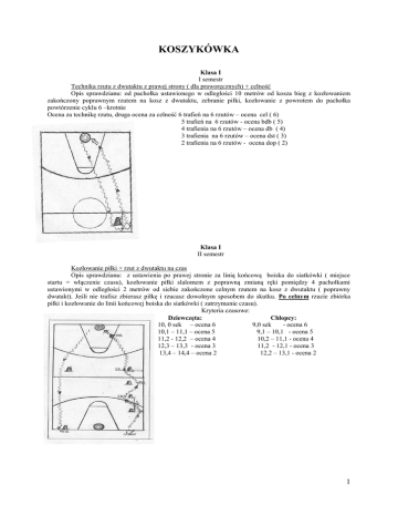 KOSZYKÓWKA Klasa I I semestr Technika rzutu z dwutaktu z prawej strony ( dla praworęcznych) + celność Opis sprawdzianu: od pachołka ustawionego w odległości 10 metrów od kosza bieg z kozłowaniem zakończony poprawnym rzutem na kosz z dwutaktu, zebranie piłki, kozłowanie z powrotem do pachołka powtórzenie cyklu 6 –krotnie Ocena za technikę rzutu, druga ocena za celność 6 trafień na 6 rzutów – ocena cel ( 6) 5 trafień na 6 rzutów - ocena bdb ( 5) 4 trafienia na 6 rzutów – ocena db ( 4) 3 trafienia na 6 rzutów – ocena dst ( 3) 2 trafienia na 6 rzutów - ocena dop ( 2) Klasa I II semestr Kozłowanie piłki + rzut z dwutaktu na czas Opis sprawdzianu: z ustawienia po prawej stronie za linią końcową boiska do siatkówki ( miejsce startu = włączenie czasu), kozłowanie piłki slalomem z poprawną zmianą ręki pomiędzy 4 pachołkami ustawionymi w odległości 2 metrów od siebie zakończone celnym rzutem na kosz z dwutaktu ( poprawny dwutakt). Jeśli nie trafisz zbierasz piłkę i rzucasz dowolnym sposobem do skutku. Po celnym rzucie zbiórka piłki i kozłowanie do linii końcowej boiska do siatkówki ( zatrzymanie czasu). Kryteria czasowe: Dziewczęta: Chłopcy: 10, 0 sek – ocena 6 9,0 sek - ocena 6 10,1 – 11,1 – ocena 5 9,1 – 10,1 - ocena 5 11,2 - 12,2 – ocena 4 10,2 – 11,1 - ocena 4 12,3 – 13,3 - ocena 3 11,2 - 12,1 - ocena 3 13,4 – 14,4 – ocena 2 12,2 – 13,1 - ocena 2 1 Klasa II I semestr Rzuty z dwutaktu po kozłowaniu na dwa kosze Opis sprawdzianu: start z linii końcowej boiska do siatkówki pod koszem, kozłowanie piłki w kierunku kosza po drugiej stronie boiska zakończone rzutem z dwutaktu, zebranie piłki i kozłowanie na drugi kosz itd. Ocena za trafienia = technika dwutaktu Kryteria za trafienia: 10 trafień na 10 rzutów – ocena 5 9 trafień na 10 rzutów – ocena 58 trafień na 10 rzutów – ocena 4+ 7 trafień na 10 rzutów – ocena 4 6 trafień na 10 rzutów – ocena 45 trafień na 10 rzutów – ocena 3+ 4 trafienia na 10 rzutów – ocena 3 3 trafienia na 10 rzutów – ocena 32 trafienia na 10 rzutów – ocena 2+ 1 trafienie na 10 rzutów – ocena 2 Klasa II II semestr Rzut z dwutaktu z lewej strony ( dla praworęcznych ) + celność Opis sprawdzianu: od pachołka ustawionego w odległości 5 metrów od kosza jeden kozioł lewą ręką i dwutakt zakończony rzutem na kosz lewą ręką , zebranie piłki i kozłowanie lewą ręką do pachołka, powtórzenie rzutu z dwutaktu z lewej strony. Ocena za technikę rzutu, druga za celność 6 trafień na 6 rzutów – ocena 6 5 trafień na 6 rzutów – ocena 5 4 trafienia na 6 rzutów – ocena 4 3 trafienia na 6 rzutów - ocena 3 2 trafienia na 6 rzutów – ocena 2 2 Klasa III I semestr Rzuty osobiste na kosz z dobitką Opis sprawdzianu: ustawienie na linii rzutów osobistych, rzut na kosz – jeśli trafiasz otrzymujesz 3 pkt. Ponownie z linii rzutów osobistych wykonujesz kolejny z 6 rzutów. Jednak jeśli nie trafisz - zbierasz piłkę i wykonujesz z miejsca, z którego złapałeś piłkę, ponowny rzut na kosz – jeśli trafisz - otrzymujesz - 2 pkt. Jeżeli ponownie nie trafiłeś zbierasz ostatni raz piłkę i wykonujesz rzut z miejsca w którym złapałeś piłkę, jeśli trafisz – otrzymujesz – 1 pkt. Ponownie zaczynasz rzuty z linii rzutów osobistych. Do wykonania 6 rzutów z linii rzutów osobistych: Suma punktów z 6 rzutów z dobitką lub bez: 18 pkt – ocena 6 14 – 17 pkt – ocena 5 9 – 13 pkt – ocena 4 5 – 8 pkt – ocena 3 2 - 4 pkt - ocena 2 Legenda: - zawodnik z piłką - rzut na kosz, - uczeń, który z tego miejsca trafia do kosza otrzymuje 3 punkty, - uczeń, który po raz drugi próbuje trafić do kosza otrzymuje 2 punkty, - uczeń, który po raz trzeci próbuje trafić do kosza otrzymuje 1 punkt. II semestr Rzuty na kosz z wyskoku Opis sprawdzianu: ze skrzydła uczeń zaczyna kozłować piłkę po obwodzie i w odległości mniejszej o linii rzutu za 3 pkt., zatrzymanie na dwa tempa wyskok w rzut z lewego skrzydła, zbiórka piłki, kozłowanie w kierunku do środka pola na wysokość linii rzutów osobistych, po obrocie w kierunku kosza zatrzymanie na dwa tempa, rzut na kosz z wyskoku, zbiórka piłki, kozłowanie piłki do prawego skrzydła, zatrzymanie z obrotem w kierunku kosza na dwa tempa, rzut z wyskoku. Ocena celująca (6)- uczeń poprawnie kozłuje piłkę i zatrzymuje się na dwa tempa, wykonuje dynamiczny wyskok, prawidłowa praca ramion, wykonuje 2 celne rzuty na 3 Ocena bardzo dobra (5) – uczeń poprawnie kozłuje piłkę i zatrzymuje się na dwa tempa, wykonuje dynamiczny wyskok, prawidłowa praca ramion, wykonuje 1 celny rzut na 3 Ocena dobra (4) - uczeń poprawnie kozłuje piłkę i zatrzymuje się na dwa tempa, wykonuje dynamiczny wyskok, prawidłowa praca ramion, wykonuje 0 celnych rzutów Ocena dostateczna (3) – uczeń poprawnie kozłuje piłkę i zatrzymuje się na dwa tempa, wykonuje mało skoordynowany wyskok z pracą ramion, wykonuje 0 celnych rzutów Ocena dopuszczająca (2) – uczeń słabo kozłuje piłkę, zatrzymanie na dwa tempa jest powolne, brak wyskoku, niepoprawna praca ramion, 0 celnych rzutów 3 Klasa IV Rzuty z dwutaktu z prawej i lewej strony. Opis sprawdzianu: Chwyt piłki z krzesła, dwutakt z prawej strony kosza ( poprawna praca nóg, kozioł prawą ręką) zbiórka piłki i podanie jej do współćwiczącego stojącego na linii rzutów osobistych. Ten odkłada piłkę na miejsce ( tj. krzesło z prawej strony). Rzucający biegnie do drugiego krzesła z lewej strony kosza, chwyta piłkę leżącą na krześle, kozioł lewą ręką i dwutakt na lewą stronę, rzut lewą ręką, zbiórka i podanie do współćwiczącego stojącego na linii rzutów osobistych. Powtórka z prawej strony itd. aż do wykonania przez zaliczającego 10 rzutów ( 5 na prawą i 5 na lewą ). Ocenę otrzymuje uczeń, który poprawnie wykonuje dwutakt na prawą i lewą rękę. Ocenie podlega celność i szybkość 