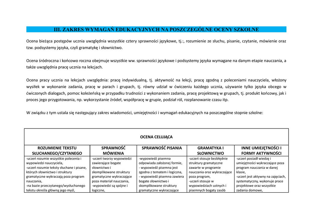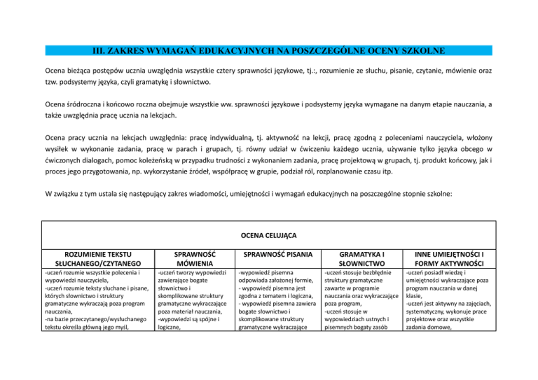 III. ZAKRES WYMAGAŃ EDUKACYJNYCH NA POSZCZEGÓLNE