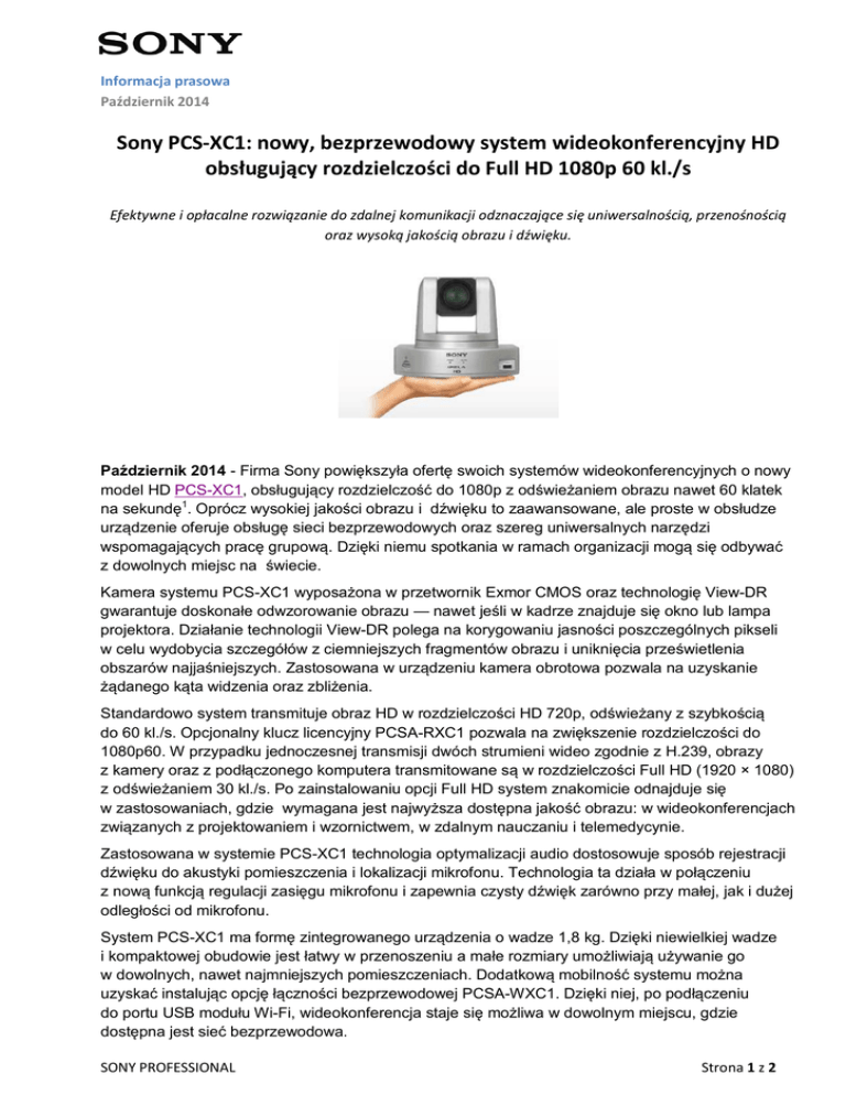 Informacja prasowa Październik 2014 Sony PCS-XC1: nowy, bezprzewodowy system wideokonferencyjny HD obsługujący rozdzielczości do Full HD 1080p 60 kl./s Efektywne i opłacalne rozwiązanie do zdalnej komunikacji odznaczające się uniwersalnością, przenośnością oraz wysoką jakością obrazu i dźwięku. Październik 2014 - Firma Sony powiększyła ofertę swoich systemów wideokonferencyjnych o nowy model HD PCS-XC1, obsługujący rozdzielczość do 1080p z odświeżaniem obrazu nawet 60 klatek na sekundę1. Oprócz wysokiej jakości obrazu i dźwięku to zaawansowane, ale proste w obsłudze urządzenie oferuje obsługę sieci bezprzewodowych oraz szereg uniwersalnych narzędzi wspomagających pracę grupową. Dzięki niemu spotkania w ramach organizacji mogą się odbywać z dowolnych miejsc na świecie. Kamera systemu PCS-XC1 wyposażona w przetwornik Exmor CMOS oraz technologię View-DR gwarantuje doskonałe odwzorowanie obrazu — nawet jeśli w kadrze znajduje się okno lub lampa projektora. Działanie technologii View-DR polega na korygowaniu jasności poszczególnych pikseli w celu wydobycia szczegółów z ciemniejszych fragmentów obrazu i uniknięcia prześwietlenia obszarów najjaśniejszych. Zastosowana w urządzeniu kamera obrotowa pozwala na uzyskanie żądanego kąta widzenia oraz zbliżenia. Standardowo system transmituje obraz HD w rozdzielczości HD 720p, odświeżany z szybkością do 60 kl./s. Opcjonalny klucz licencyjny PCSA-RXC1 pozwala na zwiększenie rozdzielczości do 1080p60. W przypadku jednoczesnej transmisji dwóch strumieni wideo zgodnie z H.239, obrazy z kamery oraz z podłączonego komputera transmitowane są w rozdzielczości Full HD (1920 × 1080) z odświeżaniem 30 kl./s. Po zainstalowaniu opcji Full HD system znakomicie odnajduje się w zastosowaniach, gdzie wymagana jest najwyższa dostępna jakość obrazu: w wideokonferencjach związanych z projektowaniem i wzornictwem, w zdalnym nauczaniu i telemedycynie. Zastosowana w systemie PCS-XC1 technologia optymalizacji audio dostosowuje sposób rejestracji dźwięku do akustyki pomieszczenia i lokalizacji mikrofonu. Technologia ta działa w połączeniu z nową funkcją regulacji zasięgu mikrofonu i zapewnia czysty dźwięk zarówno przy małej, jak i dużej odległości od mikrofonu. System PCS-XC1 ma formę zintegrowanego urządzenia o wadze 1,8 kg. Dzięki niewielkiej wadze i kompaktowej obudowie jest łatwy w przenoszeniu a małe rozmiary umożliwiają używanie go w dowolnych, nawet najmniejszych pomieszczeniach. Dodatkową mobilność systemu można uzyskać instalując opcję łączności bezprzewodowej PCSA-WXC1. Dzięki niej, po podłączeniu do portu USB modułu Wi-Fi, wideokonferencja staje się możliwa w dowolnym miejscu, gdzie dostępna jest sieć bezprzewodowa. SONY PROFESSIONAL Strona 1 z 2 Informacja prasowa Październik 2014 — System PCS-XC1 zmienia wizję mobilnych wideokonferencji w rzeczywistość — mówi Alessandro Marcello, menedżer produktów i rozwiązań do komunikacji wizualnej w Sony Europe. — Aby uczestniczyć w konferencji z dowolnego miejsca, nawet w trakcie podróży, wystarczy zainstalować w systemie PCS-XC1 opcję dostępu mobilnego (PCSA-SAG1), a w tablecie albo smartfonie aplikację IPELA Communication Mobile (PCS-MEP), zgodną z H.323. Dzięki atrakcyjnej cenie i solidnej ofercie dodatkowych funkcji i możliwości, system PCS-XC1 będzie rozwiązaniem efektywnym i dostępnym dla dużej grupy klientów. Wideokonferencje przestaną być kojarzone z konkretnym pomieszczeniem: system PCS-XC1 eliminuje to tradycyjne ograniczenie, zapewniając tym samym uniwersalność i mobilność. System PCS-XC1 będzie można nabyć od listopada 2014 r. Inne cechy • • • • • Strumieniowa transmisja obrazu HD: oglądanie spotkań przy użyciu przeglądarki internetowej na ekranie komputera stacjonarnego lub laptopa Zapis wideokonferencji HD na nośniku USB Funkcja adnotacji rysunkowych: możliwość dodawania adnotacji do wideo i prezentacji przy użyciu sprzedawanego oddzielnie tabletu USB z rysikiem2 Intuicyjny w użyciu, graficzny interfejs użytkownika: przezroczyste, kaskadowe menu gwarantujące ciągłą widoczność obrazu wideo Gniazdo Kensington: możliwość zabezpieczenia przed kradzieżą 1 - Po zainstalowaniu sprzedawanego oddzielnie oprogramowania. W standardowej konfiguracji przesyłany jest obraz HD 720p 60 kl./s. 2 - Obsługiwane tablety z rysikiem: WACOM DTU-1631C, CTL-480/So, CTH-480/So Firma Sony Professional dostarcza produkty, systemy i aplikacje do tworzenia, edycji i dystrybucji cyfrowych materiałów audiowizualnych o zwiększonej wartości dla firm oraz ich klientów. Dzięki ponad 25-letniemu doświadczeniu w zakresie dostarczania innowacyjnych i wiodących na rynku produktów firma Professional Solutions Europe osiągnęła idealną pozycję, która umożliwia oferowanie klientom rozwiązań o wyjątkowej jakości i wartości. Dział Professional Services, stanowiący sekcję integracji systemów firmy Sony, oferuje klientom dostęp do fachowej wiedzy i doświadczenia wykwalifikowanych specjalistów z całej Europy. Dzięki współpracy ze sprawdzonymi partnerami technologicznymi firma Professional Solutions Europe dostarcza całościowe rozwiązania, które zaspokajają potrzeby klientów oraz integrują oprogramowanie z systemami, umożliwiając osiągnięcie indywidualnych celów każdego przedsiębiorstwa. Więcej informacji można znaleźć w witrynie www.pro.sony.eu Kontakt dla prasy: [email protected] Tel. +48 509 047 721 SONY PROFESSIONAL Strona 2 z 2