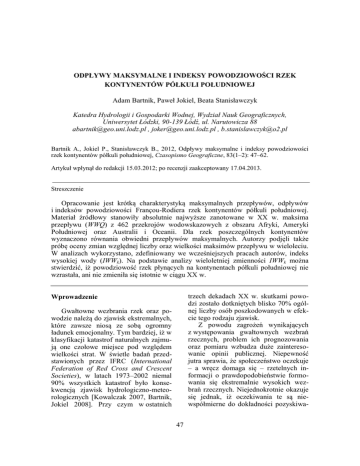 ODPŁYWY MAKSYMALNE I INDEKSY POWODZIOWOŚCI RZEK KONTYNENTÓW PÓŁKULI POŁUDNIOWEJ Adam Bartnik, Paweł Jokiel, Beata Stanisławczyk Katedra Hydrologii i Gospodarki Wodnej, Wydział Nauk Geograficznych, Uniwersytet Łódzki, 90-139 Łódź, ul. Narutowicza 88 [email protected] , [email protected] , [email protected] Bartnik A., Jokiel P., Stanisławczyk B., 2012, Odpływy maksymalne i indeksy powodziowości rzek kontynentów półkuli południowej, Czasopismo Geograficzne, 83(1–2): 47–62. Artykuł wpłynął do redakcji 15.03.2012; po recenzji zaakceptowany 17.04.2013. Streszczenie Opracowanie jest krótką charakterystyką maksymalnych przepływów, odpływów i indeksów powodziowości Françou-Rodiera rzek kontynentów półkuli południowej. Materiał źródłowy stanowiły absolutnie najwyższe zanotowane w XX w. maksima przepływu (WWQ) z 462 przekrojów wodowskazowych z obszaru Afryki, Ameryki Południowej oraz Australii i Oceanii. Dla rzek poszczególnych kontynentów wyznaczono równania obwiedni przepływów maksymalnych. Autorzy podjęli także próbę oceny zmian względnej liczby oraz wielkości maksimów przepływu w wieloleciu. W analizach wykorzystano, zdefiniowany we wcześniejszych pracach autorów, indeks wysokiej wody (IWWk). Na podstawie analizy wieloletniej zmienności IWWk można stwierdzić, iż powodziowość rzek płynących na kontynentach półkuli południowej nie wzrastała, ani nie zmieniła się istotnie w ciągu XX w. trzech dekadach XX w. skutkami powodzi zostało dotkniętych blisko 70% ogólnej liczby osób poszkodowanych w efekcie tego rodzaju zjawisk. Z powodu zagrożeń wynikających z występowania gwałtownych wezbrań rzecznych, problem ich prognozowania oraz pomiaru wzbudza duże zainteresowanie opinii publicznej. Niepewność jutra sprawia, że społeczeństwo oczekuje – a wręcz domaga się – rzetelnych informacji o prawdopodobieństwie formowania się ekstremalnie wysokich wezbrań rzecznych. Niejednokrotnie okazuje się jednak, iż oczekiwania te są niewspółmierne do dokładności pozyskiwa- Wprowadzenie Gwałtowne wezbrania rzek oraz powodzie należą do zjawisk ekstremalnych, które zawsze niosą ze sobą ogromny ładunek emocjonalny. Tym bardziej, iż w klasyfikacji katastrof naturalnych zajmują one czołowe miejsce pod względem wielkości strat. W świetle badań przedstawionych przez IFRC (International Federation of Red Cross and Crescent Societies), w latach 1973–2002 niemal 90% wszystkich katastrof było konsekwencją zjawisk hydrologiczno-meteorologicznych [Kowalczak 2007, Bartnik, Jokiel 2008]. Przy czym w ostatnich 47 A. Bartnik, P. Jokiel, B. Stanisławczyk nych danych hydrometrycznych. Ekstremalne zjawiska hydrologiczne, w tym największe przepływy rzeczne, cechuje bowiem znaczna indywidualność oraz nieprzewidywalność. Z tego względu wszelkie dane dotyczące skali i częstości tych zdarzeń można uznać za bezcenne, mimo że są zwykle obarczone znacznymi błędami. Dla prognozowania hydrologicznych zjawisk ekstremalnych należy wykorzystywać tylko te dane, które wyróżniają się wiarygodnością, serie pomiarów są ciągłe, a badania prowadzone były w sposób celowy [Langbein 1972]. Te trzy kryteria sprawiają, że uzyskane prognozy nie są jedynie domniemanymi scenariuszami ich autorów i przysłowiowym „wróżeniem z fusów”. Nabierają one bowiem cech naukowej obiektywności oraz wiarygodności. W ostatnich latach, w publikatorach i w środowisku naukowym dyskutowany jest również problem sprowadzający się do pytania: czy wraz z upływem lat wzrasta częstotliwość oraz skala ekstremalnie wysokich przepływów rzecznych [Kundzewicz, Kowalczak 2008, Milliman, Farnswarth 2011] ? Z oczywistych powodów rośnie także chęć poznania genezy ewentualnych zmian ustroju rzek. Prezentowane opracowanie wpisuje się w ten nurt badawczy. Zawiera bowiem analizę zmian częstości oraz wysokości najwyższych zanotowanych przepływów rzek płynących na kontynentach półkuli południowej w XX w. W opracowaniu podjęto jednocześnie próbę ustalenia, czy w tej części świata wzrastał stopień powodziowości rzek w ostatnim stuleciu. Jest ono kontynuacją wcześniejszych badań autorów dotyczących powodziowości rzek półkuli północnej [Bartnik, Jokiel 2008], zaś w szerszym kontekście zostało ujęte w najnowszym ich dziele [Bartnik, Jokiel 2012]. Zawarto w nim, między innymi, informacje dotyczące klimatycznych uwarunkowań formowania się wezbrań na poszczególnych kontynentach półkuli południowej. Interesu- jącym zagadnieniem może być także porównanie obu półkul pod względem powodziowości rzek płynących na ich kontynentach. Metody badań Materiał badawczy opracowania stanowiły maksymalne przepływy (WWQ) zanotowane w XX w. na posterunkach wodowskazowych zamykających zlewnie rzek Afryki, Ameryki Południowej oraz Australii i Oceanii. Zebrane dane hydrometryczne posłużyły do wyznaczenia tzw. obwiedni przepływów maksymalnych rzek poszczególnych kontynentów półkuli południowej. W odniesieniu do rzek świata podobną zależność wyznaczyli wcześniej J. A. Rodier oraz M. Roche [1984]. Ma ona postać: WWQ C An [m3·s–1] [1] gdzie: WWQ – najwyższy możliwy przepływ [m3·s–1], A – powierzchnia zlewni [km2], C – parametr odzwierciedlający czynniki wpływające na odpływ maksymalny, n – parametr określający krzywiznę funkcji obwiedni. Powyższa formuła pozwala na wyznaczenie przybliżonego maksymalnego możliwego przepływu rzek dla danej powierzchni zlewni. Dzięki temu może być wykorzystywana we wstępnym szacowaniu wielkości tych ekstremalnych zjawisk hydrologicznych. Natężenie przepływu, za pomocą którego określa się najczęściej kulminację przepływu wezbraniowego, uniemożliwia porównywanie rzek o różnej zasobności wodnej. Dlatego do analiz porównawczych stosuje się najczęściej tzw. odpływ jednostkowy, podawany w dm3