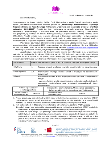 Toruń, 21 kwietnia 2016 roku Szanowni Państwo, Stowarzyszenie Na Rzecz Lesbijek, Gejów, Osób Biseksualnych, Osób Transpłciowych Oraz Osób Queer „Pracownia Różnorodności” realizuje projekt pn. „Monitoring i analiza realizacji Krajowego Programu Działań na Rzecz Równego Traktowania w zakresie płci, tożsamości płciowej i orientacji seksualnej (2013-2016)”. Projekt ten jest realizowany w ramach programu Obywatele dla Demokracji, finansowanego z Funduszy EOG, na podstawie umowy zawartej z operatorem ww. programu, tj. Fundacją im. Stefana Batorego działającą w partnerstwie z Polską Fundacją Dzieci i Młodzieży. Projekt zakłada m.in. zebranie informacji o działaniach podmiotów – w tym organów władzy publicznej, służb i innych instytucji publicznych, a także organizacji pozarządowych – wymienionych w Krajowym Programie Działań na Rzecz Równego Traktowania (KPDRT). W związku z powyższym Stowarzyszenie uprzejmie prosi o udostępnienie mu, na podstawie przepisów ustawy z 06 września 2001 roku o dostępie do informacji publicznej (Dz. U. z 2001 roku, Nr 112, poz. 1198 z późn. zm.) – pocztą elektroniczną, na adres [email protected] – informacji w poniższym zakresie, w tym odpowiedzi na poniższe pytania. Uzupełniająco wyjaśniamy, że Stowarzyszenie zebrało już informacje m.in. w poniższym zakresie, w odniesieniu do okresu 2013-2014, od ok. 500 jednostek samorządu terytorialnego wysyłając do nich pytania jn. na piśmie, pocztą tradycyjną, oraz pocztą elektroniczną. Niniejszy wniosek jest kontynuacją ww. zbierania informacji i odnosi się wyłącznie do okresu 2015-2016. Obszar KPDRT Równe traktowanie na rynku pracy i w systemie zabezpieczenia społecznego Cel główny 1. Cel szczegółowy 1.4 Poprawa sytuacji w zakresie równości kobiet i mężczyzn na rynku pracy Promowanie równego udziału kobiet i mężczyzn na stanowiskach decyzyjnych Działanie 2 Promowanie udziału kobiet w gospodarczym procesie podejmowania decyzji: - upowszechnianie wśród przedsiębiorstw, instytucji, uczelni, jednostek samorządu terytorialnego oraz organizacji pozarządowych Karty Różnorodności (…). Podmiot odpowiedzialny Ministerstwo Skarbu Państwa, Ministerstwo Gospodarki, za realizację działania: Pełnomocnik Rządu do Spraw Równego Traktowania Termin realizacji działania w KPDRT: od 2013 Pytany uczestniczy w działaniu jako: adresat 1. Proszę podać, czy jesteście bądź w 2015 roku byliście Państwo adresatem ww. działania KPDRT realizowanego przez wyżej wymieniony, odpowiedzialny za nie podmiot, a w szczególności wskazać, czy wiecie Państwo o istnieniu Karty Różnorodności, o której mowa w KPDRT. 2. Jeśli jesteście bądź w 2015 roku byliście Państwo adresatem ww. działania KPDRT, proszę: 1) podać, który z ww. podmiotów odpowiedzialnych za realizację ww. działania KPDRT zwrócił się do Państwa w tej sprawie oraz kiedy, w jaki sposób i w jakiej formie to nastąpiło, 2) opisać, na czym polega i jak przebiega upowszechnianie u Państwa Karty Różnorodności (np. jeśli były bądź są to spotkania i podobne działania – proszę podać, kiedy i gdzie się odbyły, ile osób w nich uczestniczyło, czy były to osoby wyłącznie z Państwa urzędu, a jeśli nie – kto jeszcze wziął udział w spotkaniu bądź spotkaniach), względnie wskazać, że Karta Różnorodności nie jest u Państwa upowszechniania, Strona 1 z 2 Monitoring i analiza realizacji Krajowego Programu Działań na Rzecz Równego Traktowania w zakresie płci, tożsamości płciowej i orientacji seksualnej (2013-2016). Projekt realizowany w ramach programu Obywatele dla Demokracji, finansowanego z Funduszy EOG. Stowarzyszenie na Rzecz Lesbijek, Gejów, Osób Biseksualnych, Osób Transpłciowych Oraz Osób Queer „Pracownia Różnorodności” ul. Jana Mohna 50H/8 | 87-100 Toruń, Polska | www.spr.org.pl | KRS: 0000333869 | Regon: 340629772 | NIP: 956-226-35-60 3) podać, czy jesteście Państwo sygnatariuszem Karty Różnorodności, a jeśli nie – wskazać przyczynę tego stanu rzeczy. Obszar KPDRT Równe traktowanie w dostępie do dóbr i usług Cel główny 6 Zwiększenie udziału kobiet w procesie podejmowania decyzji Cel szczegółowy 6.1 Zwiększenie liczby samorządowych Działanie 1 Działania na rzecz wzmocnienia potencjału politycznego kobiet (edukacja, programy mentorskie, networking) Podmiot odpowiedzialny za realizację działania: Termin realizacji od 2013 działania: kobiet w Parlamencie i we władzach Pełnomocnik Rządu do Spraw Równego Traktowania Pytany uczestniczy w działaniu jako: podmiot wskazany do współpracy 1. Proszę podać, czy w 2015 roku współpracowaliście Państwo albo nadal współpracuje w realizacji ww. działania KPDRT z ww. podmiotem odpowiedzialnym za jego realizację. W razie braku współpracy, proszę podać przyczynę takiego stanu rzeczy (np. brak propozycji współpracy ze strony Pełnomocnika Rządu do Spraw Równego Traktowania). W razie zakończenia współpracy, proszę podać, kiedy to nastąpiło oraz podać przyczynę takiego stanu rzeczy. 2. Jeśli w 2015 roku współpracowaliście Państwo albo nadal współpracujecie w realizacji ww. działania KPDRT z ww. podmiotem odpowiedzialnym za jego realizację, proszę: 1) podać kiedy w ww. okresie i jak zaczęła się współpraca oraz z czyjej inicjatywy do niej doszło, 2) opisać, na czym polegała albo polega oraz jak przebiegała albo przebiega współpraca (np. jeśli był albo jest to udział w działaniach edukacyjnych – proszę podać, kiedy i gdzie się odbyły, czego dotyczyły, czym się zakończyły oraz ile osób wzięło albo bierze w nich udział etc.; jeśli były albo są to programy mentorskie – proszę podać, czy uczestniczyli albo uczestniczycie Państwo w ich przygotowaniu, kto je przygotował, kto je organizuje i prowadzi, ile osób wzięło albo bierze w nich udział etc.; jeśli były albo są to inne d