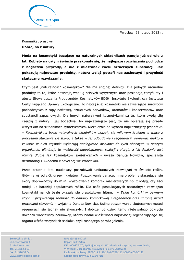 Wrocław, 23 lutego 2012 r. Komunikat prasowy Dobre, bo z natury Moda na kosmetyki bazujące na naturalnych składnikach panuje już od wielu lat. Kobiety na całym świecie przekonały się, że najlepsze rozwiązania pochodzą z bogactwa przyrody, a nie z mieszanek wielu sztucznych substancji. Jak pokazują najnowsze produkty, natura wciąż potrafi nas zaskoczyć i przynieść skuteczne rozwiązania. Czym jest „naturalność” kosmetyków? Nie ma spójnej definicji. Dla jednych naturalne produkty to te, które powstają według ścisłych wytycznych oraz posiadają certyfikaty i atesty Stowarzyszenia Producentów Kosmetyków BDIH, Instytutu Ekologii, czy Instytutu Certyfikującego Uprawy Ekologiczne. To najczęściej kosmetyki nie zawierające surowców pochodzących z ropy naftowej, sztucznych barwników, aromatów i konserwantów oraz substancji zapachowych. Dla innych naturalnymi kosmetykami są te, które swoją siłę czerpią z natury i jej bogactwa, bo najważniejsze jest, że nie opierają się przede wszystkim na składnikach syntetycznych. Niezależnie od wyboru najważniejszy jest efekt. – Kosmetyki na bazie naturalnych składników okazały się milowym krokiem w walce z procesami starzenia się skóry, a także w jej odbudowie i regeneracji. Ponieważ niektóre zawarte w nich czynniki wykazują analogiczne działanie do tych obecnych w naszym organizmie, eliminuje to możliwość niepożądanych reakcji i alergii, a ich działanie jest równie długie jak kosmetyków syntetycznych - uważa Danuta Nowicka, specjalista dermatolog z Akademii Medycznej we Wrocławiu. Przez ostatnie lata naukowcy poszukiwali unikatowych rozwiązań w świecie roślin. Głównie wśród ziół, drzew i kwiatów. Poszukiwania panaceum na problemy starzejącej się skóry doprowadziły do m.in. wyizolowania komórek macierzystych np. z łodyg, czy liści mniej lub bardziej popularnych roślin. Dla osób poszukujących naturalnych rozwiązań kosmetyki na ich bazie okazały się prawdziwym hitem. – Takie komórki w pewnym stopniu przywracają zdolność do odnowy komórkowej i regeneracji oraz chronią przed procesami starzenia – wyjaśnia Danuta Nowicka. Usilne poszukiwania skutecznych metod regeneracji się jednak nie skończyły. I dobrze, bo dzięki temu niebywałego odkrycia dokonali wrocławscy naukowcy, którzy badali właściwości najszybciej regenerującego się organu wśród wszystkich ssaków, czyli rosnącego poroża jelenia. Stem Cells Spin S.A. ul. Lenartowicza 6 51-140 Wrocław tel. 71 326 54 07 fax 71 326 54 04 www.stemcellsspin.com.pl NIP: 895-194-47-27 Regon: 020927052 KRS : 000377470, Sąd Rejonowy dla Wrocławia – Fabrycznej we Wrocławiu, VI Wydział Gospodarczy Krajowego Rejestru Sądowego. Rachunek bankowy: PEKAO S.A. 98-1240-6768-1111-0010-4030-0143. Kapitał zakładowy 663 650,00 PLN Okazało się, że te niesamowite możliwości, to zasługa komórek macierzystych, których potencjał znacznie przewyższa wszystkie obecne na rynku roślinne komórki. – Ich działanie może prowadzić nie tylko do uzupełnienia niedoborów substancji aktywnych w organizmie, ale przede wszystkim do pełnej regeneracji i odnowy uszkodzonych tkanek. Stosowane w kosmetologii, a także medycynie mogą przynieść niesamowite wręcz rezultaty – mówi dr hab. Marek Cegielski, dyrektor ds. badań i rozwoju w Stem Cells Spin S.A. Polscy naukowcy dokonali tego odkrycia jako pierwsi na świecie. Ku uciesze wszystkich kobiet poszukujących skutecznych, innowacyjnych rozwiązań, poszli o krok dalej i jeszcze w pierwszym półroczu 2012 roku wprowadzą na rynek kosmetyki na bazie tego wyjątkowego fenomenu natury. - Zaczniemy od produktów do twarzy i włosów. To będzie unikatowa kuracja antystarzeniowa i regeneracyjna – dodaje dr hab. Marek Cegielski. Dla osób poszukujących kosmetyków, które opierają swą moc na bogactwie i mądrości natury, to może być ciekawa alternatywa. Zwłaszcza, że od dawna mówiło się, że ta półka będzie należała do komórek macierzystych. A te odkryte przez polskich naukowców mają niespotykane dotąd możliwości. Więcej informacji: Anna Knowska +48 512 198 870 [email protected] Stem Cells Spin S.A. ul. Lenartowicza 6 51-140 Wrocław tel. 71 326 54 07 fax 71 326 54 04 www.stemcellsspin.com.pl NIP: 895-194-47-27 Regon: 020927052 KRS : 000377470, Sąd Rejonowy dla Wrocławia – Fabrycznej we Wrocławiu, VI Wydział Gospodarczy Krajowego Rejestru Sądowego. Rachunek bankowy: PEKAO S.A. 98-1240-6768-1111-0010-4030-0143. Kapitał zakładowy 663 650,00 PLN