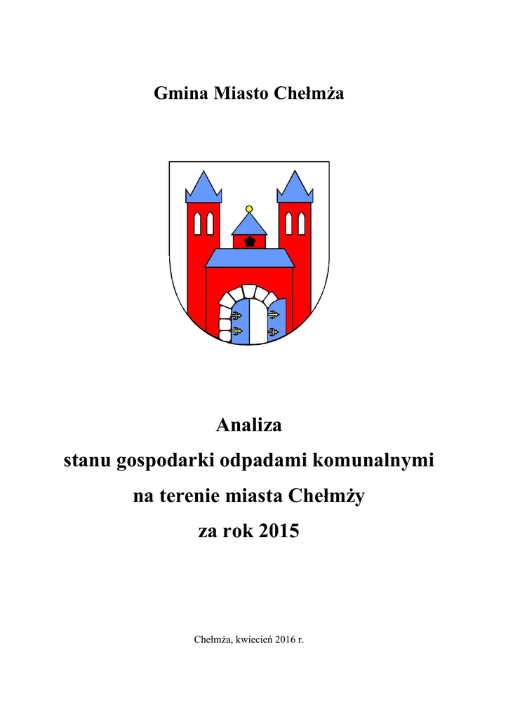 Gmina Miasto Chełmża Analiza stanu gospodarki odpadami komunalnymi na terenie miasta Chełmży za rok 2015 Chełmża, kwiecień 2016 r. ANALIZA STANU GOSPODARKI ODPADAMI KOMUNALNYMI NA TERENIE MIASTA CHEŁMŻY ZA ROK 2015 SPIS TREŚCI 1. Uwarunkowania formalno-prawne……………………………………………………… 3 2. Możliwości przetwarzania zmieszanych odpadów komunalnych, odpadów zielonych oraz pozostałości z sortowania i pozostałości z mechaniczno-biologicznego przetwarzania odpadów komunalnych przeznaczonych do składowania………………...3 3. Potrzeby inwestycyjne związane z gospodarowaniem odpadami komunalnymi………...4 4. Koszty poniesione w związku z odbieraniem, odzyskiem, recyklingiem i unieszkodliwianiem odpadów komunalnych……………………………………………6 5. Liczba mieszkańców objęta systemem gospodarowania odpadami komunalnymi………8 6. Liczba właścicieli nieruchomości, którzy nie zawarli umowy, o której mowa w art. 6 ust. 1 u.c.p.g., w imieniu których gmina powinna podjąć działania, o których mowa w art. 6 ust. 6-12 u.c.p.g………………………………………………………………………….10 7. Ilość odpadów komunalnych wytwarzanych na terenie miasta…………………………10 8. Ilość zmieszanych odpadów komunalnych, odpadów zielonych odbieranych z terenu miasta oraz powstających z przetwarzania odpadów komunalnych pozostałości z sortowania i pozostałości z mechaniczno-biologicznego przetwarzania odpadów komunalnych przeznaczonych do składowania…………………………………………12 9. Poziomy recyklingu, przygotowania do ponownego użycia i odzysku innymi metodami wybranych frakcji odpadów komunalnych, osiągnięte przez miasto Chełmża w 2015 r. …………………………………………………………………………………………..14 10. Podsumowanie…………………………………………………………………………..16 2|S tr o na ANALIZA STANU GOSPODARKI ODPADAMI KOMUNALNYMI NA TERENIE MIASTA CHEŁMŻY ZA ROK 2015 1. Uwarunkowania formalno-prawne. Obowiązek sporządzenia przedmiotowego opracowania wynika wprost z zapisów art. 3 ust. 2 pkt 10 ustawy z dnia 13 września 1996 r. o utrzymaniu czystości i porządku w gminach (t.j. Dz. U. z 2016 r., poz. 250). Celem corocznej analizy stanu gospodarki odpadami komunalnymi jest weryfikacja możliwości technicznych i organizacyjnych gminy w zakresie gospodarowania odpadami komunalnymi. Podstawą do opracowania analizy są sprawozdania złożone przez podmioty odbierające odpady komunalne od właścicieli nieruchomości i podmioty prowadzące punkty selektywnego zbierania odpadów komunalnych, roczne sprawozdanie z realizacji zadań z zakresu gospodarowania odpadami komunalnymi oraz inne dostępne dane wpływające na koszty systemu gospodarowania odpadami komunalnymi. Na podstawie art. 9tb ust. 2 i 3 cytowanej ustawy analizę sporządza się w terminie do dnia 30 kwietnia za poprzedni rok kalendarzowy i podlega ona publicznemu udostępnieniu na stronie podmiotowej Biuletynu Informacji Publicznej urzędu gminy. 2. Możliwości przetwarzania zmieszanych odpadów komunalnych, odpadów zielonych oraz pozostałości z sortowania i pozostałości z mechaniczno-biologicznego przetwarzania odpadów komunalnych przeznaczonych do składowania. Zgodnie z definicją zawartą w ustawie z dnia 14 grudnia 2012 r. o odpadach (Dz. U. z 2013 r., poz. 21 z późn. zm.) przetwarzanie odpadów to procesy odzysku lub unieszkodliwiania, w tym przygotowanie poprzedzające odzysk lub unieszkodliwianie. Możliwości przetwarzania zmieszanych odpadów komunalnych (kod odpadu 20 03 01) związane są z ich zagospodarowaniem w regionalnych instalacjach do odzysku (mechanicznobiologiczne), bądź unieszkodliwiania (składowanie odpadów na składowiskach). 3|S tr o na ANALIZA STANU GOSPODARKI ODPADAMI KOMUNALNYMI NA TERENIE MIASTA CHEŁMŻY ZA ROK 2015 Zgodnie z przyjętym przez Sejmik Województwa Kujawsko-Pomorskiego „Planem Gospodarki Odpadami Województwa Kujawsko-Pomorskiego na lata 2012-2017 z perspektywą na lata 2018-2023”, Miasto Chełmża wchodzi w skład Regionu Chełmińsko-Wąbrzeskiego (oznaczonego nr 2), obejmującego powiaty: brodnicki, chełmiński, golubsko-dobrzyński, toruński, wąbrzeski, zamieszkałego przez 167 tys. mieszkańców. Regionalnymi instalacjami przetwarzania odpadów komunalnych, zwanymi danej RIPOK, dla regionu nr 2 są następujące instalacje: - Osnowo II (sortownia, instalacja do kompostowania oraz stabilizacji frakcji biodegradowalnej), - Osnowo I (składowisko odpadów), - Niedźwiedź (sortownia, kompostownia odpadów zielonych, składowisko, instalacja do mechaniczno-biologicznego przetwarzania odpadów). W związku z faktem, iż moce przerobowe wskazanych instalacji, określone w wojewódzkim planie gospodarki odpadami, w zupełności zabezpieczają zapotrzebowanie regionu, nie zachodzi konieczność działań inwestycyjnych ze strony Gminy Miasto Chełmża w zakresie budowy instalacji do zagospodarowywania odpadów. 3. Potrzeby inwestycyjne związane z gospodarowaniem odpadami komunalnymi. Na podstawie informacji dostarczonych do tut. Urzędu przez przedsiębiorcę zajmującego się odbiorem i zagospodarowaniem odpadów komunalnych tj. Zakład Gospodarki Komunalnej Sp. z o.o. w Chełmży, jedną z potrzeb inwestycyjnych związanych z gospodarowaniem odpadami komunalnymi na terenie miasta Chełmży jest Budowa czterostanowiskowej linii sortowniczej do segregacji tworzyw sztucznych zebranych w sposób selektywny. Przedmiotowa inwestycja została wpisana do znowelizowanego, „Planu Gospodarki Odpadami Województwa Kujawsko-Pomorskiego na lata 2012-2017 z perspektywą na lata 2018-2023” i w przypadku uzyskania pozytywnej opinii co do zasadności budowy przedmiotowej linii sortowniczej z Ministerstwa Środowiska, inwestycja zostanie zrealizowana w r