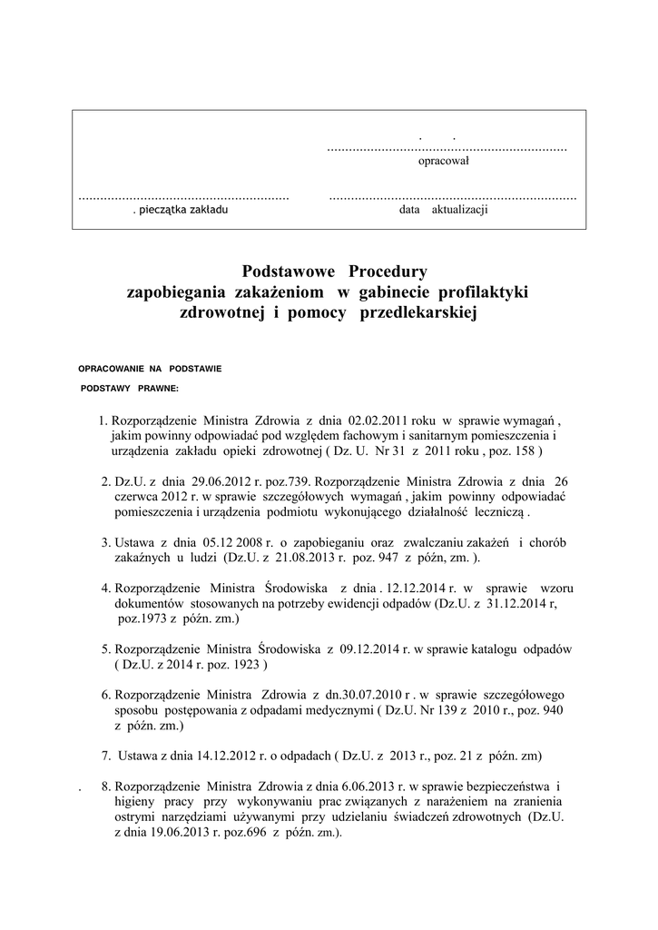 . . .................................................................. opracował .......................................................... . pieczątka zakładu .................................................................... data aktualizacji Podstawowe Procedury zapobiegania zakażeniom w gabinecie profilaktyki zdrowotnej i pomocy przedlekarskiej OPRACOWANIE NA PODSTAWIE PODSTAWY PRAWNE: 1. Rozporządzenie Ministra Zdrowia z dnia 02.02.2011 roku w sprawie wymagań , jakim powinny odpowiadać pod względem fachowym i sanitarnym pomieszczenia i urządzenia zakładu opieki zdrowotnej ( Dz. U. Nr 31 z 2011 roku , poz. 158 ) 2. Dz.U. z dnia 29.06.2012 r. poz.739. Rozporządzenie Ministra Zdrowia z dnia 26 czerwca 2012 r. w sprawie szczegółowych wymagań , jakim powinny odpowiadać pomieszczenia i urządzenia podmiotu wykonującego działalność leczniczą . 3. Ustawa z dnia 05.12 2008 r. o zapobieganiu oraz zwalczaniu zakażeń i chorób zakaźnych u ludzi (Dz.U. z 21.08.2013 r. poz. 947 z późn, zm. ). 4. Rozporządzenie Ministra Środowiska z dnia . 12.12.2014 r. w sprawie wzoru dokumentów stosowanych na potrzeby ewidencji odpadów (Dz.U. z 31.12.2014 r, poz.1973 z późn. zm.) 5. Rozporządzenie Ministra Środowiska z 09.12.2014 r. w sprawie katalogu odpadów ( Dz.U. z 2014 r. poz. 1923 ) 6. Rozporządzenie Ministra Zdrowia z dn.30.07.2010 r . w sprawie szczegółowego sposobu postępowania z odpadami medycznymi ( Dz.U. Nr 139 z 2010 r., poz. 940 z późn. zm.) 7. Ustawa z dnia 14.12.2012 r. o odpadach ( Dz.U. z 2013 r., poz. 21 z późn. zm) . 8. Rozporządzenie Ministra Zdrowia z dnia 6.06.2013 r. w sprawie bezpieczeństwa i higieny pracy przy wykonywaniu prac związanych z narażeniem na zranienia ostrymi narzędziami używanymi przy udzielaniu świadczeń zdrowotnych (Dz.U. z dnia 19.06.2013 r. poz.696 z późn. zm.). 9.. Rozporządzenie Ministra Zdrowia z dn 27.05.2010 r. w sprawie zakresu , sposobu i częstotliwości prowadzenia kontroli wewnętrznej w obszarze realizacji działań zapobiegających szerzeniu się zakażeń i chorób zakaźnych (Dz.U. Nr 100 poz.646). CEL : 1. 2. 3. 4. ADRESAT : Eliminowanie czynników ryzyka przeniesienia zakażeń ze środowiska gabinetu Podniesienie jakości świadczonych usług pielęgniarskich , Bezpieczeństwo epidemiologiczne uczniów i pracowników szkoły, Ujednolicenie zasad postępowania w utrzymaniu czystości środowiska gabinetu profilaktyki zdrowotnej i pomocy przedlekarskiej, pielęgniarki / higienistki szkolne , SPOSÓB WDROŻENIA PROCEDUR : Szkolenia pielęgniarek / higienistek podczas szkoleń wstępnych ,okresowych, instruktarzy indywidualnych na stanowisku pracy. Przyjęcie do wiadomości i stosowania pracownicy potwierdzają datą i własnoręcznym podpisem . ODPOWIEDZIALNOŚĆ: 1. Bieżący nadzór i odpowiedzialność za pracę osób sprzątających w gabinecie profilaktyki zdrowotnej sprawuje pielęgniarka / higienistka pracująca w danym gabinecie ............................................................................................................................................ 2. Za stosowanie procedur odpowiada pielęgniarka/ higienistka pracująca w gabinecie w ( podać nazwę placówki oraz imię i nazwisko pielęgniarki / higienistki) : ................................................................................................................................................... ................................................................................................................................................... 3. Bieżący nadzór nad przestrzeganiem procedur sprawuje kierownik / właściciel zakładu ( podać nazwę firmy oraz imię i nazwisko osoby nadzorującej ....................................... ........................................................................................................ ........................................................................................................ WYKAZ OBOWIĄZUJĄCYCH PROCEDUR : Załącznik Załącznik Załącznik Załącznik nr 1 nr 2 nr 3 nr 4 - Procedura higiena rąk i stosowanie środków ochrony indywidualnej (P -01) - Procedura mycia i dezynfekcji lodówki (P-02) - Procedura sprzątania i dezynfekcji gabinetu (P-03) - Procedura utrzymania w czystości szafek ,stolików zabiegowych oraz sprzętu (P -04) Załącznik nr 5 - Procedura postępowania z odpadami (P-05) Załącznik nr 6 - Procedura po ekspozycji zawodowej na materiał zakaźny (P-06) Załącznik nr 7 - Procedura postępowania z czystą i brudną bielizną (P-07) ..................................................... pieczątka i podpis kierownika Zakład PODSTAWOWE DEFINICJE I POJĘCIA : Dekontaminacja - proces niszczenia biologicznych czynników chorobotwórczych poprzez mycie dezynfekcję i sterylizację , Dezynfekcja - proces redukcji biologicznych czynników chorobotwórczych poprzez zastosowanie metod fizycznych lub chemicznych , Mycie – etap dekontaminacji usuwający zarówno zabrudzenia jak i pewną ilość biologicznych czynników chorobotwórczych , Przestrzeń socjalna personelu – wyznaczona przestrzeń w gabinecie lub w jego obrębie, dostępna wyłącznie dla personelu w , której można przebrać się lub spożywać posiłki : Przestrzeń zabiegowa - przestrzeń , w której wykonywane są procedury medyczne u uczniów oraz czynności przygotowawcze np. przygotowanie opatrunku , badanie przesiewowe , Pomieszczenie porządkowe należące do placówki szkolnej – pomieszczenie służące do przechowywania środków czystości oraz preparatów myjąco-dezynfekcyjnych , przygotowania ich roztworów roboczych oraz mycia i dezynfekcji sprzętu sprzątającego ; Preparat myjący (detergent ) –preparat usuwający zanieczyszczenia poprzez zmianę pH , obniżenie twardości wody , rozkład cząstek organicznych lub ułatwienie mieszania z wodą ; Preparat dezynfekcyjny – preparat biobójczy redukujący czynniki chorobotwórcze , dopuszczony do o