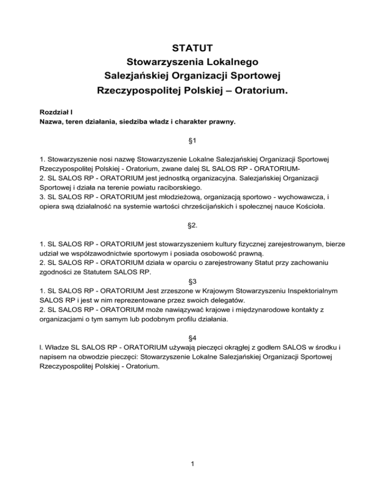 STATUT Stowarzyszenia Lokalnego Salezjańskiej Organizacji Sportowej Rzeczypospolitej Polskiej – Oratorium. Rozdział I Nazwa, teren działania, siedziba władz i charakter prawny. §1 1. Stowarzyszenie nosi nazwę Stowarzyszenie Lokalne Salezjańskiej Organizacji Sportowej Rzeczypospolitej Polskiej - Oratorium, zwane dalej SL SALOS RP - ORATORIUM2. SL SALOS RP - ORATORIUM jest jednostką organizacyjna. Salezjańskiej Organizacji Sportowej i działa na terenie powiatu raciborskiego. 3. SL SALOS RP - ORATORIUM jest młodzieżową, organizacją sportowo - wychowawcza, i opiera swą działalność na systemie wartości chrześcijańskich i społecznej nauce Kościoła. §2. 1. SL SALOS RP - ORATORIUM jest stowarzyszeniem kultury fizycznej zarejestrowanym, bierze udział we współzawodnictwie sportowym i posiada osobowość prawną. 2. SL SALOS RP - ORATORIUM działa w oparciu o zarejestrowany Statut przy zachowaniu zgodności ze Statutem SALOS RP. §3 1. SL SALOS RP - ORATORIUM Jest zrzeszone w Krajowym Stowarzyszeniu Inspektorialnym SALOS RP i jest w nim reprezentowane przez swoich delegatów. 2. SL SALOS RP - ORATORIUM może nawiązywać krajowe i międzynarodowe kontakty z organizacjami o tym samym lub podobnym profilu działania. §4 l. Władze SL SALOS RP - ORATORIUM używają pieczęci okrągłej z godłem SALOS w środku i napisem na obwodzie pieczęci: Stowarzyszenie Lokalne Salezjańskiej Organizacji Sportowej Rzeczypospolitej Polskiej - Oratorium. 1 ROZDZIAŁ II Cele i środki dziabania. §5. Celem SLSALOS RP-ORATORIUM jest: 1. Rozwijanie wychowawczych, kulturalnych i społecznych aspektów sportu, w ramach uznanego wzoru człowieka i społeczeństwa wyraźnie - inspirowanych wizją chrześcijańską, prewencyjnym systemem św., Jana Bosko i bogactwem salezjańskiej tradycji wychowawczej. 2. Krzewienie kultury fizycznej wśród dzieci i młodzieży, rozwijanie zainteresowań sportowych i podnoszenie na wyższy poziom stanu zdrowia i sprawności fizycznej 3. Zapewnienie warunków do rozwoju wszystkim członkom dla osiągnięcia celów stowarzyszenia. 4. Dziabnie na rzecz ochrony środowiska naturalnego, 5. Kształtowanie poczucia współodpowiedzialności za wychowanie i losy członków stowarzyszenia6. Współpraca i kontakt z organizacjami oświatowe - wychowawczymi i sportowymi. 7. Eksponowanie w działalności sportowo - wychowawczej zasady fair play. SL SALOS RP - ORATORIUM nie czerpie korzyści materialnych z działalności sportowej. §6. SL SALOS RP ~ ORATORIUM realizuje swoje cele przez prowadzenie specyficznej działalności aa polu sportowym, inicjatyw kulturalnych, pedagogicznych, opiekuńczych, a w szczególności przez; 1. Opracowanie wieloletnich i jednorocznych programów działalności. 2. Realizowanie przyjętych zadań przez instytucjonalne organa stowarzyszenia 3- Organizowanie szkolenia i doskonalenia kadry wychowawczo instruktorskiej i pozyskiwanie animatorów sportowych. 4. Współdziałanie z instytucjami państwowymi i samorządowymi: szkołami, związkami i organizacjami sportowymi. 5. Utrzymywanie kontaktów z organizacjami sportowymi w kraju i za granicą, 6. Organizowanie i propagowanie różnych form sportu, rekreacji i turystyki. 7. Prowadzenie działalności wydawniczej i gospodarczej. ROZDZIAŁ III Członkowie, ich prawa i obowiązki. §7. 1. Członkami SL SALOS RP - ORATORIUM mogą być osoby fizyczne i prawne. 2. Członkowie SL SALOS RP - ORATORIUM dzielą się na: l* zwyczajnych 2* honorowych 3* wspierających. 2 §8. 1. Członkami zwyczajnymi mogą być osoby pełnoletnie - przyjęte przez Zarząd SL SALOS aa podstawie pisemnej deklaracji. 2. Członkami mogą. być niepełnoletni uczniowie poniżej 16 roku życia - przyjęci przez zarząd SL SALOS RP - ORATORIUM na podstawie pisemnej deklaracji za zgodą ustawowych opiekunów, oraz małoletni w wieku od 16 - 18 lat na podstawie pisemnej deklaracji, 3. Członkami honorowymi mogą być osoby fizyczne szczególnie zasłużone dla SL SALOS W ORATORIUM, Godność członka honorowego nadaje Walne Zebranie, 4. Członkami wspierającymi mogą być osoby fizyczne i prawne zainteresowane działalnością SL SALOS RP- ORATORIUM i przyjęte przez Zarząd SL SALOS RP - ORATORIUM na podstawie pisemnej deklaracji. §9. 3. Członkowie zwyczajni SL SALOS RP - ORATORIUM mają prawo: l* wybierać i być wybieram do władz SL SALOS RP-ORATORIUM 2* uczestniczyć w krajowych i zagranicznych imprezach sportowych 3*uczestmc2yć w innych działaniach SL SALOS RPORATORIUM 4* znaszać wnioski we wszystkich sprawach dotyczących działalności SL SALOS RP -ORATORIUM i domagać się ich rozpatrzenia, 2. Członkowie niepełnoletni poniżej 16 roku życia mają wszystkie prawa i obowiązki członków zwyczajnych jednak bez prawa udziału w głosowaniu na walnych zebraniach członków oraz bez korzystania z czynnego i biernego prawa wyborczego do władz stowarzyszenia. Natomiast małoletni w wieku od 16 - 18 lat, którzy mają ograniczoną zdolność do czynności prawnych korzystają z praw członków zwyczajnych, z tym że w składzie Zarządu stowarzyszenia Większość muszą stanowić osoby posiadające pełną zdolność do czynności prawnych3. Członkowie honorowi mają wszystkie prawa członków zwyczajnych z wyjątkiem biernego i czynnego prawa wyborczego. 4. Członkowie wspierający mają prawo znaszać postulaty w sprawach dotyczących działalności SL SALOS RP-ORATORIUM. § 10. 1. Członkowie zwyczajni są zobowiązani: 1 * chrome dobrego imienia SL SALOS RP - ORATORIUM, zachowywać nienaganną postawę moralną i obywatelską, przestrzegać zasady fair play w sporcie i poza nim, 2* przestrzegać postanowień statutu i uchwał SL SALOS RP -ORATORIUM, 3* aktywnie uczestniczyć w realizacji celów statutowych, 4* czynnie uczestniczyć w życiu sportowym i organizacyjnym SL SALOS RP ORATORIUM, 5* systematycznie opłacać składki członkowskie, 2. Członkowie honorowi mają wszystkie obowiązki Jak członkowie zw