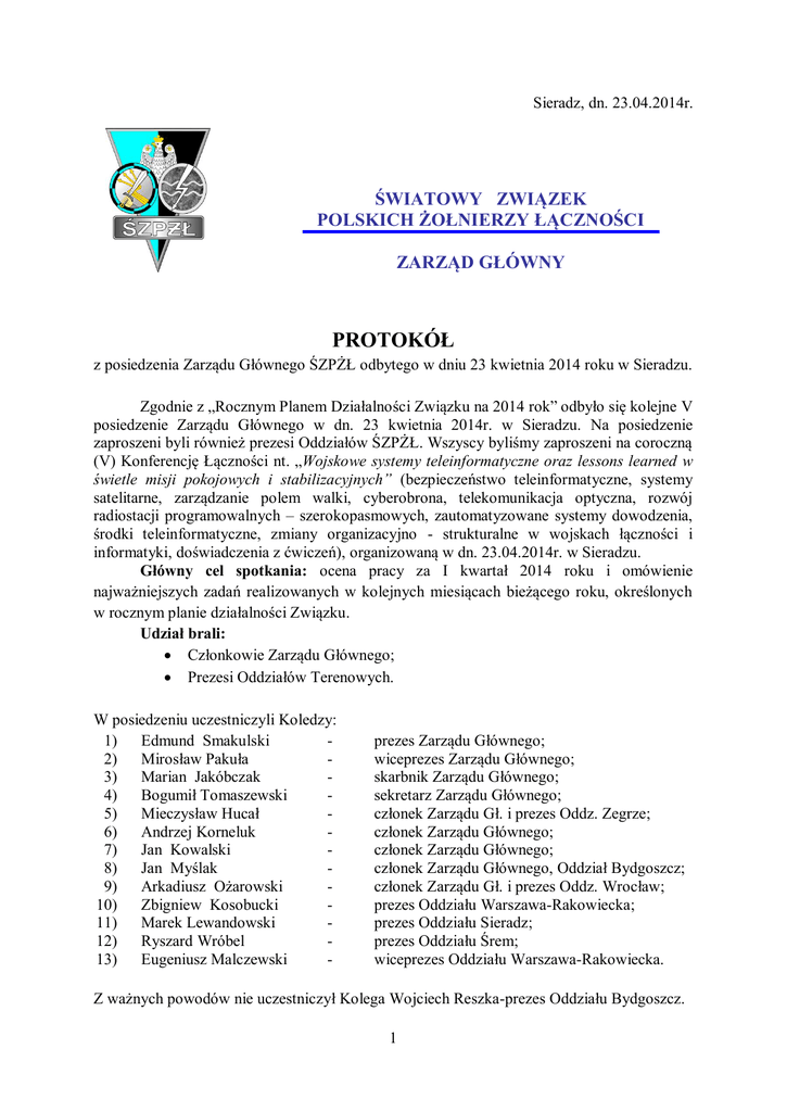 Sieradz, dn. 23.04.2014r. ŚWIATOWY ZWIĄZEK POLSKICH ŻOŁNIERZY ŁĄCZNOŚCI ZARZĄD GŁÓWNY PROTOKÓŁ z posiedzenia Zarządu Głównego ŚZPŻŁ odbytego w dniu 23 kwietnia 2014 roku w Sieradzu. Zgodnie z „Rocznym Planem Działalności Związku na 2014 rok” odbyło się kolejne V posiedzenie Zarządu Głównego w dn. 23 kwietnia 2014r. w Sieradzu. Na posiedzenie zaproszeni byli również prezesi Oddziałów ŚZPŻŁ. Wszyscy byliśmy zaproszeni na coroczną (V) Konferencję Łączności nt. „Wojskowe systemy teleinformatyczne oraz lessons learned w świetle misji pokojowych i stabilizacyjnych” (bezpieczeństwo teleinformatyczne, systemy satelitarne, zarządzanie polem walki, cyberobrona, telekomunikacja optyczna, rozwój radiostacji programowalnych – szerokopasmowych, zautomatyzowane systemy dowodzenia, środki teleinformatyczne, zmiany organizacyjno - strukturalne w wojskach łączności i informatyki, doświadczenia z ćwiczeń), organizowaną w dn. 23.04.2014r. w Sieradzu. Główny cel spotkania: ocena pracy za I kwartał 2014 roku i omówienie najważniejszych zadań realizowanych w kolejnych miesiącach bieżącego roku, określonych w rocznym planie działalności Związku. Udział brali: Członkowie Zarządu Głównego; Prezesi Oddziałów Terenowych. W posiedzeniu uczestniczyli Koledzy: 1) Edmund Smakulski 2) Mirosław Pakuła 3) Marian Jakóbczak 4) Bogumił Tomaszewski 5) Mieczysław Hucał 6) Andrzej Korneluk 7) Jan Kowalski 8) Jan Myślak 9) Arkadiusz Ożarowski 10) Zbigniew Kosobucki 11) Marek Lewandowski 12) Ryszard Wróbel 13) Eugeniusz Malczewski - prezes Zarządu Głównego; wiceprezes Zarządu Głównego; skarbnik Zarządu Głównego; sekretarz Zarządu Głównego; członek Zarządu Gł. i prezes Oddz. Zegrze; członek Zarządu Głównego; członek Zarządu Głównego; członek Zarządu Głównego, Oddział Bydgoszcz; członek Zarządu Gł. i prezes Oddz. Wrocław; prezes Oddziału Warszawa-Rakowiecka; prezes Oddziału Sieradz; prezes Oddziału Śrem; wiceprezes Oddziału Warszawa-Rakowiecka. Z ważnych powodów nie uczestniczył Kolega Wojciech Reszka-prezes Oddziału Bydgoszcz. 1 Porządek posiedzenia: 1. Otwarcie posiedzenia i złożenie życzeń z okazji Jubileuszu 20-lecia działalności Oddziału Warszawa-Rakowiecka ŚZPŻŁ; 2. Informacje członków Zarządu i przedstawienie do akceptacji przez Zarząd Główny uzgodnień (decyzji) podjętych na posiedzeniu Prezydium Z.Gł. w dn. 10.02.2014r.; 3. Ocena pracy za I kwartał 2014r., oraz uzgodnienie realizacji zadań na kolejny okres; 4. Podjęcie decyzji dotyczących wyróżnień członków Związku (będących w kompetencji Zarządu Głównego, patrz Statut Związku §22 i §23); 5. Podjęcie decyzji dotyczącej możliwości opracowania i wydania: „Historii organów kierowniczych wojskowej łączności i informatyki”; 6. Zadania dotyczące udziału w uroczystościach Jubileuszu (10-11.09.2014r) 95 rocznicy sformowania ośrodka szkolenia kadr łączności w Zegrzu; 7. Wstępne ustalenia i przygotowania do VIII Walnego Zjazdu Delegatów. (w 2015 r.); 8. Sprawy różne. Porządek posiedzenia został przyjęty bez uwag. Ad. 1. Prezes Zarządu Głównego w imieniu Zarządu i prezesów Oddziałów złożył, na ręce prezesa Kol. Zbigniewa Kosobuckiego, życzenia z okazji Jubileuszu 20-lecia działalności Oddziału Warszawa-Rakowiecka ŚZPŻŁ, który powołany został 30 marca 1994 roku. „Wyrazy uznania i najwyższego szacunku za zaangażowanie i pracę Członków Oddziału na rzecz upamiętniania historii wojsk łączności i informatyki. Podziękowania za wzorową realizację zadań statutowych Związku. Życzenia zdrowia, satysfakcji i sukcesów na niwie ŚZPŻŁ.” Poinformował że statuetka od Zarządu Gł. wręczona będzie na zebraniu Oddziału. Ad. 2. Informacja prezesa Zarządu Głównego dotyczyła: uzgodnień i decyzji podjętych na posiedzeniu Prezydium Zarządu Głównego w dn. 10.02.2014r., w tym „Sprawozdanie z działalności Zarządu Główn. ŚZPŻŁ w 2013r.”; przygotowania i opracowania Komunikatu Nr 29; nie zrealizowania pkt. 3 rocznego planu działalności na 2014r. dot. druku książki „Polskie Wojska Łączności na przełomie XX i XXI wieku”; realizacji zadań omawianych i przyjętych na IV posiedzeniu Zarządu Gł. 18.10.2013r. Zarząd Główny zaakceptował wszystkie ustalenia Prezydium Zarządu Głównego. Kol. Jan Kowalski poinformował o stanie prac dot. przygotowania kart wpisu do książki „Członkowie ŚZPŻŁ”. Należy przyspieszyć opracowanie i przesłanie kart przez Oddziały. Ad. 3. Kol. Edmund Smakulski przypomniał najważniejsze wydarzenia realizowane przez Zarząd Główny i Oddziały. Dalej omówiono, przedyskutowano i oceniono główne zadania realizowane w I kwartale 2013 r. Wysoko oceniona została działalność Oddziału Zegrze. W dalszej części posiedzenia, dyskutowano i omawiano sposoby realizacji zadań planowanych do realizacji w kolejnych miesiącach tego roku. Członkowie Zarządu Głównego i prezesi Oddziałów potwierdzili możliwość realizacji wszystkich zadań ujętych w rocznym planie działalności Związku. 2 Główne zadania na kolejny okres: obchody Jubileuszu 20-lecia działalności Oddz. Warszawa-Rakowiecka ŚZPŻŁ; udział w ćwiczeniu CWIX 2014 prowadzonych przez Centrum Szkolenia Sił Połączonych NATO (JFTC) w Bydgoszczy; udział w przygotowaniach i obchodach uroczystości Jubileuszu 95 rocznicy sformowania ośrodka szkolenia kadr łączności w Zegrzu; przygotowanie materiałów do Komunikatu Nr 30 (wydanie w listopadzie 2014r.); kolejne, VI w obecnej kadencji władz Związku, posiedzenie Zarządu Głównego. Kolega Jan Myślak – członek Zarządu Głównego przedstawił program udziału członków Związku w ćwiczeniu CWIX 2014 odbywającym się w Centrum Szkolenia Sił Połączonych NATO (JFTC) w Bydgoszczy. Przekazał zaproszenie do udziału w roli obserwatorów ćwiczenia w dniach 10-11.06.2014r. oraz 
