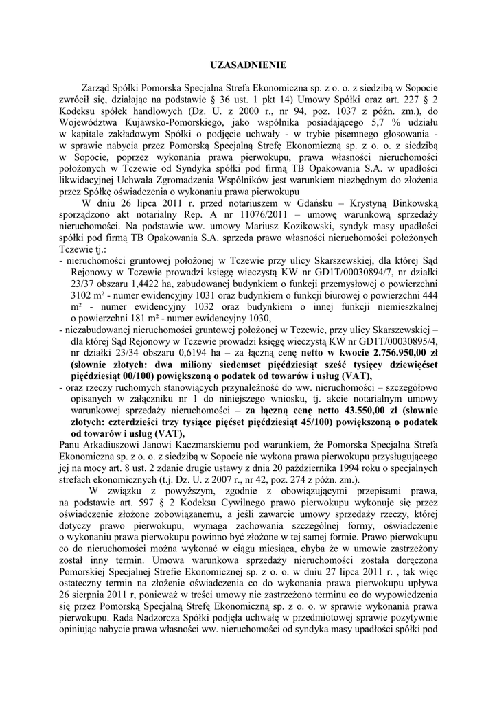 UZASADNIENIE Zarząd Spółki Pomorska Specjalna Strefa Ekonomiczna sp. z o. o. z siedzibą w Sopocie zwrócił się, działając na podstawie § 36 ust. 1 pkt 14) Umowy Spółki oraz art. 227 § 2 Kodeksu spółek handlowych (Dz. U. z 2000 r., nr 94, poz. 1037 z późn. zm.), do Województwa Kujawsko-Pomorskiego, jako wspólnika posiadającego 5,7 % udziału w kapitale zakładowym Spółki o podjęcie uchwały - w trybie pisemnego głosowania w sprawie nabycia przez Pomorską Specjalną Strefę Ekonomiczną sp. z o. o. z siedzibą w Sopocie, poprzez wykonania prawa pierwokupu, prawa własności nieruchomości połoŜonych w Tczewie od Syndyka spółki pod firmą TB Opakowania S.A. w upadłości likwidacyjnej Uchwała Zgromadzenia Wspólników jest warunkiem niezbędnym do złoŜenia przez Spółkę oświadczenia o wykonaniu prawa pierwokupu W dniu 26 lipca 2011 r. przed notariuszem w Gdańsku – Krystyną Binkowską sporządzono akt notarialny Rep. A nr 11076/2011 – umowę warunkową sprzedaŜy nieruchomości. Na podstawie ww. umowy Mariusz Kozikowski, syndyk masy upadłości spółki pod firmą TB Opakowania S.A. sprzeda prawo własności nieruchomości połoŜonych Tczewie tj.: - nieruchomości gruntowej połoŜonej w Tczewie przy ulicy Skarszewskiej, dla której Sąd Rejonowy w Tczewie prowadzi księgę wieczystą KW nr GD1T/00030894/7, nr działki 23/37 obszaru 1,4422 ha, zabudowanej budynkiem o funkcji przemysłowej o powierzchni 3102 m² - numer ewidencyjny 1031 oraz budynkiem o funkcji biurowej o powierzchni 444 m² - numer ewidencyjny 1032 oraz budynkiem o innej funkcji niemieszkalnej o powierzchni 181 m² - numer ewidencyjny 1030, - niezabudowanej nieruchomości gruntowej połoŜonej w Tczewie, przy ulicy Skarszewskiej – dla której Sąd Rejonowy w Tczewie prowadzi księgę wieczystą KW nr GD1T/00030895/4, nr działki 23/34 obszaru 0,6194 ha – za łączną cenę netto w kwocie 2.756.950,00 zł (słownie złotych: dwa miliony siedemset pięćdziesiąt sześć tysięcy dziewięćset pięćdziesiąt 00/100) powiększoną o podatek od towarów i usług (VAT), - oraz rzeczy ruchomych stanowiących przynaleŜność do ww. nieruchomości – szczegółowo opisanych w załączniku nr 1 do niniejszego wniosku, tj. akcie notarialnym umowy warunkowej sprzedaŜy nieruchomości – za łączną cenę netto 43.550,00 zł (słownie złotych: czterdzieści trzy tysiące pięćset pięćdziesiąt 45/100) powiększoną o podatek od towarów i usług (VAT), Panu Arkadiuszowi Janowi Kaczmarskiemu pod warunkiem, Ŝe Pomorska Specjalna Strefa Ekonomiczna sp. z o. o. z siedzibą w Sopocie nie wykona prawa pierwokupu przysługującego jej na mocy art. 8 ust. 2 zdanie drugie ustawy z dnia 20 października 1994 roku o specjalnych strefach ekonomicznych (t.j. Dz. U. z 2007 r., nr 42, poz. 274 z późn. zm.). W związku z powyŜszym, zgodnie z obowiązującymi przepisami prawa, na podstawie art. 597 § 2 Kodeksu Cywilnego prawo pierwokupu wykonuje się przez oświadczenie złoŜone zobowiązanemu, a jeśli zawarcie umowy sprzedaŜy rzeczy, której dotyczy prawo pierwokupu, wymaga zachowania szczególnej formy, oświadczenie o wykonaniu prawa pierwokupu powinno być złoŜone w tej samej formie. Prawo pierwokupu co do nieruchomości moŜna wykonać w ciągu miesiąca, chyba Ŝe w umowie zastrzeŜony został inny termin. Umowa warunkowa sprzedaŜy nieruchomości została doręczona Pomorskiej Specjalnej Strefie Ekonomicznej sp. z o. o. w dniu 27 lipca 2011 r. , tak więc ostateczny termin na złoŜenie oświadczenia co do wykonania prawa pierwokupu upływa 26 sierpnia 2011 r, poniewaŜ w treści umowy nie zastrzeŜono terminu co do wypowiedzenia się przez Pomorską Specjalną Strefę Ekonomiczną sp. z o. o. w sprawie wykonania prawa pierwokupu. Rada Nadzorcza Spółki podjęła uchwałę w przedmiotowej sprawie pozytywnie opiniując nabycie prawa własności ww. nieruchomości od syndyka masy upadłości spółki pod firmą TB Opakowania S.A. w upadłości likwidacyjnej w trybie pisemnego głosowania w dniu 16 sierpnia 2011 r. Uchwała Zgromadzenia Wspólników wyraŜająca zgodę na nabycie ww. nieruchomości jest niezbędna, tak aby Spółka mogła w terminie do 26 sierpnia 2011 r. złoŜyć waŜne oświadczenie co do wykonania prawa pierwokupu. W dniu 5 czerwca 2006 roku Zarząd Pomorskiej Specjalnej Strefy Ekonomicznej sp. z o. o. wydał zezwolenie nr 14/PSSE dla TB Opakowania sp. z o. o. (wówczas formą prawną przedsiębiorcy była spółka z ograniczoną odpowiedzialnością) na prowadzenie działalności gospodarczej w obrębie nieruchomości połoŜonej na terenie Gminy Miasta Tczew, na terenie Pomorskiej Specjalnej Strefy Ekonomicznej. W dniu 18 czerwca 2010 roku Sąd Rejonowy Gdańsk-Północ w Gdańsku ogłosił upadłość przedsiębiorcy pod firmą TB Opakowania S.A. (przedsiębiorca był juŜ po zmianie formy prawnej działalności) obejmującą likwidację majątku. Spółka, na mocy decyzji Ministra Gospodarki z dnia 4 października 2010 r. straciła zezwolenie. Zgodnie z treścią art. 308 ustawy z dnia 28 lutego 2003 roku Prawo upadłościowe i naprawcze (tj. Dz. U. z 2009 r., nr 175, poz. 1361 z późn. zm.) syndyk przeprowadził likwidację majątku upadłego poprzez sprzedaŜ między innymi nieruchomości i rzeczy ruchomych. W trakcie zorganizowanych przez syndyka pierwszego oraz drugiego nieograniczonego przetargu ofertowego na sprzedaŜ nieruchomości wraz z rzeczami ruchomymi jako przynaleŜnościami do tych nieruchomości, wchodzącymi łącznie w skład masy upadłości spółki TB Opakowania S.A. w upadłości likwidacyjnej, Ŝaden podmiot nie złoŜył oferty. Zgodnie z wnioskiem syndyka Sędzia-Komisarz postanowieniem z dnia 6 kwietnia 2011 roku na mocy art. 320 ust. 1 pkt 1 prawa upadłościowego i naprawczego zatwierdził warunki przetargu ustalone przez syndyka w regulaminie nieograniczonego przetargu ofertowego dotyczącego sprzedaŜy ww. nieruchomości oraz ruch