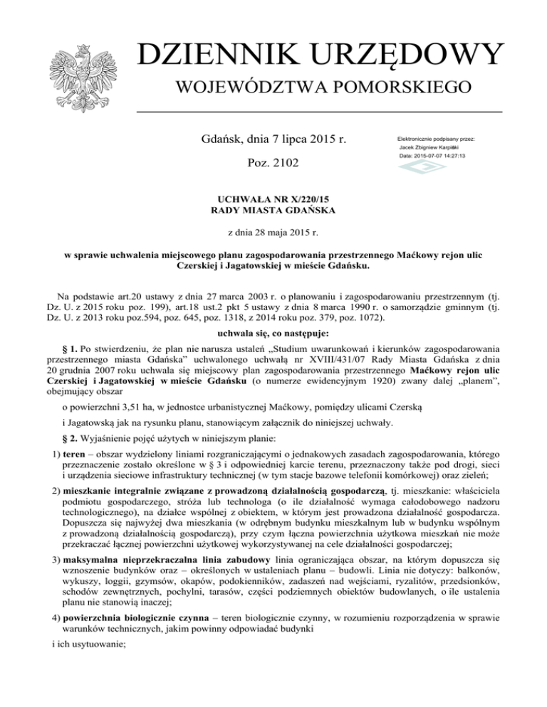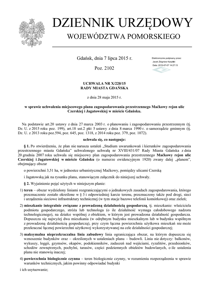 DZIENNIK URZĘDOWY WOJEWÓDZTWA POMORSKIEGO Gdańsk, dnia 7 lipca 2015 r. Elektronicznie podpisany przez: Jacek Zbigniew Karpiński Poz. 2102 Data: 2015-07-07 14:27:13 UCHWAŁA NR X/220/15 RADY MIASTA GDAŃSKA z dnia 28 maja 2015 r. w sprawie uchwalenia miejscowego planu zagospodarowania przestrzennego Maćkowy rejon ulic Czerskiej i Jagatowskiej w mieście Gdańsku. Na podstawie art.20 ustawy z dnia 27 marca 2003 r. o planowaniu i zagospodarowaniu przestrzennym (tj. Dz. U. z 2015 roku poz. 199), art.18 ust.2 pkt 5 ustawy z dnia 8 marca 1990 r. o samorządzie gminnym (tj. Dz. U. z 2013 roku poz.594, poz. 645, poz. 1318, z 2014 roku poz. 379, poz. 1072). uchwala się, co następuje: § 1. Po stwierdzeniu, że plan nie narusza ustaleń „Studium uwarunkowań i kierunków zagospodarowania przestrzennego miasta Gdańska” uchwalonego uchwałą nr XVIII/431/07 Rady Miasta Gdańska z dnia 20 grudnia 2007 roku uchwala się miejscowy plan zagospodarowania przestrzennego Maćkowy rejon ulic Czerskiej i Jagatowskiej w mieście Gdańsku (o numerze ewidencyjnym 1920) zwany dalej „planem”, obejmujący obszar o powierzchni 3,51 ha, w jednostce urbanistycznej Maćkowy, pomiędzy ulicami Czerską i Jagatowską jak na rysunku planu, stanowiącym załącznik do niniejszej uchwały. § 2. Wyjaśnienie pojęć użytych w niniejszym planie: 1) teren – obszar wydzielony liniami rozgraniczającymi o jednakowych zasadach zagospodarowania, którego przeznaczenie zostało określone w § 3 i odpowiedniej karcie terenu, przeznaczony także pod drogi, sieci i urządzenia sieciowe infrastruktury technicznej (w tym stacje bazowe telefonii komórkowej) oraz zieleń; 2) mieszkanie integralnie związane z prowadzoną działalnością gospodarczą, tj. mieszkanie: właściciela podmiotu gospodarczego, stróża lub technologa (o ile działalność wymaga całodobowego nadzoru technologicznego), na działce wspólnej z obiektem, w którym jest prowadzona działalność gospodarcza. Dopuszcza się najwyżej dwa mieszkania (w odrębnym budynku mieszkalnym lub w budynku wspólnym z prowadzoną działalnością gospodarczą), przy czym łączna powierzchnia użytkowa mieszkań nie może przekraczać łącznej powierzchni użytkowej wykorzystywanej na cele działalności gospodarczej; 3) maksymalna nieprzekraczalna linia zabudowy linia ograniczająca obszar, na którym dopuszcza się wznoszenie budynków oraz – określonych w ustaleniach planu – budowli. Linia nie dotyczy: balkonów, wykuszy, loggii, gzymsów, okapów, podokienników, zadaszeń nad wejściami, ryzalitów, przedsionków, schodów zewnętrznych, pochylni, tarasów, części podziemnych obiektów budowlanych, o ile ustalenia planu nie stanowią inaczej; 4) powierzchnia biologicznie czynna – teren biologicznie czynny, w rozumieniu rozporządzenia w sprawie warunków technicznych, jakim powinny odpowiadać budynki i ich usytuowanie; Dziennik Urzędowy Województwa Pomorskiego –2– Poz. 2102 _______________________________________________________________________________________________________________ 5) wysokość zabudowy – poziom najwyższej kalenicy dachu lub najwyższego punktu na pokryciu bryły budynku (bądź jego części) lub attyki określony w metrach nad poziomem morza. Do wysokości zabudowy nie wlicza się urządzeń, instalacji i elementów technicznych (takich jak: anteny, maszty odgromnikowe, kominy, klimatyzatory), nadbudówek nad dachami (np. maszynownie dźwigów, centrale wentylacyjne, klimatyzacyjne, kotłownie) oraz innych elementów umieszczonych na pokryciu budynku, które postrzegane z poziomu podłogi parteru, z odległości od budynku nie mniejszych niż dwie i nie większych niż trzy jego wysokości, nie podwyższają optycznie budynku swoją masą; 6) rekreacyjna zieleń przydomowa – przestrzeń z zielenią, służąca rekreacji i wypoczynkowi mieszkańców na terenach mieszkaniowych netto, o cechach: a) lokalizacja na powietrzu (w przestrzeni otwartej), b) powierzchnia co najmniej 100 m2, c) zwarta forma - szerokość minimum 5 m, d) zagospodarowanie zielenią minimum 50% powierzchni każdej przestrzeni, e) wyposażenie w urządzenia rekreacyjno-wypoczynkowe i sportowe dla różnych grup wiekowych, f) dostępność dla wszystkich mieszkańców obsługiwanego terenu (przestrzeń półpubliczna); 7) miejsce postojowe dla rowerów – miejsce zlokalizowane w częściach wspólnych nieruchomości, dostępne bezpośrednio z poziomu terenu lub za pomocą pochylni, umożliwiające pozostawienie roweru, w którym możliwe jest przymocowanie przynajmniej ramy roweru i jednego z kół do elementu trwale związanego z podłożem lub budynkiem. Miejsca postojowe dla rowerów powinny być usytuowane możliwie jak najbliżej wejścia do budynku. W zabudowie mieszkaniowej minimum 60% miejsc postojowych lokalizuje się w miejscu zadaszonym (mogą być w budynku mieszkalnym). Minimum 20% miejsc lokalizuje się na zewnątrz budynku, nie dalej niż 25 m od wejścia. Zaleca się: a) wyposażenie miejsc przeznaczonych na długi postój (powyżej 3 godzin) w osłonę przed deszczem lub sytuowanie ich wewnątrz budynku, b) sytuowanie miejsc postojowych zewnętrznych w miejscu dobrze widocznym, łatwo dostępnym, nie utrudniającym ruchu pieszego, najlepiej strzeżonym, monitorowanym lub zamykanym; 8) miejsce postojowe dla pojazdów zaopatrzonych w kartę parkingową - miejsce postojowe spełniające wszystkie wymogi przepisów odrębnych dotyczących miejsca postojowego dla osób niepełnosprawnych, zlokalizowane w częściach wspólnych nieruchomości na poziomie terenu lub w budynku na kondygnacjach dostępnych dla osób niepełnosprawnych. Miejsca na poziomie terenu należy lokalizować w sposób umożliwiający osobom niepełnosprawnym najdogodniejszy dostęp do budynku: na styku z utwardzonym dojściem (o odpowiednim pochyleniu) lub dojazdem do wejścia zapewniającego osobom niepełnosprawnym dostęp do budynku, w miejscu zapewnia