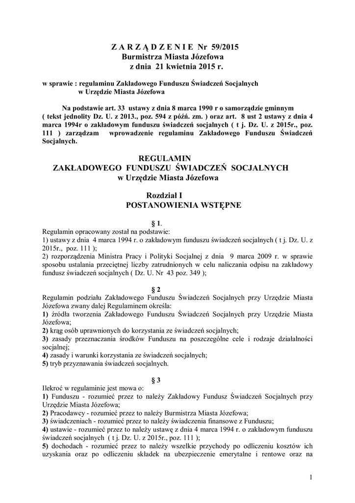 Z A R Z Ą D Z E N I E Nr 59/2015 Burmistrza Miasta Józefowa z dnia 21 kwietnia 2015 r. w sprawie : regulaminu Zakładowego Funduszu Świadczeń Socjalnych w Urzędzie Miasta Józefowa Na podstawie art. 33 ustawy z dnia 8 marca 1990 r o samorządzie gminnym ( tekst jednolity Dz. U. z 2013., poz. 594 z późń. zm. ) oraz art. 8 ust 2 ustawy z dnia 4 marca 1994r o zakładowym funduszu świadczeń socjalnych ( t j. Dz. U. z 2015r., poz. 111 ) zarządzam wprowadzenie regulaminu Zakładowego Funduszu Świadczeń Socjalnych. REGULAMIN ZAKŁADOWEGO FUNDUSZU ŚWIADCZEŃ SOCJALNYCH w Urzędzie Miasta Józefowa Rozdział I POSTANOWIENIA WSTĘPNE § 1. Regulamin opracowany został na podstawie: 1) ustawy z dnia 4 marca 1994 r. o zakładowym funduszu świadczeń socjalnych ( t j. Dz. U. z 2015r., poz. 111 ); 2) rozporządzenia Ministra Pracy i Polityki Socjalnej z dnia 9 marca 2009 r. w sprawie sposobu ustalania przeciętnej liczby zatrudnionych w celu naliczania odpisu na zakładowy fundusz świadczeń socjalnych ( Dz. U. Nr 43 poz. 349 ); §2 Regulamin podziału Zakładowego Funduszu Świadczeń Socjalnych przy Urzędzie Miasta Józefowa zwany dalej Regulaminem określa: 1) źródła tworzenia Zakładowego Funduszu Świadczeń Socjalnych przy Urzędzie Miasta Józefowa; 2) krąg osób uprawnionych do korzystania ze świadczeń socjalnych; 3) zasady przeznaczania środków Funduszu na poszczególne cele i rodzaje działalności socjalnej; 4) zasady i warunki korzystania ze świadczeń socjalnych; 5) tryb przyznawania świadczeń socjalnych. §3 Ilekroć w regulaminie jest mowa o: 1) Funduszu - rozumieć przez to należy Zakładowy Fundusz Świadczeń Socjalnych przy Urzędzie Miasta Józefowa; 2) Pracodawcy - rozumieć przez to należy Burmistrza Miasta Józefowa; 3) świadczeniach - rozumieć przez to należy świadczenia finansowe z Funduszu; 4) ustawie - rozumieć przez to należy ustawę z dnia 4 marca 1994 r. o zakładowym funduszu świadczeń socjalnych ( t j. Dz. U. z 2015r., poz. 111 ); 5) dochodach - rozumieć przez to należy wszelkie przychody po odliczeniu kosztów ich uzyskania oraz po odliczeniu składek na ubezpieczenie emerytalne i rentowe oraz na 1 ubezpieczenie chorobowe, określonych w przepisach o systemie ubezpieczeń społecznych, chyba że zostały już zaliczone do kosztów uzyskania przychodu. Rozdział II ŹRÓDŁA TWORZENIA FUNDUSZU §4 1. Fundusz tworzy się z corocznego odpisu podstawowego, naliczonego w stosunku do przeciętnej liczby zatrudnionych pracowników. 2. Środki Funduszu zwiększa się o: 1) odsetki od środków funduszu; 2) wpływy z oprocentowania pożyczek udzielonych na cele mieszkaniowe; 3) darowizny oraz zapisy osób fizycznych i prawnych. 3. Wysokość odpisu podstawowego, o którym mowa w ust. 1, wynosi 37,5% przeciętnego wynagrodzenia miesięcznego w gospodarce narodowej w roku poprzednim lub w drugim półroczu roku poprzedniego, jeżeli przeciętne wynagrodzenie z tego okresu stanowiło kwotę wyższą. 4. Wysokość odpisu podstawowego zwiększa się o 6,25% przeciętnego wynagrodzenia miesięcznego, o którym mowa w ust. 3, na każdą zatrudnioną osobę w stosunku do której orzeczono znaczny lub umiarkowany stopień niepełnosprawności. 5. Środki Funduszu zwiększa się o 6,25% przeciętnego miesięcznego wynagrodzenia, o którym mowa w ust. 3, na każdego emeryta i rencistę uprawnionego do opieki socjalnej ze strony Pracodawcy. 6. Przeciętne wynagrodzenie miesięczne, o którym mowa w ust. 3 ogłasza Prezes Głównego Urzędu Statystycznego w "Monitorze Polskim". 7. Środki Funduszu gromadzone są na odrębnym rachunku bankowym. 8. Środki nie wykorzystane w danym roku kalendarzowym przechodzą na rok następny. §5 1. Odpisy i zwiększenia, o których mowa w § 4 ust. 2-5, obciążają koszty działalności Pracodawcy i tworzą jeden Fundusz. 2. Pracodawca do dnia 30 września danego roku kalendarzowego przekazuje na odrębny rachunek bankowy Funduszu równowartość dokonanych odpisów i zwiększeń naliczonych zgodnie z § 4 ust. 2-5, z tym że do dnia 31 maja tegoż roku przekazuje kwotę stanowiącą co najmniej 75% odpisów. Rozdział III OSOBY UPRAWNIONE DO KORZYSTANIA ZE ŚWIADCZEN SOCJALNYCH §6 1. Ze świadczeń socjalnych mogą korzystać: 1) pracownicy zatrudnieni u Pracodawcy na podstawie umowy o pracę; 2) pracownicy zatrudnieni u Pracodawcy na podstawie powołania, wyboru lub mianowania; 3) pracownicy przebywający na urlopach macierzyńskich, wychowawczych; 4) emeryci i renciści (w okresie pobieranej renty z tytułu niezdolności do pracy) byli pracownicy zakładu z którymi zakład pracy rozwiązał stosunek pracy w związku z przejściem na emeryturę lub rentę; 2 5) członkowie rodzin osób, o których mowa w pkt 1) -4). 2. Za członków rodzin, o których mowa w ust. 1 pkt 4 ) uważa się: 1) dzieci własne, dzieci przysposobione oraz przyjęte na wychowanie w ramach rodziny zastępczej, pozostające na utrzymaniu osoby uprawnionej, o ile nie ukończyły 18 lat, a jeżeli pobierają naukę w formach szkolnych -do ukończenia nauki, nie dłużej jednak niż 26 lat. 2) dzieci będące na utrzymaniu osoby uprawnionej, posiadające orzeczenie o niepełnosprawności bez względu na wiek; 3) współmałżonków, prowadzących wspólne gospodarstwo domowe. Rozdział IV PRZEZNACZANIE ŚRODKÓW FUNDUSZU NA POSZCZEGÓLNE CELE I RODZAJE DZIAŁALNOŚCI SOCJALNEJ §7 1. Środki Funduszu przeznacza się na finansowanie (dofinansowanie) na rzecz osób uprawnionych: 1) dofinansowania raz w roku kalendarzowym wypoczynku urlopowego pracowników, emerytów i rencistów, organizowanego we własnym zakresie; 2) pomocy rzeczowej i finansowej (zapomogi pieniężne bezzwrotne) przyznawanej w szczególnych przypadkach losowych; 3) pożyczek zwrotnych na cele mieszkaniowe; 4) okazjonalnej pomocy rzeczowej i finansowej (np. bony towarowe, środki pieniężne , paczki świąteczne ). 2. Pożyczki mieszkaniowe, o których mowa w ust. 1 pkt 3,