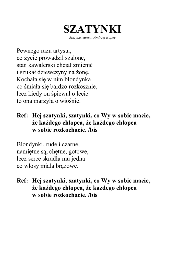 SZATYNKI Muzyka, słowa: Andrzej Kopeć Pewnego razu artysta, co życie prowadził szalone, stan kawalerski chciał zmienić i szukał dziewczyny na żonę. Kochała się w nim blondynka co śmiała się bardzo rozkosznie, lecz kiedy on śpiewał o lecie to ona marzyła o wiośnie. Ref: Hej szatynki, szatynki, co Wy w sobie macie, że każdego chłopca, że każdego chłopca w sobie rozkochacie. /bis Blondynki, rude i czarne, namiętne są, chętne, gotowe, lecz serce skradła mu jedna co włosy miała brązowe. Ref: Hej szatynki, szatynki, co Wy w sobie macie, że każdego chłopca, że każdego chłopca w sobie rozkochacie. /bis