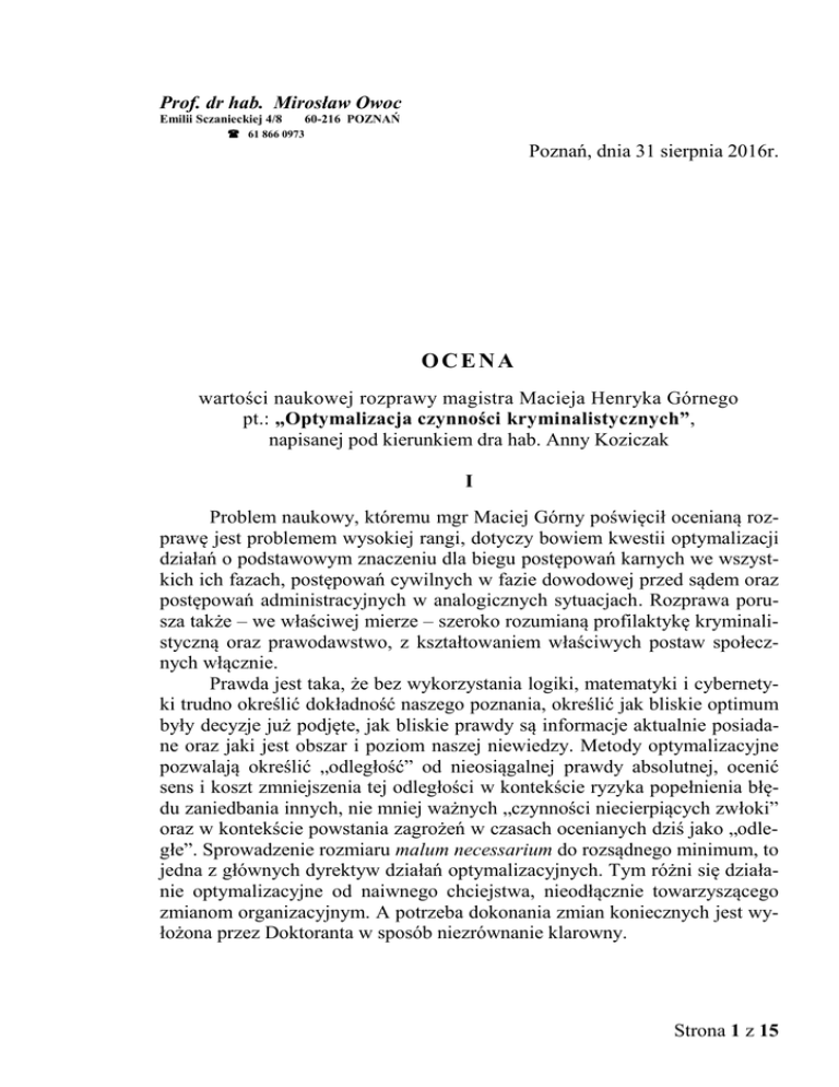 Prof. dr hab. Mirosław Owoc Emilii Sczanieckiej 4/8 60-216 POZNAŃ 61 866 0973 Poznań, dnia 31 sierpnia 2016r. OCENA wartości naukowej rozprawy magistra Macieja Henryka Górnego pt.: „Optymalizacja czynności kryminalistycznych”, napisanej pod kierunkiem dra hab. Anny Koziczak I Problem naukowy, któremu mgr Maciej Górny poświęcił ocenianą rozprawę jest problemem wysokiej rangi, dotyczy bowiem kwestii optymalizacji działań o podstawowym znaczeniu dla biegu postępowań karnych we wszystkich ich fazach, postępowań cywilnych w fazie dowodowej przed sądem oraz postępowań administracyjnych w analogicznych sytuacjach. Rozprawa porusza także – we właściwej mierze – szeroko rozumianą profilaktykę kryminalistyczną oraz prawodawstwo, z kształtowaniem właściwych postaw społecznych włącznie. Prawda jest taka, że bez wykorzystania logiki, matematyki i cybernetyki trudno określić dokładność naszego poznania, określić jak bliskie optimum były decyzje już podjęte, jak bliskie prawdy są informacje aktualnie posiadane oraz jaki jest obszar i poziom naszej niewiedzy. Metody optymalizacyjne pozwalają określić „odległość” od nieosiągalnej prawdy absolutnej, ocenić sens i koszt zmniejszenia tej odległości w kontekście ryzyka popełnienia błędu zaniedbania innych, nie mniej ważnych „czynności niecierpiących zwłoki” oraz w kontekście powstania zagrożeń w czasach ocenianych dziś jako „odległe”. Sprowadzenie rozmiaru malum necessarium do rozsądnego minimum, to jedna z głównych dyrektyw działań optymalizacyjnych. Tym różni się działanie optymalizacyjne od naiwnego chciejstwa, nieodłącznie towarzyszącego zmianom organizacyjnym. A potrzeba dokonania zmian koniecznych jest wyłożona przez Doktoranta w sposób niezrównanie klarowny. Strona 1 z 15 Ocena rozprawy doktorskiej Macieja Henryka Górnego pt. „Optymalizacja czynności kryminalistycznych” II Recenzowana rozprawa przedłożona została Radzie Wydziału Prawa, Administracji i Ekonomii Uniwersytetu Wrocławskiego w formie standardowego „maszynopisu”. Statystyka. Praca zawiera 309 stron wydruku komputerowego. W ramach zasadniczego tekstu mieści się: 13 rycin oraz 2 tabele. Bibliografia obejmuje 141 pozycji, w tym: 118 monografii, artykułów i raportów; w tym: 107 w j. polskim, 11 w j. angielskim, 9 orzeczeń i aktów prawnych; 14 odesłań do stron internetowych. We „Wprowadzeniu” [str. 6-11], jak przystało, Autor formułuje cel opracowania. W pierwszym przybliżeniu celem tym jest wskazanie potrzeby a zarazem możliwości racjonalnego, nowoczesnego rozwiązania problemu metod wykrywania i zwalczania naruszeń prawa w sposób kompleksowy i systemowy (s.10 in fine). Zdaniem Autora, takie podejście oferuje optymalizacja, rozumiana jako zorganizowany proces znajdowania rozwiązania najlepszego z możliwych w danych warunkach. „Optymalizacja stanowić może niejako ‘metametodę’ – być środkiem służącym do tworzenia innych metod, oraz do modyfikowania, weryfikowania i systematyzowania metod istniejących.” Autor zapowiada „zaprezentowanie sposobów zwiększenia skuteczności czynności kryminalistycznych, ograniczenia kosztów, oszczędzenia czasu, przewidywania zagrożeń oraz uzyskiwania, filtrowania, weryfikowania, systematyzowania i gromadzenia informacji.” Wszystkie wymienione zamiary, plany i konkretne propozycje zamierza Doktorant ulokować w ramach systemu odpowiadającego wyzwaniom współczesności i przyszłości, zgodnego z poczuciem prawnym społeczeństwa. Strona 2 z 15 Ocena rozprawy doktorskiej Macieja Henryka Górnego pt. „Optymalizacja czynności kryminalistycznych” Rozdział 1 [str. 12-21; „Zagadnienia wstępne”] określa i porządkuje terminy (pojęcia] podstawowe, niezbędne do określenia zakresu znaczeniowego tytułowych czynności kryminalistycznych [1.1. – s.13-16]. Autor deklaruje, iż Dysertacja jest osadzona w realiach dzisiejszego systemu prawnego, jednakże abstrahować będzie od istniejących szczegółowych rozwiązań prawnych, jako że są one zmienne i ułomne. Tę ułomność Doktorant wykazuje w dalszej części pracy, omawiając w licznych przykładach potrzebę i możliwości zastosowania procedur optymalizacyjnych, mimo formalnych utrudnień (nie czekając na ułudną „lepszą przyszłość”). Dołączony wykaz konwencji terminologicznych (dotyczących szeroko rozumianego śledztwa, przestępstwa, przestępcy, zorganizowanej grupy przestępczej) nie tylko upraszcza stylistykę dalszych wywodów, ale także czyni pracę kompatybilną z literaturą kryminalistyczną minionych stu lat jej intensywnego rozwoju. Doktorant nie mógł się powstrzymać także od kilku propozycji porządkujących bałaganiarską terminologię języka prawnego i prawniczego, drastycznie sprzeczną z logiką (mylenie kłamliwości zeznań z ich fałszywością; mylenie przyznania się do czynu z przyznaniem się do zawinienia]. Przyjmując jedną z krótszych konwencji terminologicznych Horoszowskiego nt. kryminalistyki jako „wiedzy o zasadach wykorzystywania osobowych i rzeczowych środków dowodowych dla celów wymiaru sprawiedliwości (…) i władz śledczych”, Doktorant przyjmuje także od niego podział czynności kryminalistycznych na taktyczne i techniczne. Sygnalizując znaną Mu nierozłączność tej klasyfikacji, Doktorant nie rozdziera nad nią szat, lecz proponuje, by na użytek omawianej Dysertacji przyjąć następujące definicje robocze. „Taktyczne czynności kryminalistyczne to celowe działania podejmowane dla wykrycia czynów zabronionych, ujawnienia i wykrycia sprawców oraz zgromadzenia materiału dowodowego pozwalającego na ich skuteczne skazanie.” [s.14]. „Techniczne czynności kryminalistyczne to czynności podejmowane z wykorzystaniem technicznych środków fizyko-chemicznych w celu ujawnienia, zgromadzenia i zabezpieczenia dowodów służących wykryciu czynów zabroniony