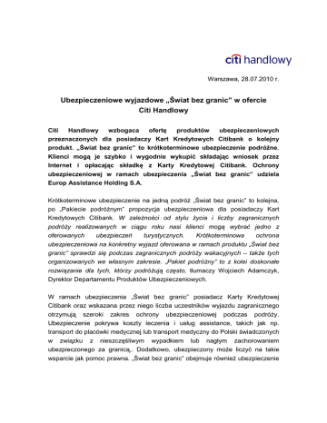 Warszawa, 28.07.2010 r. Ubezpieczeniowe wyjazdowe „Świat bez granic” w ofercie Citi Handlowy Citi Handlowy wzbogaca ofertę produktów ubezpieczeniowych przeznaczonych dla posiadaczy Kart Kredytowych Citibank o kolejny produkt. „Świat bez granic” to krótkoterminowe ubezpieczenie podróŜne. Klienci mogą je szybko i wygodnie wykupić składając wniosek przez Internet i opłacając składkę z Karty Kredytowej Citibank. Ochrony ubezpieczeniowej w ramach ubezpieczenia „Świat bez granic” udziela Europ Assistance Holding S.A. Krótkoterminowe ubezpieczenie na jedną podróŜ „Świat bez granic” to kolejna, po „Pakiecie podróŜnym” propozycja ubezpieczeniowa dla posiadaczy Kart Kredytowych Citibank. W zaleŜności od stylu Ŝycia i liczby zagranicznych podróŜy realizowanych w ciągu roku nasi klienci mogą wybrać jedno z oferowanych ubezpieczeń turystycznych. Krótkoterminowa ochrona ubezpieczeniowa na konkretny wyjazd oferowana w ramach produktu „Świat bez granic” sprawdzi się podczas zagranicznych podróŜy wakacyjnych – takŜe tych organizowanych we własnym zakresie. „Pakiet podróŜny” to z kolei doskonałe rozwiązanie dla tych, którzy podróŜują często, tłumaczy Wojciech Adamczyk, Dyrektor Departamentu Produktów Ubezpieczeniowych. W ramach ubezpieczenia „Świat bez granic” posiadacz Karty Kredytowej Citibank oraz wskazana przez niego liczba uczestników wyjazdu zagranicznego otrzymują szeroki zakres ochrony ubezpieczeniowej podczas podróŜy. Ubezpieczenie pokrywa koszty leczenia i usług assistance, takich jak np. transport do placówki medycznej lub transport medyczny do Polski świadczonych w związku z nieszczęśliwym wypadkiem lub nagłym zachorowaniem ubezpieczonego za granicą,. Dodatkowo, ubezpieczony moŜe liczyć na takie wsparcie jak pomoc prawna. „Świat bez granic” obejmuje równieŜ ubezpieczenie odpowiedzialności cywilnej za szkody osobowe lub w mieniu wyrządzone osobom trzecim za granicą, a takŜe ubezpieczenie na wypadek opóźnienia lotu oraz utraty czy uszkodzenia bagaŜu. Do dyspozycji ubezpieczonych pozostaje takŜe specjalna infolinia medyczna. Dodatkowo, wykupując rozszerzony zakres ochrony w ramach produktu „Świat bez granic” klienci otrzymają ochronę w zakresie amatorskiego uprawiania sportów, takich jak choćby narciarstwo czy amatorskie nurkowanie. Produkt „Świat bez granic” dostępny jest w czterech wariantach zróŜnicowanych ze względu na wysokość sumy ubezpieczenia. Wysokość głównych sum ubezpieczenia w zaleŜności od wybranego wariantu kształtuje się w przedziale od 15 000 euro do 100 000 euro. Posiadacze Kart Kredytowych Citibank samodzielnie wybierają odpowiedni dla siebie wariant ubezpieczenia. Klienci mogą szybko i łatwo wykupić ubezpieczenie podróŜne „Świat bez granic" wypełniając krótki wniosek elektroniczny. Wniosek dostępny jest ze strony www.citihandlowy.pl. Wystarczy wypełnić kilka szczegółów dotyczących planowanej podróŜy (m.in. miejsce, termin, liczba osób podróŜujących oraz dane tych osób), potem wybrać odpowiedni wariant ubezpieczenia a następnie opłacić składkę ubezpieczenia z Karty Kredytowej Citibank. Polisa ubezpieczeniowa zostanie przesłana klientowi na wskazany przez niego adres e-mail,, dodatkowo numer polisy klient moŜe otrzymać takŜe sms’em. Ochrona ubezpieczeniowa moŜe rozpocząć się juŜ w dniu złoŜenia wniosku i opłaceniu składki. Ochrony ubezpieczeniowej w ramach produktu „Świat bez granic” udziela Europ Assistance Holding S.A. Szczegółowe informacje na temat ubezpieczenia „Świat bez granic”, w tym Ogólne Warunki Ubezpieczenia są dostępne na www.citihandlowy.pl. ### Dodatkowych informacji udziela: Paweł Zegarłowicz, Dyrektor Biura Prasowego, tel. (0-22) 657 72 97 E-mail: [email protected] Dorota Szostek-Rustecka, Kierownik ds. Kontaktów z Mediami, tel. (0-22) 690 10 49 E-mail: [email protected] Bank Handlowy w Warszawie SA to jedna z największych instytucji finansowych w Polsce, oferująca pod marką Citi Handlowy bogaty i nowoczesny asortyment produktów i usług bankowości korporacyjnej, inwestycyjnej i detalicznej. Bank Handlowy obsługuje 20 tys. klientów korporacyjnych i 1 mln klientów indywidualnych poprzez nowoczesne kanały dystrybucji oraz sieć ponad 200 oddziałów. W skład grupy kapitałowej Banku wchodzą takie podmioty jak: Dom Maklerski Banku Handlowego i Handlowy Leasing. PrzynaleŜność do Citigroup, największej na świecie instytucji finansowej, zapewnia klientom Banku Handlowego dostęp do usług finansowych w ponad 100 krajach. Dodatkowe informacje moŜna uzyskać na stronie internetowej www.citihandlowy.pl. Citi (NYSE:C) to wiodąca globalna instytucja finansowa, mająca około 200 milionów klientów w ponad 140 krajach. Poprzez swoje dwie odrębne jednostki operacyjne: Citicorp i Citi Holdings, Citi obsługuje klientów indywidualnych, korporacyjnych, rządowych i instytucjonalnych zapewniając im bogaty wachlarz produktów i usług finansowych w zakresie bankowości detalicznej, bankowości korporacyjnej i inwestycyjnej, usług maklerskich i zarządzania aktywami. Dodatkowe informacje moŜna uzyskać na stronie internetowej www.citigroup.com lubwww.citi.com.