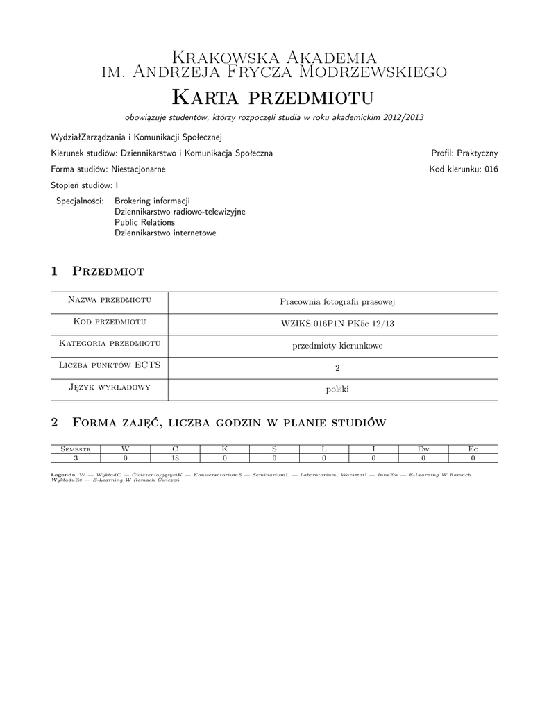 Krakowska Akademia im. Andrzeja Frycza Modrzewskiego Karta przedmiotu obowiązuje studentów, którzy rozpoczęli studia w roku akademickim 2012/2013 WydziałZarządzania i Komunikacji Społecznej Kierunek studiów: Dziennikarstwo i Komunikacja Społeczna Profil: Praktyczny Forma studiów: Niestacjonarne Kod kierunku: 016 Stopień studiów: I Specjalności: 1 2 Brokering informacji Dziennikarstwo radiowo-telewizyjne Public Relations Dziennikarstwo internetowe Przedmiot Nazwa przedmiotu Pracownia fotografii prasowej Kod przedmiotu WZIKS 016P1N PK5c 12/13 Kategoria przedmiotu przedmioty kierunkowe Liczba punktów ECTS 2 Język wykładowy polski Forma zajęć, liczba godzin w planie studiów Semestr 3 W 0 C 18 K 0 S 0 L 0 I 0 Ew 0 Ec 0 Legenda: W — WykładC — Ćwiczenia/językiK — KonwersatoriumS — SeminariumL — Laboratorium, Warsztat I — InneEw — E-Learning W Ramach WykładuEc — E-Learning W Ramach Ćwiczeń Krakowska Akademia im. Andrzeja Frycza Modrzewskiego 3 Cele przedmiotu Cel 1 Celem przedmiotu jest zapoznanie studentów ze specyfiką fotografii prasowej, w kontekście jej tradycyjnej formy, jak i cyfrowej Cel 2 W ramach zajęć studenci poznają zarówno stronę techniczną tworzenia fotografii prasowej, jak i procesy jej przetwarzania, wykorzystywania i obróbki jakościowej 4 Wymagania wstępne 1 brak 5 Modułowe efekty kształcenia MW1 Studenci będą mieli wiedzę nt. narzędzi (sprzęt i oprogramowanie) wykorzystywanych przy pracy nad fotografią prasową MW2 Studenci będą znali podstawowe formaty zapisu i przetwarzania zdjęć oraz techniki wykorzystywane przy pracach nad fotografią cyfrową MU3 Studenci będą potrafili posługiwać się nowoczesnymi narzędziami właściwymi dla fotografa prasowego MK4 Studenci będą mieli świadomość konieczności ciągłego rozwijania się w dziedzinie fotografii dziennikarskiej MU5 Studenci będą potrafili zrobić fotografię w zależności od lokacji, przygotować prezentację multimedialną, a także przygotować samą fotografię do druku cyfrowego, 6 Treści programowe Lp C1 C2 C3 C4 C5 C6 C7 C8 C9 C10 C11 C12 C13 C14 C15 7 Ćwiczenia/języki Tematyka zajęć Opis szczegółowy bloków tematycznych Natura i rola światła w fotografii. Zasady kompozycji, oświetlenia i kadrowania zdjęć. Sprzęt wykorzystywany w fotografii analogowej i cyfrowej. Pomiar światła i ustalanie parametrów ekspozycji zdjęć oraz balansu bieli. Fotoreportaż w plenerze. Portretowanie ludzi we wnętrzach i w studio fleszowym. Formaty zapisu grafiki rastrowej, rozdzielczość i kompresja. Praca w formacie RAW. Skanowanie i inne techniki akwizycji obrazów cyfrowych. Fotomontaż i techniki przetwarzania zdjęć. Filtry optyczne i cyfrowe. Oprogramowanie do edycji zdjęć cyfrowych (GIMP, PHOTOSHOP, PHOTO PAINT). Edycja i konwersja obrazów cyfrowych. Modele kolorów ze szczególnym uwzględnieniem: RGB, LAB i CMYK Przygotowanie fotografii do druku cyfrowego i offsetowego oraz do publikowania w Internecie. Razem Metody dydaktyczne M16. Wykłady M11. Projekty Strona 2/4 Liczba godzin 1 1 1 1 2 1 1 1 2 2 1 1 1 1 1 18 Krakowska Akademia im. Andrzeja Frycza Modrzewskiego M5. Dyskusja M10. Prezentacje multimedialne MI1. Analiza 8 Obciążenie pracą studenta Średnia liczba godzin na zrealizowanie aktywności Forma aktywności Godziny kontaktowe z nauczycielem akademickim, w tym: Godziny wynikające z planu studiów 18 Konsultacje przedmiotowe 0 Egzaminy i zaliczenia w sesji 0 Godziny bez udziału nauczyciela akademickiego wynikające z nakładu pracy studenta, w tym: Przygotowanie się do zajęć, w tym studiowanie zalecanej literatury 7 Opracowanie wyników 10 Przygotowanie raportu, projektu, prezentacji, dyskusji 15 Sumaryczna liczba godzin dla przedmiotu wynikająca z 50 całego nakładu pracy studenta 2 Sumaryczna liczba punktów ECTS dla przedmiotu 9 Metody oceny Ocena podsumowująca P7. I1. I2. I3. Test jednokrotnego wyboru Przedstawienie prezentacji multimedialnej Prezentacja fotoreportażu Prezentacja zdjęć tematycznych Warunki zaliczenia przedmiotu 1 Projekt indywidualny 2 Test wielokrotnego wyboru 3 Pytania otwarte Kryteria oceny Na ocenę 3 Na ocenę 3.5 Na ocenę 4 Na ocenę 4.5 Na ocenę 5 10 Oddanie wszystkich projektów, w tym prezentacji multimedialnej oraz zaliczenie testu wielokrotnego wyboru na min. 50%. Obecność na min. 50% zajęć. Oddanie wszystkich projektów, w tym prezentacji multimedialnej oraz zaliczenie testu wielokrotnego wyboru na min. 60%. Obecność na min. 60% zajęć. Oddanie wszystkich projektów, w tym prezentacji multimedialnej oraz zaliczenie testu wielokrotnego wyboru na min. 70%. Obecność na min. 70% zajęć. Oddanie wszystkich projektów, w tym prezentacji multimedialnej oraz zaliczenie testu wielokrotnego wyboru na min. 80%. Obecność na min. 80% zajęć. Oddanie wszystkich projektów, w tym prezentacji multimedialnej oraz zaliczenie testu wielokrotnego wyboru na min. 90%. Obecność na min. 90% zajęć. Macierz realizacji przedmiotu Strona 3/4 Krakowska Akademia im. Andrzeja Frycza Modrzewskiego Modułowe efekty kształcenia dla przedmiotu Odniesienie do efektów kierunkowych MW1 K_W11, K_W10 MW2 K_W11, K_W10 MU1 K_U05, K_U03 MK1 K_K01, K_K07 MU2 K_U05, K_U03 11 Treści programowe C1, C2, C3, C4, C5, C6, C7, C8, C9, C10, C11, C12, C13, C14, C15 C1, C2, C3, C4, C5, C6, C7, C8, C9, C10, C11, C12, C13, C14, C15 C1, C2, C3, C4, C5, C6, C7, C8, C9, C10, C11, C12, C13, C14, C15 C1, C2, C3, C4, C5, C6, C7, C8, C9, C10, C11, C12, C13, C14, C15 C1, C2, C3, C4, C5, C6, C7, C8, C9, C10, C11, C12, C13, C14, C15 Metody dydaktyczne Sposoby oceny M16, M11, M5, M10 P7 M16, M11, M5, M10 P7 M16, M11, M5, M10 I3 M16, M11, M5, M10 P7 M16, M11, M10 I1, I2, I3 Wykaz literatury Literatura podstawowa: [1] S. Kelby — Fotografia cyfrowa, Gliwice, 2008, Helion [2] K. Kobre — Fotografia prasowa, Gliwice, 2011, Helion [3] Dan Margulis — Vademecum profesjonalisty. Photoshop- korekcja i separacja, Gliwice, 2007, He