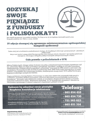 oDHrySKJttr swoII-m PIHNII tlUE zFu[$nus%w i PotffisotoKs. ! Nie wstydi sig przyznai, ze zrcstale( oszukany. Oni czq na lo,2d nie bgdziesz dochodzil swoich praw. W grupie jeste5my silni. Walcz o swoje, dzialail fiI edyeja cieszqeei slg n3,ern ogolnropoflslsfiei Celem akcjijestumozliwienie poszkodowanym dostgp_u do bezplatnych informacjiiporad prawnych udzielanych telefonicznie. Akcja musi zwroci( uwagg wladzRzeczypospolitej,.kt6re stranq po stronie obywat[r:li iwprowadzq systemowe rozwiqzania iiiminulqce nielegaine praktyki towarzystw ubezpieczeniowych w Polsce' 6ale Organizatorry ak*iE; Stowarzyszenie Os6b Poszkodowanych przez nstytucje Fi na nsowe,, Przywiqza ni do Pol isy". I pr n c polf,solokatnsh E UIFTX Wi formacji znajdziecie aEs,nsnElGFsn.u oraz na prrofiIu ,,Przywiqzanych" na Facebooktl ie: