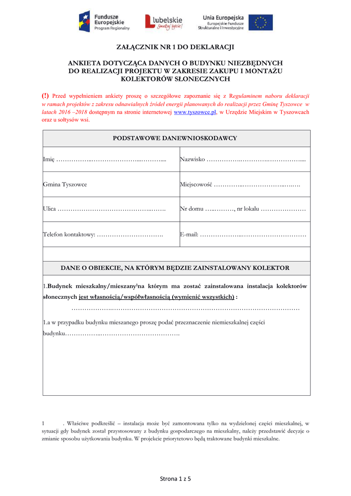 ZAŁĄCZNIK NR 1 DO DEKLARACJI ANKIETA DOTYCZĄCA DANYCH O BUDYNKU NIEZBĘDNYCH DO REALIZACJI PROJEKTU W ZAKRESIE ZAKUPU I MONTAśU KOLEKTORÓW SŁONECZNYCH (!) Przed wypełnieniem ankiety proszę o szczegółowe zapoznanie się z Regulaminem naboru deklaracji w ramach projektów z zakresu odnawialnych źródeł energii planowanych do realizacji przez Gminę Tyszowce w latach 2016 –2018 dostępnym na stronie internetowej www.tyszowce.pl, w Urzędzie Miejskim w Tyszowcach oraz u sołtysów wsi. PODSTAWOWE DANEWNIOSKODAWCY Imię ……………..…………………...……….... Nazwisko …………….………….…………….... Gmina Tyszowce Miejscowość …………..………………..….…. Ulica ……………………………………..……. Nr domu …..………, nr lokalu ………………… Telefon kontaktowy: …………………………. E-mail: ………………..………………………… DANE O OBIEKCIE, NA KTÓRYM BĘDZIE ZAINSTALOWANY KOLEKTOR 1.Budynek mieszkalny/mieszany1na którym ma zostać zainstalowana instalacja kolektorów słonecznych jest własnością/współwłasnością (wymienić wszystkich) : ……………….…………………………………………………………………………… 1.a w przypadku budynku mieszanego proszę podać przeznaczenie niemieszkalnej części budynku……………..………………………………. 1 . Właściwe podkreślić – instalacja moŜe być zamontowana tylko na wydzielonej części mieszkalnej, w sytuacji gdy budynek został przystosowany z budynku gospodarczego na mieszkalny, naleŜy przedstawić decyzje o zmianie sposobu uŜytkowania budynku. W projekcie priorytetowo będą traktowane budynki mieszkalne. Strona 1 z 5 2.b w przypadku budynku mieszanego proszę wskazać czy instalacja ciepłej wody uŜytkowej w części niemieszkalnej budynku jest niezaleŜna od części mieszkalnej, czy stanowią jedną instalację c.w.u. ……………..………………………………. 2.Numer ewidencyjny działki i obrębu na której znajduje się budynek wymieniony w pkt. 1: ………………………………. 3. Liczba osób: zamieszkałych w budynku (Liczba osób zamieszkujących w budynku będzie weryfikowana z deklaracją tzw.„śmieciową”) ………………………. 4. Czy obiekt jest gospodarstwem agroturystycznym? tak (ile miejsc noclegowych oferuje)? …………………... nie 5. Czy w obiekcie prowadzona/zarejestrowana jest działalność gospodarcza? tak (rodzaj:………………………………………..……… nie 6. Rodzaj budynku oraz ilość kondygnacji podziemnych i nadziemnych w budynku: wolnostojący - ilość kondygnacji podziemnych ………….. i nadziemnych……... w budynku bliźniak - ilość kondygnacji podziemnych ………….. i nadziemnych……... w budynku zabudowa szeregowa - ilość kondygnacji podziemnych ………….. i nadziemnych……... w budynku 7. Rok budowy budynku: …………… 8. Rodzaj, stan, wiek pokrycia dachu: (! nie dopuszcza się montaŜu kolektorów na dachach pokrytym eternitem oraz których stan techniczny jest zły) blacha dachówka (ceramiczna, betonowa) blacho- dachówka inne (jakie?)……………… stan pokrycia i więźby dachowej dobry zły wiek pokrycia i więźby dachowej…….lat 9. Czy w najbliŜszym czasie planowana jest wymiana pokrycia dachowego? tak (na jakie?) ………………………. nie 10. Rodzaj dachu: płaski jednospadowy dwuspadowy wielospadowy (wielopołaciowy) 11. Połać dachu (jej główna, najlepiej nasłoneczniona część) jest skierowana w kierunku: południowym południowo- wschodnim Strona 2 z 5 południowo- zachodnim Kąt nachylenia dachu: …………………..º Kąt odchylenia od południa w kierunku wschód……zachód…….. 12. Sugerowany sposób montaŜu kolektora, proszę zaznaczyć właściwe (zakreślić): a) b) c) 13. Proponowana lokalizacja montaŜu zbiornika ciepłej wody: pomieszczenie kotłowni poddasze piwnica inne- jakie: …………………. 14. Odległość pomiędzy podłogą kotłowni / piwnicy a najwyŜszym punktem dachu: .………..m Odległość w poziomie pomiędzy miejscem montaŜu zbiornika na ciepłą wodę a panelami słonecznymi: ……….. m 15. Proszę naszkicować uproszczony schemat pomieszczenia w którym ma być zamontowany zbiornik ciepłej wody z kolektorów słonecznych, wraz z umiejscowieniem istniejącej infrastruktury technicznej np. piec, bojler, przebieg instalacji ciepłej i zimnej wody, instalacji elektrycznej z gniazdkami w tym gniazdka przewidziane do zasilenia instalacji solarnej), otwory drzwiowe i okienne, itp. Na rysunku naleŜy podać wymiaru pomieszczenia i odległości od ścian, wszelkich otworów, kominów, pieca, bojlera itp.: Strona 3 z 5 16. Wysokość i szerokość, długość pomieszczenia kotłowni / piwnicy w którym ma być zainstalowany zbiornik: wysokość ……m, szerokość……m, długość…….m 17. Wolna powierzchnia dachu / ściany przeznaczona na kolektory słoneczne: …..m x …..m 18. Wielkość otworu/ów dostępu do pomieszczenia w którym ma być zainstalowany zbiornik wody: …..m x ….m 19. Czy istnieje moŜliwość zamontowania zbiornika ciepłej wody w odległości min. 1,0 m od kotła (max. średnica zbiornika ciepłej wody 1m): tak nie 20. W pomieszczeniu gdzie planowany jest montaŜ zbiornika ciepłej wody, jest doprowadzona instalacja ciepłej, zimnej wody, centralne ogrzewanie: (! nie przewiduje się montaŜu instalacji solarnej na/w budynku mieszkalnym/mieszanym w przypadku braku instalacji ciepłej wody w budynku mieszkalnym/mieszanym) tak nie inne opis…………………… 21. Rodzaj obiegu wykorzystywanego ciepłej wody w budynku: grawitacyjne z obiegiem wymuszonym 22. Czy w kominie znajduje się wolny kanał wentylacyjny, ile kanałów wentylacyjnych jest doprowadzonych do pomieszczenia w którym ma być zbiornik na ciepła wodę: tak nie … kanałów 23. K