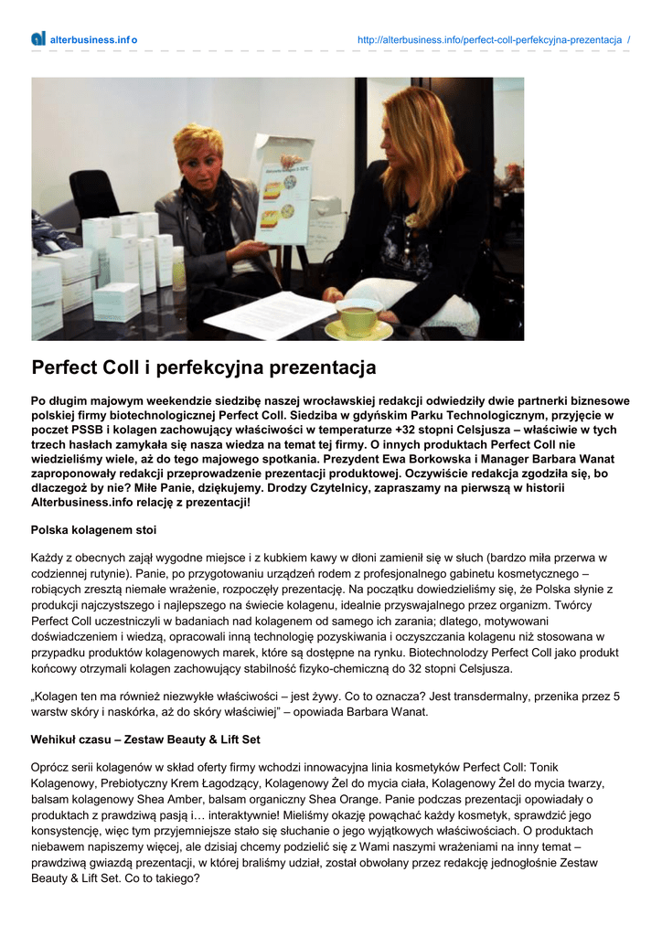 alterbusiness.inf o http://alterbusiness.info/perfect-coll-perfekcyjna-prezentacja / Perfect Coll i perfekcyjna prezentacja Po długim majowym weekendzie siedzibę naszej wrocławskiej redakcji odwiedziły dwie partnerki biznesowe polskiej firmy biotechnologicznej Perfect Coll. Siedziba w gdyńskim Parku Technologicznym, przyjęcie w poczet PSSB i kolagen zachowujący właściwości w temperaturze +32 stopni Celsjusza – właściwie w tych trzech hasłach zamykała się nasza wiedza na temat tej firmy. O innych produktach Perfect Coll nie wiedzieliśmy wiele, aż do tego majowego spotkania. Prezydent Ewa Borkowska i Manager Barbara Wanat zaproponowały redakcji przeprowadzenie prezentacji produktowej. Oczywiście redakcja zgodziła się, bo dlaczegoż by nie? Miłe Panie, dziękujemy. Drodzy Czytelnicy, zapraszamy na pierwszą w historii Alterbusiness.info relację z prezentacji! Polska kolagenem stoi Każdy z obecnych zajął wygodne miejsce i z kubkiem kawy w dłoni zamienił się w słuch (bardzo miła przerwa w codziennej rutynie). Panie, po przygotowaniu urządzeń rodem z profesjonalnego gabinetu kosmetycznego – robiących zresztą niemałe wrażenie, rozpoczęły prezentację. Na początku dowiedzieliśmy się, że Polska słynie z produkcji najczystszego i najlepszego na świecie kolagenu, idealnie przyswajalnego przez organizm. Twórcy Perfect Coll uczestniczyli w badaniach nad kolagenem od samego ich zarania; dlatego, motywowani doświadczeniem i wiedzą, opracowali inną technologię pozyskiwania i oczyszczania kolagenu niż stosowana w przypadku produktów kolagenowych marek, które są dostępne na rynku. Biotechnolodzy Perfect Coll jako produkt końcowy otrzymali kolagen zachowujący stabilność fizyko-chemiczną do 32 stopni Celsjusza. „Kolagen ten ma również niezwykłe właściwości – jest żywy. Co to oznacza? Jest transdermalny, przenika przez 5 warstw skóry i naskórka, aż do skóry właściwiej” – opowiada Barbara Wanat. Wehikuł czasu – Zestaw Beauty & Lift Set Oprócz serii kolagenów w skład oferty firmy wchodzi innowacyjna linia kosmetyków Perfect Coll: Tonik Kolagenowy, Prebiotyczny Krem Łagodzący, Kolagenowy Żel do mycia ciała, Kolagenowy Żel do mycia twarzy, balsam kolagenowy Shea Amber, balsam organiczny Shea Orange. Panie podczas prezentacji opowiadały o produktach z prawdziwą pasją i… interaktywnie! Mieliśmy okazję powąchać każdy kosmetyk, sprawdzić jego konsystencję, więc tym przyjemniejsze stało się słuchanie o jego wyjątkowych właściwościach. O produktach niebawem napiszemy więcej, ale dzisiaj chcemy podzielić się z Wami naszymi wrażeniami na inny temat – prawdziwą gwiazdą prezentacji, w której braliśmy udział, został obwołany przez redakcję jednogłośnie Zestaw Beauty & Lift Set. Co to takiego? Na zestaw składa się 7 urządzeń kosmetologicznych i 5 innowacyjnych kosmetyków. W maju zestaw został promocyjnie poszerzony o trzy kolageny: 200 ml Platynowy, 200 ml Srebrny, 200 ml Grafitowy o łącznej wartości katalogowej aż 1050 zł. Przenośnie urządzenia kosmetologiczne służą do poprawiania stanu skóry i, uwaga Drogie Czytelniczki – podróżowania w czasie. Regularnie stosowane cofną proces starzenia o nawet kilkanaście lat! Oto prawdziwy anty-aging. Co zawiera magiczne pudełko W zestawie Beauty & Lift Set znajdziemy urządzenie PC Thermo Lift. To zapewniające efekt liftingu bez użycia skalpela cudeńko, wykorzystujące technologię fal radiowych oraz elektrostymulację mięśni. Regularne stosowanie redukuje tkankę tłuszczową, redukuje zmarszczki oraz odmładza i ujędrnienia skórę. Każda zapracowana business women oraz pani domu z pewnością znajdzie czas na błyskawiczny zabieg – wystarczy przyłożyć głowicę urządzenia do wybranej partii ciała pokrytej PC Thermo Lift Gel (również w zestawie) i delikatnie ją masować. W Beauty & Lift Set znajdziemy również PC Face Lift 5 In 1 wyposażony w 5 zaawansowanych funkcji kosmetycznych: ultradźwięki, jontoforezę, galwanizację, masaż i światło spolaryzowane. To zaawansowane technologicznie urządzenie poprawia krążenie oraz metabolizm skóry, uruchamia procesy regeneracji tkanek i odbudowy struktury skóry, działa bakteriobójczo i dezynfekująco. Każdy z zabiegów kosmetycznopielęgnacyjnych przeprowadzamy tym urządzeniem odrobinę inaczej, ale żaden z nich nie jest skomplikowany – wystarczy postępować zgodnie z instrukcją obsługi, która jest dostępna na stronie www oraz dodana do zakupionego zestawu. Ziarnisty scrub w tubce? To przeżytek. W zestawie znajdziemy PC Skin Scrub, służący głównie do zabiegów oczyszczania cery poprzez peeling ultradźwiękowy. Jak działa? W wyniku wibracji ultradźwiękowej o wysokiej częstotliwości wzrasta metabolizm komórek, rozdrabniane są wszelkie zwapnienia, przyspieszone jest też krążenie krwi. Panie z pewnością docenią również odrobinę luksusu w postaci PC Face Gold 24 K. To proste w obsłudze urządzenie, które dzięki wibracjom stymuluje głębsze warstwy skóry, poprawiając ukrwienie, ujędrnienie i nadając jej elastyczność. Jak sama nazwa wskazuje, końcówka PC Face Gold została wykonana ze złota – to właśnie czyste jony tego cennego kruszcu zapewniają głębokie odżywienie i rozświetlenie skóry. Jeżeli interesuje Was odmłodzenie skóry w okolicach oczu (a z doświadczenia wiemy, że interesuje) w zestawie znajdziecie PC Eye Gold 24 K, nazywane „złotą kroplą”. Jak działa złota kropla? Podczas tarcia i podgrzania (w wyniku tarcia), urządzenie wydziela jony ujemne przenikające głębsze warstwy skóry. Jony wychwytują wolne jony dodatnie w organizmie ludzkim i neutralizują je. Przeciwdziałają wolnym rodnikom w komórkach, przywracają w organizmie równowagę oraz – pobudzając jony we krwi – usprawniają jej przepływ. W Beauty & Lift Set znajdziemy także alternatywę dla inwazyjnych i drogich zabie