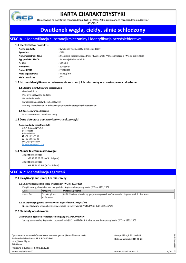 KARTA CHARAKTERYSTYKI Opracowana na podstawie rozporządzenia (WE) nr 1907/2006, zmienionego rozporządzeniem (WE) nr 453/2010 Dwutlenek węgla, ciekły, silnie schłodzony SEKCJA 1: Identyfikacja substancji/mieszaniny i identyfikacja przedsiębiorstwa 1.1 Identyfikator produktu: Nazwa produktu Synonimy Numer rejestracji REACH Typ produktu REACH Nr CAS Numer WE Numer RTECS Masa cząsteczkowa Wzór chemiczny : : : : : : : : : Dwutlenek węgla, ciekły, silnie schłodzony E290 Zwolnienie z rejestracji zgodnie z REACH, aneks IV (Rozporządzenie (WE) nr 1907/2006) Substancja/jeden składnik 124-38-9 204-696-9 FF6400000 44.01 g/mol CO2 1.2 Istotne zidentyfikowane zastosowania substancji lub mieszaniny oraz zastosowania odradzane: 1.2.1 Istotne zidentyfikowane zastosowania Gaz chłodniczy Przemysł spożywczy: dodatek Uzdatnianie wody Karbonizacja napojów bezalkoholowych Prosimy skontaktować się z dostawcą w przypadku szczególnych zastosowań 1.2.2 Zastosowania odradzane Brak zastosowania odradzane znany 1.3 Dane dotyczące dostawcy karty charakterystyki: Dostawca karty charakterystyki A.C.P. Belgium N.V./S.A. Dellestraat 5 B-3550 Zolder ☎ +32 13 53 03 03 +32 13 53 03 00 [email protected] http://www.acpco2.com 1.4 Numer telefonu alarmowego: 24 godziny na dobę: +32 13 53 03 03 (A.C.P. Belgium) 24 godziny na dobę: +48 79 51 15 949 (A.C.P. Poland) SEKCJA 2: Identyfikacja zagrożeń 2.1 Klasyfikacja substancji lub mieszaniny: 2.1.1 Klasyfikacja zgodnie z rozporządzeniem (WE) nr 1272/2008 Klasyfikowany jako niebezpieczny zgodnie z kryteriami rozporządzenia (WE) nr 1272/2008 Klasa Kategoria Oznaki zagrozenia Press. Gas Gaz skroplony H281: Zawiera schłodzony gaz; może spowodować oparzenia kriogeniczne lub obrażenia. schłodzony 2.1.2 Klasyfikacja zgodnie z dyrektywami 67/548/EWG i 1999/45/WE Nieklasyfikowany jako niebezpieczny zgodnie z dyrektywami 67/548/EWG i (lub) 1999/45/WE 2.2 Elementy oznakowania: Opracował: Brandweerinformatiecentrum voor gevaarlijke stoffen vzw (BIG) Technische Schoolstraat 43 A, B-2440 Geel http://www.big.be © BIG vzw Przyczyna aktualizacji: 2,3,8,9,11,12,15 Numer wydania: 0200 Data publikacji: 2012-07-11 Data aktualizacji: 2014-08-22 Numer produktu: 11310 1 / 11 134-15990-443-pl-PL Oznakowanie zgodnie z rozporządzeniem (WE) nr 1272/2008 (CLP) Sporządzono według kryteriów rozporządzenia (UE) nr 487/2013, 4. dostosowanie rozporządzenia (WE) nr 1272/2008 Dwutlenek węgla, ciekły, silnie schłodzony Hasło ostrzegawcze Zwroty H H281 Zwroty P P282 P336 P315 P403 Uwaga Zawiera schłodzony gaz; może spowodować oparzenia kriogeniczne lub obrażenia. Nosić rękawice izolujące od zimna/maski na twarz/ochronę oczu. Rozmrozić oszronione obszary letnią wodą. Nie trzeć oszronionego obszaru. Natychmiast zasięgnąć porady/zgłosić się pod opiekę lekarza. Przechowywać w dobrze wentylowanym miejscu. 2.3 Inne zagrożenia: CLP Pod wpływem ciepła:wzrost cionienia i ryzyko wybuchu zbiorn. Może spowodować odmrorzenia Duży wyciek/zamknięte pomieszczenie: ryzyko braku tlenu SEKCJA 3: Skład/informacja o składnikach 3.1 Substancje: Nazwa numer rejestracyjny REACH Nr CAS Nr WE Stężenie Klasyfikacja według (C) DSD/DPD Dwutlenek węgla, ciekły, silnie schłodzony 124-38-9 204-696-9 C>99 % Klasyfikacja według CLP Uwaga Press. Gas - Gaz skroplony (2)(1) schlodzony; H281 Komentarz Składnik pojedynczy (1) Pełna treść zwrotów R i H: patrz sekcja 16 (2) Substancja, dla której we Wspólnocie ustalono limit narażenia w miejscu pracy 3.2 Mieszaniny: Nie stosuje się SEKCJA 4: Środki pierwszej pomocy 4.1 Opis środków pierwszej pomocy: Ogólne: Sprawdzić funkcje życiowe. W przypadku utraty przytomności: odpowiednio utrzymywać swobodny przepływ powietrza przez drogi oddechowe i oddychanie u ofiary. Zatrzymanie oddychania: sztuczne oddychanie lub tlen. Zatrzymanie akcji serca: przeprowadzić resuscytację. Poszkodowany przytomny, utrudnione oddychanie: pozycja półsiedząca. Poszkodowany w szoku: na plecach, nogi nieco uniesione. Wymioty: zapobiegać utracie przytomności i aspiracyjnemu zapaleniu płuc. Zapobiegać wychłodzeniu przykrywając poszkodowanego (nie ogrzewać). Obserwować poszkodowanego. Udzielić pomocy psychologicznej. Poszkodowany powinien pozostawać w spokoju, unikać wysiłku fizycznego. Zależnie od stanu poszkodowanego: lekarz/szpital. Wdychanie: Przenieść ofiarę na swieże powietrze. Przy problemach z oddychaniem: zasięgnąć porady lekarza/służ. Po kontakcie ze skórą: Spłukać wodą. Udać się z ofiarą do lekarza, gdy podrażnienie utrzymuje się. Przy ranach w wyniku odmrożenia: Natychmiast zmyć dużą ilością wody (15 min.) /prysznic. Nie stosować (chemicznych) orodków neutralizacyjnych. Zdjąć ubranie podczas mycia. Jeoli ubranie jest przylepione do skóry: nie odrywać. Rany zabezpieczyć sterylnie. Zasięgnąć porady lekarza/służby zdrowia. Jeoli powierzchnia popażona> 10% - zabrać ofiarę do szpitala. Po kontakcie z oczami: Przemywać natychmiast dużą ilością wody przez 15 minut. Nie stosować środków neutralizujących. Oczy zabezpieczyć sterylnie. Zabrać ofiarę do okulisty. W przypadku spożycia: Nie stosuje się. 4.2 Najważniejsze ostre i opóźnione objawy oraz skutki narażenia: 4.2.1 Objawy ostre Wdychanie: PRZY WPŁYWIE DUŻYCH STĘŻEŃ: Przyspieszone oddychanie. Przyspieszona akcja serca. Ból głowy. Nudności. Zawroty głowy. Wilgotna/lepka skóra. Stan podniecenia/nerwowości. Zaburzenia wzroku. DŽwięczenie w uszach. Problemy z oddychaniem. Zaburzenia przytomności. Skurcze/niekontrolowany przykurcz mięśni. Po kontakcie ze skórą: Odmrożenia. Po kontakcie z oczami: Odmrożenia. Przyczyna aktualizacji: 2,3,8,9,11,12,15 Data publikacji: 2012-07-11 Data aktualizacji: 2014-08-22 Numer wydania: 0200 Numer produktu: 11310 2 / 11 Dwutlenek węgla, ciekły, silnie schłodzony W przypadku spożycia: Efekty nieznane. 4.2.2 Objawy opóźnione Efekty nieznane. 4.3 Wskazania dotycz