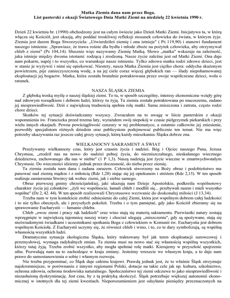 Matka Ziemia dana nam przez Boga. List pasterski z okazji Światowego Dnia Matki Ziemi na niedzielę 22 kwietnia 1990 r. Dzień 22 kwietnia br. (1990) obchodzony jest na całym świecie jako Dzień Matki Ziemi. Inicjatywa ta, w którą włącza się Kościół, jest okazją, aby poddać troskliwej refleksji stosunek człowieka do świata, w którym żyje. Ziemia jest darem Boga Stworzyciela: „Utwierdziłeś ziemię i ona istnieje" ( PS 119,90) i stanowi fundament naszego istnienia: „Sprawiasz, że trawa rośnie dla bydła i młode zboże na pożytek człowieka, aby otrzymywał chleb z ziemi" (Ps 104,14). Słusznie więc nazywamy Ziemię Matką. Słowo „matka" wskazuje na zależność, jaka istnieje między dwoma istotami: rodzącą i zrodzoną. Nasze życie zależne jest od Matki Ziemi. Ona daje nam pokarm, napój i to wszystko, co warunkuje nasze istnienie. Tylko zdrowa matka rodzi zdrowe dzieci, jest w stanie je wyżywić i nimi się opiekować. Niestety, nasza Matka Ziemia jest ciężko chora: oddycha skażonym powietrzem, pije zanieczyszczoną wodę, a na jej ciele coraz więcej głębokich ran — ślady niepohamowanej eksploatacji jej bogactw. Matka, która została brutalnie potraktowana przez swoje współczesne dzieci, woła o ratunek. NASZA ŚLĄSKA ZIEMIA Z głęboką troską myślę o naszej śląskiej ziemi. To tu, w sposób szczególny, interesy ekonomiczne wzięły górę nad zdrowym rozsądkiem i dobrem ludzi, którzy tu żyją. Ta ziemia została potraktowana po macoszemu, zadano jej niesprawiedliwość. Dziś z największą trudnością spełnia rolę matki. Sama zniszczona i zatruta, często rodzi chore dzieci. Skutków tej sytuacji doświadczamy wszyscy. Zwracałem na to uwagę w liście pasterskim z okazji wspomnienia św. Franciszka przed trzema laty, wyrażałem swój niepokój w czasie pielgrzymek piekarskich i przy wielu innych okazjach. Pewna powściągliwość cenzury w tej problematyce, a ostatnio całkowite jej zniesienie, pozwoliły specjalistom różnych dziedzin oraz publicystom podejmować publicznie ten temat. Nie ma więc potrzeby ukazywania raz jeszcze całej grozy sytuacji, którą każdy mieszkaniec Śląska dobrze zna. WIELKANOCNY SAKRAMENT A ŚWIAT Przeżywamy wielkanocny czas, który jest czasem życia i nadziei. Bóg i Ojciec naszego Pana, Jezusa Chrystusa, „zrodził nas na nowo do nadziei pełnej życia, do niezniszczalnego, nieskalanego wiecznego dziedzictwa, zachowanego dla nas w niebie" (1 P 1,3). Naszą nadzieją jest życie wieczne w zmartwychwstałym Chrystusie. Do wieczności idziemy jednak przez doczesność, do nieba przez ziemię. Ta ziemia została nam dana i zadana zarazem. Człowiek stworzony na Boży obraz i podobieństwo ma panować nad ziemią mądrze i z miłością (Rdz 1,28) stając się jej opiekunem i stróżem (Rdz 2,15). W ten sposób realizuje zamierzenia Stwórcy tak wobec ziemi, jak i siebie samego. Obraz pierwszej gminy chrześcijańskiej, jaki ukazują nam Dzieje Apostolskie, podkreśla wspólnotowy charakter życia jej członków: „żyli we wspólnocie, łamali chleb i modlili się... przebywali razem i mieli wszystko wspólne" (Dz 2, 42. 44). W ten sposób realizowali Chrystusowe wezwanie do doskonałej miłości (J 13,34). Trzeba nam w tym kontekście zrobić odniesienie do całej Ziemi, która jest wspólnym dobrem całej ludzkości i to nie tylko obecnych, ale i przyszłych pokoleń. Trzeba i o tym pamiętać, gdy jako Kościół zbieramy się na sprawowanie Eucharystii — łamanie chleba. Chleb „owoc ziemi i pracy rąk ludzkich" oraz wino stają się materią sakramentu. Pierwiastki natury zostają wprzęgnięte w największą tajemnicę naszej wiary i chociaż ulegają „zniszczeniu", gdy są spożywane, stają się nieświadomymi świadkami i uczestnikami spotkania Boga z człowiekiem w Komunii św. Eucharystia jest dobrem wspólnym Kościoła. Z Eucharystii uczymy się, że również chleb i wino, i to, co te dary symbolizują, są wspólną własnością wszystkich ludzi. Dramatyczna sytuacja ekologiczna Śląska, który traktowany był jak teren eksploatacji surowcowej i przemysłowej, wymaga radykalnych zmian. Ta ziemia musi na nowo stać się własnością wspólną wszystkich, którzy tutaj żyją. Trzeba zrobić wszystko, aby mogła spełniać rolę matki. Kierujemy w przyszłość spojrzenie ufne. Pozwalają nam na to zachodzące w kraju zmiany. Jesteśmy wreszcie we własnym kraju, a to daje nam prawo do samostanowienia o sobie i własnym rozwoju. Nie trzeba przypominać, co Śląsk daje całemu krajowi. Prawdą jednak jest, że to właśnie Śląsk otrzymuje najskromniejsze, w porównaniu z innymi regionami Polski, dotacje na takie cele jak np. kultura, szkolnictwo, ochrona zdrowia, ochrona środowiska naturalnego. Społeczeństwo tej ziemi odczuwa to jako niesprawiedliwość i niezasłużoną dyskryminację. Jest czas, by z tą praktyką skończyć. Śląsk potrzebuje większej autonomii ekonomicznej w istotnych dla tej ziemi kwestiach. Nieporozumieniem jest odsyłanie pieniędzy przeznaczonych na ochronę środowiska do budżetu centralnego, podczas gdy tu ledwo żyjemy w tragicznych warunkach ekologicznych. Przy ogromnym deficycie wody musi budzić zdumienie decyzja o wstrzymaniu dotacji na budowę zbiornika wody pitnej dla Śląska. W wielu zakładach przemysłowych stosuje się przestarzałe technologie. Nie można zamknąć wszystkich zakładów pracy. Potrzebne są produkty, a ludzie muszą mieć pracę. Konieczne jednak jest wprowadzanie nowych technologii i na to winno wykorzystać się pomoc z zagranicy. Najbardziej przestarzałe i trujące zakłady muszą ulec likwidacji. Niech o tym zadecydują ludzie kompetentni i odpowiedzialni. Nadszedł czas prawdy i sprawiedliwości. Prawdę będziemy zdecydowanie artykułować, a sprawiedliwości dla tej ziemi się domagać. Nie chodzi o uprzywilejowane traktowanie Śląska ani o jałmużnę, ale o realizację elementarnych zasad spraw