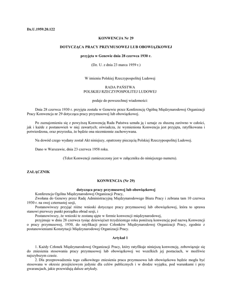Dz.U.1959.20.122 KONWENCJA Nr 29 DOTYCZĄCA PRACY PRZYMUSOWEJ LUB OBOWIĄZKOWEJ przyjęta w Genewie dnia 28 czerwca 1930 r. (Dz. U. z dnia 23 marca 1959 r.) W imieniu Polskiej Rzeczypospolitej Ludowej RADA PAŃSTWA POLSKIEJ RZECZYPOSPOLITEJ LUDOWEJ podaje do powszechnej wiadomości: Dnia 28 czerwca 1930 r. przyjęta została w Genewie przez Konferencję Ogólną Międzynarodowej Organizacji Pracy Konwencja nr 29 dotycząca pracy przymusowej lub obowiązkowej. Po zaznajomieniu się z powyższą Konwencją Rada Państwa uznała ją i uznaje za słuszną zarówno w całości, jak i każde z postanowień w niej zawartych; oświadcza, że wymieniona Konwencja jest przyjęta, ratyfikowana i potwierdzona, oraz przyrzeka, że będzie ona niezmiennie zachowywana. Na dowód czego wydany został Akt niniejszy, opatrzony pieczęcią Polskiej Rzeczypospolitej Ludowej. Dano w Warszawie, dnia 23 czerwca 1958 roku. (Tekst Konwencji zamieszczony jest w załączniku do niniejszego numeru). ZAŁĄCZNIK KONWENCJA (Nr 29) dotycząca pracy przymusowej lub obowiązkowej Konferencja Ogólna Międzynarodowej Organizacji Pracy, Zwołana do Genewy przez Radę Administracyjną Międzynarodowego Biura Pracy i zebrana tam 10 czerwca 1930 r. na swej czternastej sesji, Postanowiwszy przyjąć różne wnioski dotyczące pracy przymusowej lub obowiązkowej, która to sprawa stanowi pierwszy punkt porządku obrad sesji, i Postanowiwszy, że wnioski te zostaną ujęte w formie konwencji międzynarodowej, przyjmuje w dniu 28 czerwca tysiąc dziewięćset trzydziestego roku poniższą konwencję pod nazwą Konwencji o pracy przymusowej, 1930, do ratyfikacji przez Członków Międzynarodowej Organizacji Pracy, zgodnie z postanowieniami Konstytucji Międzynarodowej Organizacji Pracy. Artykuł 1 1. Każdy Członek Międzynarodowej Organizacji Pracy, który ratyfikuje niniejszą konwencję, zobowiązuje się do zniesienia stosowania pracy przymusowej lub obowiązkowej we wszelkich jej postaciach, w możliwie najszybszym czasie. 2. Dla przeprowadzenia tego całkowitego zniesienia praca przymusowa lub obowiązkowa będzie mogła być stosowana w okresie przejściowym jedynie dla celów publicznych i w drodze wyjątku, pod warunkami i przy gwarancjach, jakie przewidują dalsze artykuły. 3. Po upływie pięcioletniego okresu od chwili wejścia w życie niniejszej konwencji i przy okazji sprawozdania, przewidzianego poniżej w artykule 31, Rada Administracyjna Międzynarodowego Biura Pracy zbada możliwość zniesienia bez dalszego okresu przejściowego pracy przymusowej lub obowiązkowej we wszelkich jej postaciach i zdecyduje, czy należy wnieść tę sprawę na porządek obrad Konferencji. Artykuł 2 1. Dla celów niniejszej konwencji wyrażenie "praca przymusowa lub obowiązkowa" oznaczać będzie wszelką pracę lub usługi wymagane od jakiejś osoby pod groźbą jakiejkolwiek kary i do których dana osoba nie zgłosiła się dobrowolnie. 2. Wyrażenie "praca przymusowa lub obowiązkowa" nie obejmuje jednakże, w rozumieniu niniejszej konwencji: a) wszelkiej pracy lub usług wymaganych w myśl ustaw o obowiązkowej służbie wojskowej i poświęconych pracom o charakterze czysto wojskowym; b) wszelkiej pracy lub usług wchodzących w zakres normalnych obowiązków obywatelskich w krajach rządzących się całkowicie samodzielnie; c) wszelkiej pracy lub usług wymaganych od jakiejś osoby w wyniku skazania jej przez władzę sądową pod warunkiem, że ta praca lub te usługi będą wykonywane pod nadzorem i kontrolą władz publicznych i że ta osoba nie będzie najęta lub oddana do rozporządzenia jednostkom, prywatnym spółkom lub stowarzyszeniom; d) wszelkiej pracy lub usług wymaganych w wypadkach siły wyższej, to znaczy w razie wojny, klęsk lub groźby klęsk takich, jak pożary, powodzie, głód, trzęsienia ziemi, gwałtowne epidemie i choroby bydła, najścia zwierząt, owadów lub szkodliwych pasożytów roślinnych i w ogóle wszelkich okoliczności stanowiących niebezpieczeństwo lub ryzyko niebezpieczeństwa dla życia lub normalnych warunków egzystencji ogółu lub pewnej części ludności; e) drobnych robót wiejskich, to znaczy robót wykonywanych w bezpośrednim interesie ogółu przez członków tego ogółu, robót, które z tego tytułu mogą być uznane za normalne obowiązki obywatelskie, obowiązujące członków społeczności, pod warunkiem, że sama ludność lub jej bezpośredni przedstawiciele będą mieli prawo wypowiadania się co do celowości tych robót. Artykuł 3 Dla celów niniejszej konwencji wyrażenie "właściwe władze" oznaczać będzie bądź władze metropolitarne, bądź wyższe władze centralne zainteresowanego terytorium. Artykuł 4 1. Właściwa władza nie powinna nakazywać lub zezwolić na nakazywanie pracy przymusowej lub obowiązkowej na korzyść jednostek, spółek lub stowarzyszeń prywatnych. 2. Jeżeli taka forma pracy przymusowej lub obowiązkowej na korzyść jednostek spółek lub stowarzyszeń prywatnych istnieje w chwili, gdy ratyfikacja niniejszej konwencji przez jakiegoś Członka została zarejestrowana przez Dyrektora Generalnego Międzynarodowego Biura Pracy. Członek ten powinien całkowicie znieść tę pracę przymusową lub obowiązkową od daty wejścia dlań w życie niniejszej konwencji. Artykuł 5 1. Żadna koncesja udzielona jednostkom, spółkom lub stowarzyszeniom prywatnym nie będzie mogła pociągnąć za sobą nakazywania jakiejkolwiek formy pracy przymusowej lub obowiązkowej w celu wytwarzania lub zbierania produktów, jakich te jednostki, spółki lub stowarzyszenia prywatne używają lub którymi handlują. 2. Jeżeli istniejące koncesje zawierające postanowienia pociągające za sobą taką pracę przymusową lub obowiązkową, postanowienia te powinny być możliwie najszybciej unieważnione celem dostosowania się do przepisów artykułu pierwszego niniejszej konwencji. Artykuł 6 Urzędnicy administracji, nawet gdy będą mieli