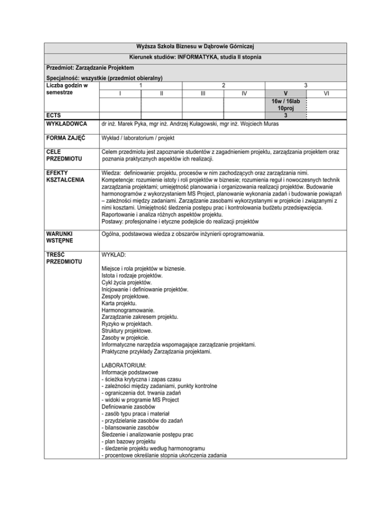 WyŜsza Szkoła Biznesu w Dąbrowie Górniczej Kierunek studiów: INFORMATYKA, studia II stopnia Przedmiot: Zarządzanie Projektem Specjalność: wszystkie (przedmiot obieralny) Liczba godzin w 1 semestrze I II 2 III 3 IV ECTS WYKŁADOWCA V 16w / 16lab 10proj 3 dr inŜ. Marek Pyka, mgr inŜ. Andrzej Kułagowski, mgr inŜ. Wojciech Muras FORMA ZAJĘĆ Wykład / laboratorium / projekt CELE PRZEDMIOTU Celem przedmiotu jest zapoznanie studentów z zagadnieniem projektu, zarządzania projektem oraz poznania praktycznych aspektów ich realizacji. EFEKTY KSZTAŁCENIA Wiedza: definiowanie: projektu, procesów w nim zachodzących oraz zarządzania nimi. Kompetencje: rozumienie istoty i roli projektów w biznesie; rozumienia reguł i nowoczesnych technik zarządzania projektami; umiejętność planowania i organizowania realizacji projektów. Budowanie harmonogramów z wykorzystaniem MS Project, planowanie wykonania zadań i budowanie powiązań – zaleŜności między zadaniami. Zarządzanie zasobami wykorzystanymi w projekcie i związanymi z nimi kosztami. Umiejętność śledzenia postępu prac i kontrolowania budŜetu przedsięwzięcia. Raportowanie i analiza róŜnych aspektów projektu. Postawy: profesjonalne i etyczne podejście do realizacji projektów WARUNKI WSTĘPNE Ogólna, podstawowa wiedza z obszarów inŜynierii oprogramowania. TREŚĆ PRZEDMIOTU WYKŁAD: Miejsce i rola projektów w biznesie. Istota i rodzaje projektów. Cykl Ŝycia projektów. Inicjowanie i definiowanie projektów. Zespoły projektowe. Karta projektu. Harmonogramowanie. Zarządzanie zakresem projektu. Ryzyko w projektach. Struktury projektowe. Zasoby w projekcie. Informatyczne narzędzia wspomagające zarządzanie projektami. Praktyczne przykłady Zarządzania projektami. LABORATORIUM: Informacje podstawowe - ścieŜka krytyczna i zapas czasu - zaleŜności między zadaniami, punkty kontrolne - ograniczenia dot. trwania zadań - widoki w programie MS Project Definiowanie zasobów - zasób typu praca i materiał - przydzielanie zasobów do zadań - bilansowanie zasobów Śledzenie i analizowanie postępu prac - plan bazowy projektu - śledzenie projektu według harmonogramu - procentowe określanie stopnia ukończenia zadania VI - rzeczywiste wartości rozpoczęcia, zakończenia i czasu trwania - przeglądanie i raportowanie stanu projektu LITERATURA OBOWIĄZKOWA LITERATURA UZUPEŁNIAJĄCA METODY NAUCZANIA POMOCE NAUKOWE PRZYKŁADOWE TEMATY PROJEKTÓW SPOSÓB I WARUNKI ZALICZENIA PRZEDMIOTU PYTANIA EGZAMINU/ ZALICZENIA “A Guide to the Project Management Body of Knowledge”, Project Management Institute, Newtown Square, 2008. Caupin G. (red.), “ICB – IPMA Competence Baseline”, International Project Management Association, Nijkerk, Netherlands 2006. Office of Government Commerce (OGC), “Managing Successful Projects with PRINCE2”, TSO (The Stationery Office), 2005 Sebastian Wilczewski, 2008, “MS Project 2007 i MS Project Server 2007. Efektywne zarządzanie projektami”, Helion, ISBN: 978-83-246-1212-3 Goldratt E. M. “Critical Chain“, The North River Press Publishing Corporation, Great Barrington, USA 1997. Kerzner H. “Advanced Project Management. Edycja Polska”, OnePress, Gliwice, 2005. Scott B., “The Art of Project Management”, O’Reilly Media, Inc, New York 2005. Spałek S., “Krytyczne czynniki sukcesu w Zarządzaniu Projektami” Wydawnictwo Politechniki Śląskiej, Gliwice 2004. US Def. Dept. - MIL-STD-881A Verma V. K., “Organizing Projects for Success“, Project Management Institute, Newtown Square, 1995. Wysocki R., McGary R. “Efektywne zarządzanie projektami”, OnePress, Gliwice 2005 Wykład z Zarządzania Projektami z wybranymi elementy warsztatu projektowego. Ćwiczenia indywidualne z uŜyciem komputerów poprzedzone omówieniem zagadnienia z wykorzystaniem przykładów i prezentacji multimedialnych. Komputer PC, rzutnik multimedialny, materiały dydaktyczne. „Przeprowadzenie <<letniej akcji nauki języka obcego>>” „Organizacja wyjazdu turystycznego do Francji” „ZałoŜenie firmy transportowej” „ZałoŜenie sklepu on-line” „Wykonanie oprogramowanie na zamówienie klienta” Aktywne uczestnictwo podczas zajęć wykładowych oraz wykonanie wybranych elementów warsztatowych 1. Projektem nazywamy: a/ tymczasowy wysiłek podjęty w celu realizacji konkretnego produktu lub usługi (POPRAWNA ODDPOWIEDŹ) b/ ciągły powtarzalny proces w przedsiębiorstwie 2. Skrót WBS oznacza: a/ Wide Business Structure – Strukturę organizacyjną w przedsiębiorstwie realizującym projekty b/ Work Breakdown Structure – Strukturę podziału pracy, uŜywaną w celu przedstawienia czynności wykonywanych w Projekcie. (POPRAWNA ODDPOWIEDŹ) 3 „Potrójne ograniczenia” w Projekcie odnoszą się do: a/ czasu, zakresu i kosztów projektu. (POPRAWNA ODDPOWIEDŹ) b/ struktur organizacyjnych, sponsora projektu i wykonawców 4. Wykres Gantta to: a/ graficzne przedstawienie czynności wykonywanych w czasie. (POPRAWNA ODDPOWIEDŹ) b/ narzędzie do planowania kosztów 5. Skrót CPM oznacza: a/ Critical Path Method – Metodę ŚcieŜki Krytyczne. (POPRAWNA ODDPOWIEDŹ) b/ Cycle Project Methodology – Metodologię Cyklicznych Projektów LABORATORIUM: 1. Wykres Gantta a) pokazuje pełną ścieŜkę zaleŜności przyczynowo-skutkowych między czynnościami lub zdarzeniami b) pokazuje skutek wczesnego lub późnego rozpoczęcia czynności c) uwzględnia stopień niepewności związany z realizacją czynności d*)jest najprostszą i najpopularniejszą metodą prezentacji harmonogramu i postępu prac 2. ŚcieŜka krytyczna wyznaczana jest w oparciu o a)czasy normalne trwania czynności b*)czasy graniczne trwania czynności c) koszty normalne wykonania czynności d) koszty graniczne wykonania czynności 3. Do zbudowania sieci czynności w metodach PERT/CPM nie potrzeba a) zaleŜności przyczyna-skutek pomiędzy zadaniami b) określonego lub oszacowanego czasu trwania zadań c*)struktury 
