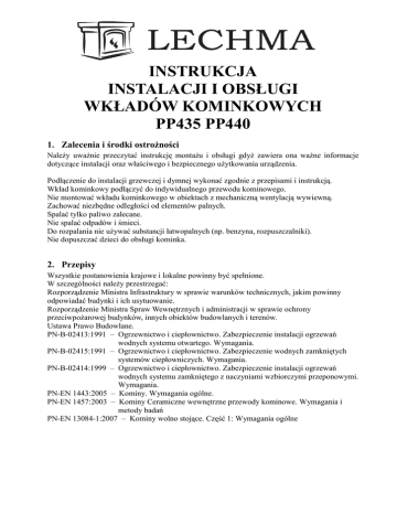 INSTRUKCJA INSTALACJI I OBSŁUGI WKŁADÓW KOMINKOWYCH PP435 PP440 1. Zalecenia i środki ostrożności Należy uważnie przeczytać instrukcję montażu i obsługi gdyż zawiera ona ważne informacje dotyczące instalacji oraz właściwego i bezpiecznego użytkowania urządzenia. Podłączenie do instalacji grzewczej i dymnej wykonać zgodnie z przepisami i instrukcją. Wkład kominkowy podłączyć do indywidualnego przewodu kominowego. Nie montować wkładu kominkowego w obiektach z mechaniczną wentylacją wywiewną. Zachować niezbędne odległości od elementów palnych. Spalać tylko paliwo zalecane. Nie spalać odpadów i śmieci. Do rozpalania nie używać substancji łatwopalnych (np. benzyna, rozpuszczalniki). Nie dopuszczać dzieci do obsługi kominka. 2. Przepisy Wszystkie postanowienia krajowe i lokalne powinny być spełnione. W szczególności należy przestrzegać: Rozporządzenie Ministra Infrastruktury w sprawie warunków technicznych, jakim powinny odpowiadać budynki i ich usytuowanie. Rozporządzenie Ministra Spraw Wewnętrznych i administracji w sprawie ochrony przeciwpożarowej budynków, innych obiektów budowlanych i terenów. Ustawa Prawo Budowlane. PN-B-02413:1991 – Ogrzewnictwo i ciepłownictwo. Zabezpieczenie instalacji ogrzewań wodnych systemu otwartego. Wymagania. PN-B-02415:1991 – Ogrzewnictwo i ciepłownictwo. Zabezpieczenie wodnych zamkniętych systemów ciepłowniczych. Wymagania. PN-B-02414:1999 – Ogrzewnictwo i ciepłownictwo. Zabezpieczenie instalacji ogrzewań wodnych systemu zamkniętego z naczyniami wzbiorczymi przeponowymi. Wymagania. PN-EN 1443:2005 – Kominy. Wymagania ogólne. PN-EN 1457:2003 – Kominy Ceramiczne wewnętrzne przewody kominowe. Wymagania i metody badań PN-EN 13084-1:2007 – Kominy wolno stojące. Część 1: Wymagania ogólne 3. Wersje wkładu kominkowego PP 435 PP 440 INSTALACJA 4. Ustawienie wkładu kominkowego Należy wybrać takie miejsce, aby odległość kominka od palnych części budynku i elementów wyposażenia wynosiła nie mniej niż 120cm. Urządzenie powinno być umieszczone na podłożu niepalnym o grubości co najmniej 15cm. Podłoże musi mieć wystarczającą nośność aby przenieść obciążenie wnoszone przez kominek (z wodą) oraz obudowę. Podłoga wokół wkładu kominkowego z materiału łatwo zapalnego powinna być zabezpieczona pasem materiału niepalnego o szerokości co najmniej 50cm poza krawędzie zewnętrzne urządzenia. Wkład kominkowy nie jest przewidziany do wbudowania w istniejącą obudowę (przeróbka istniejącego kominka z otwartym paleniskiem). Jeśli wkład kominkowy instalowany jest we wnęce to jej minimalne wymiary powinny wynosić: szerokość 55cm, głębokości 85cm i wysokości 250cm. Takie wymiary pozwalają na zachowanie wzdłuż wszystkich zewnętrzny ścianek kominka wymaganej przestrzeni do konwekcyjnego opływu powietrza o szerokości nie mniejszej niż 5cm oraz ułożenie na ścianach wnęki izolacji termicznej. W przypadku takiej zabudowy należy pamiętać o zapewnieniu dostępu do elementów wymienionych w punkcie Obudowa. Kominek należy wypoziomować. Należy ustawić kominek odpowiednio do projektowanej obudowy, gdyż po jego podłączeniu do instalacji przestawienie kominka będzie niemożliwe (lub poważnie ograniczone). 5. Komin Dla prawidłowej pracy wkładu kominkowego wymagane jest podciśnienie w przewodzie kominowym 12Pa. Przy innej wartości podciśnienia parametry urządzenia deklarowane przez producenta mogą nie być spełnione. Minimalna wartość podciśnienia wymagana dla bezpiecznej pracy wkładu kominowego to 6Pa. Podciśnienie powyżej 15Pa spowoduje szybsze spalanie, zwiększenie straty kominowej i spadek sprawności urządzenia. Wkład kominkowy musi być podłączony do indywidualnego przewodu kominowego. Pole przekroju wewnętrznego przewodu kominowego nie może być mniejsze do przekroju czopucha wkładu kominkowego. Łącznik odprowadzający spaliny z czopucha wkładu kominkowego powinien byś wprowadzony do komina pod kątem 45°. Połączenia elementów przewodu spalinowego powinny być wykonane w sposób umożliwiający spływanie wykroplonego kondensatu po wewnętrznych ścianach do paleniska. Komin musi zapewnić bezpieczeństwo przy maksymalnej temperaturze spalin. Na przewodzie odprowadzającym spaliny nie należy montować przepustnicy. 6. Doprowadzenie powietrza Podczas spalania kominek zużywa ok. 50m3 powietrza na godzinę. Jest ono pobierane jest jednym z dwóch otworów w tylnej części cokołu wkładu kominkowego. Takie rozwiązanie umożliwia czerpanie powietrza do spalania z zewnątrz budynku, szczególnie przydatne w nowych, dobrze izolowanych budynkach, w których wyeliminowano wszelkie nieszczelności. Jeden z tych otworów należy zamknąć maskownicą, a do drugiego przykręcić króciec i połączyć go z okrągłym kanałem (giętkim). Wlot do tego kanału należy zabezpieczyć kratką przed owadami, ptakami i gryzoniami. Na wylocie można zainstalować żaluzję, zabezpieczoną przed niekontrolowanym zamknięciem, zamykaną w czasie przerw w pracy kominka. 7. Obudowa Ogólne wskazówki i zalecenia dotyczące wykonania obudowy wkładu kominkowego. Wszystkie użyte materiały muszą być niepalne oraz odporne na działanie wysokich temperatur. Dotyczy to zarówno płyt lub innych materiałów konstrukcyjnych jak i klejów, łączników czy taśmy uszczelniającej. Pomiędzy korpusem wkładu kominkowego a wewnętrznymi ścianami obudowy musi pozostać wolna przestrzeń o szerokości nie mniejszej niż 5cm, zapewniająca swobodny przepływ powietrza wokół wszystkich elementów kominka. Obudowa musi posiadać otwór (otwory) wlotowy i wylotowy umożliwiające ten przepływ. Otwór wlotowy powinien być poniżej poziomu paleniska, a otwór wylotowy powyżej podłączenia do komina. Otwór wlotowy jak i wylotowy musi mieć pole przekroju co najmniej 700cm2. Otwory te mogą być osłonięte ozdobną kratką lec